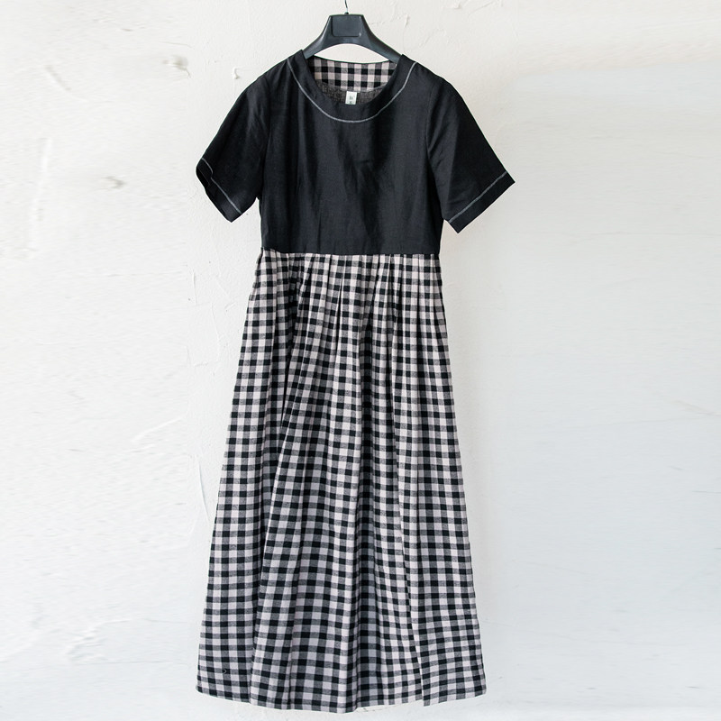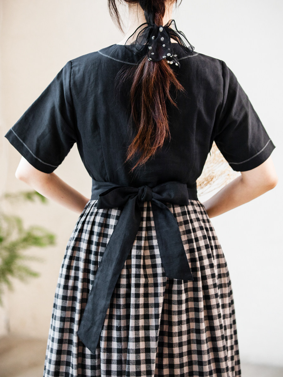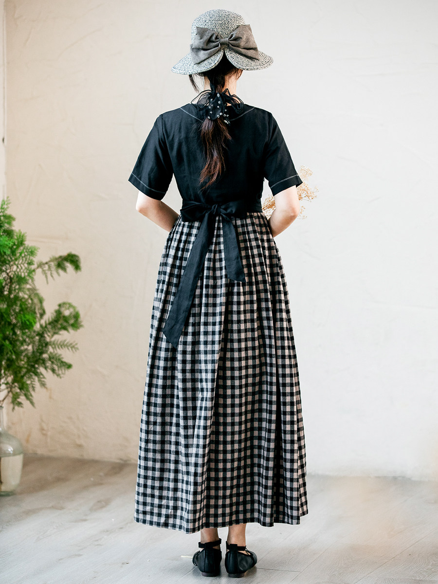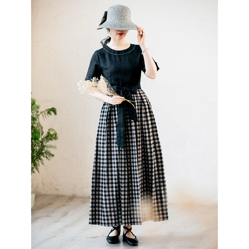 仙衣裾设计师黑色连衣裙圆领系带格子拼接显瘦长裙小个子夏新款女