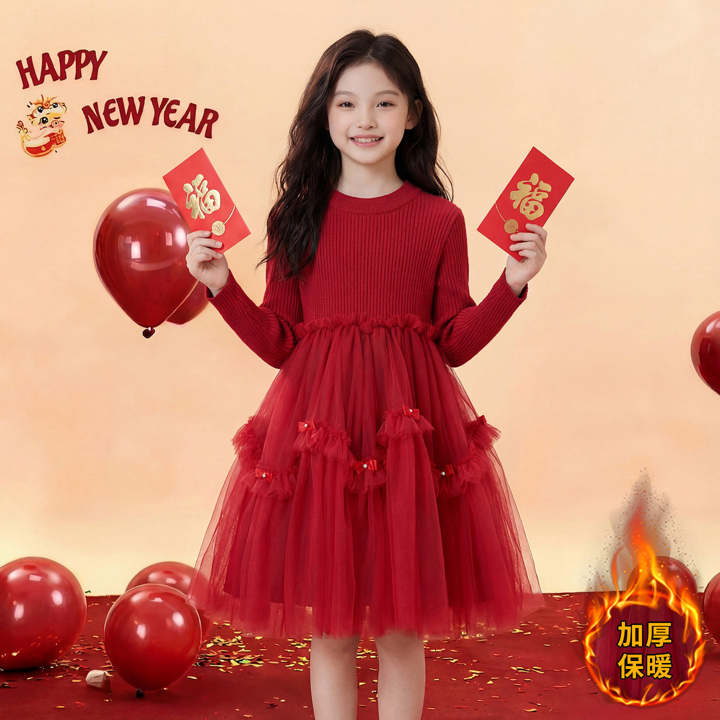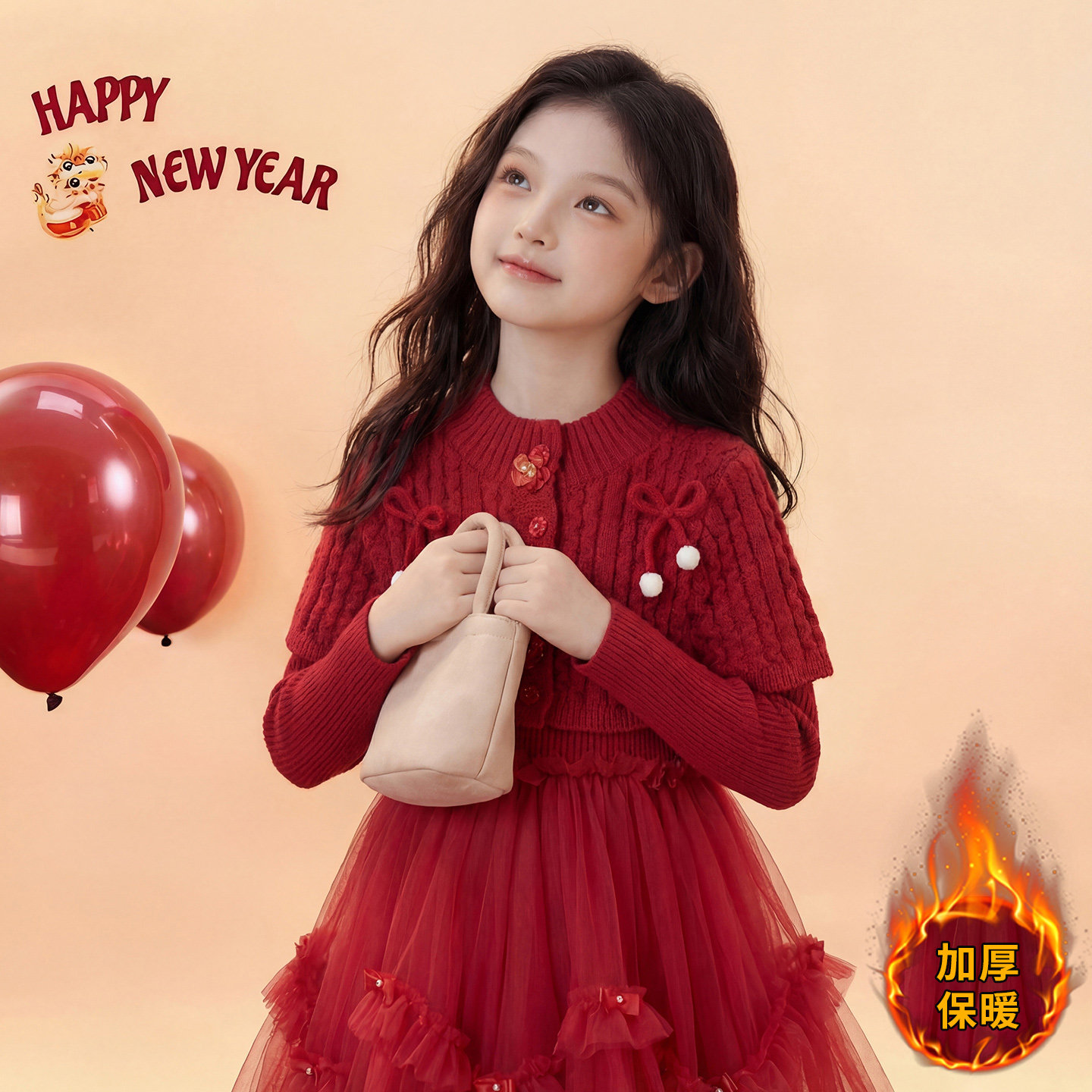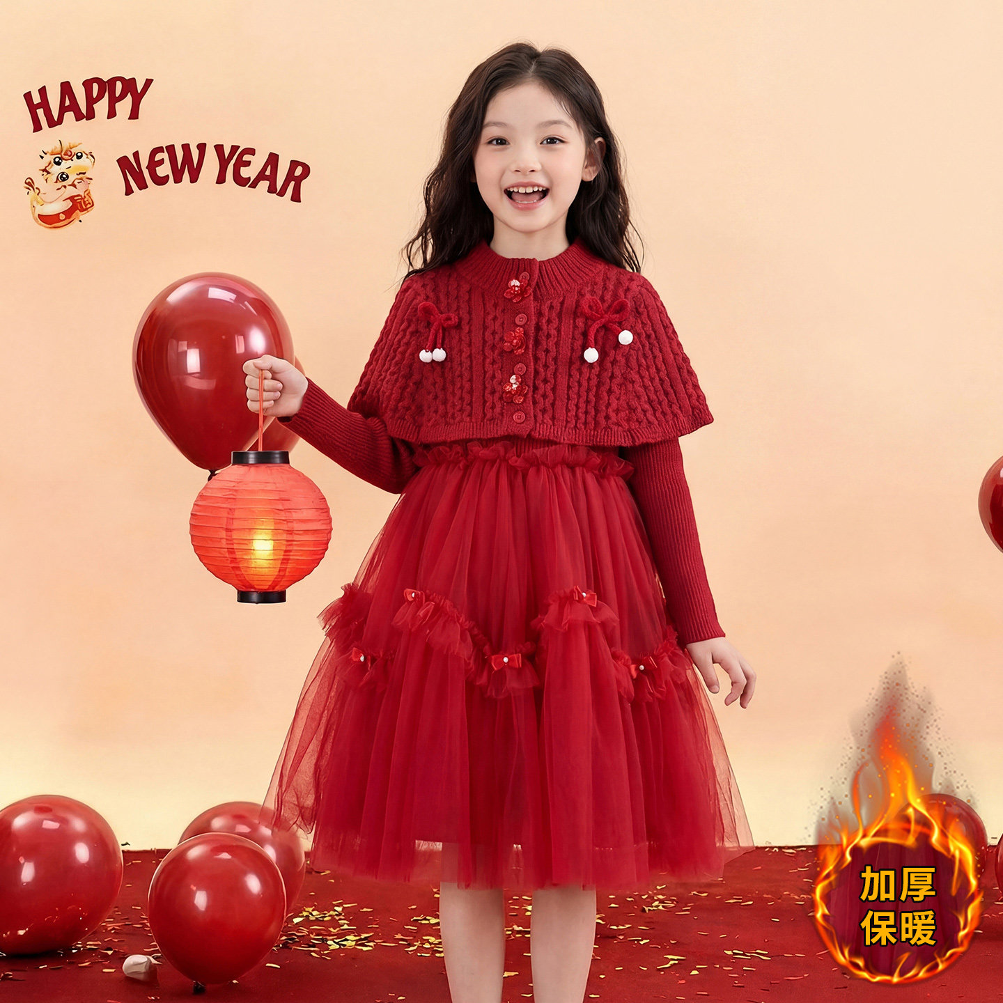 女童红色公主裙冬装2026新款儿童韩版针织披肩网纱连衣裙两件套裙