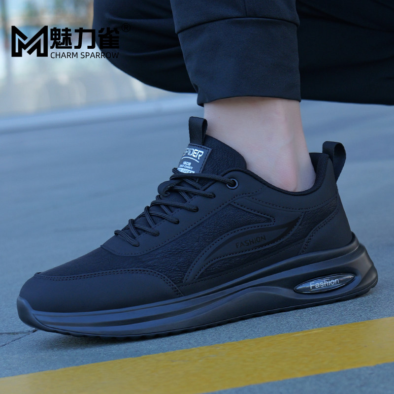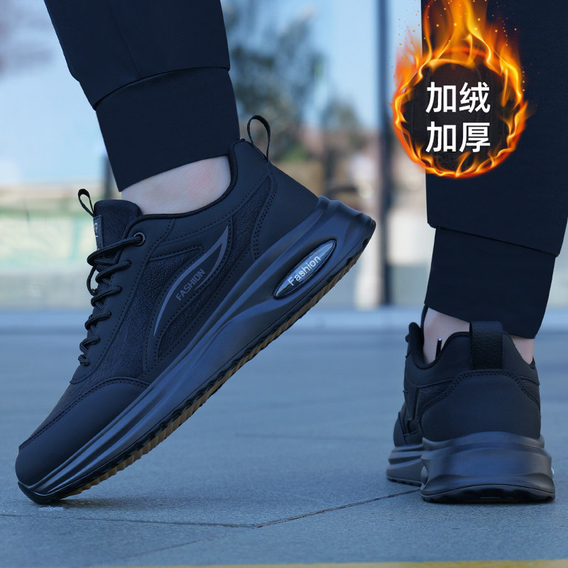 男鞋冬季2025新款潮鞋皮面运动鞋男士休闲百搭透气黑色工作鞋子男