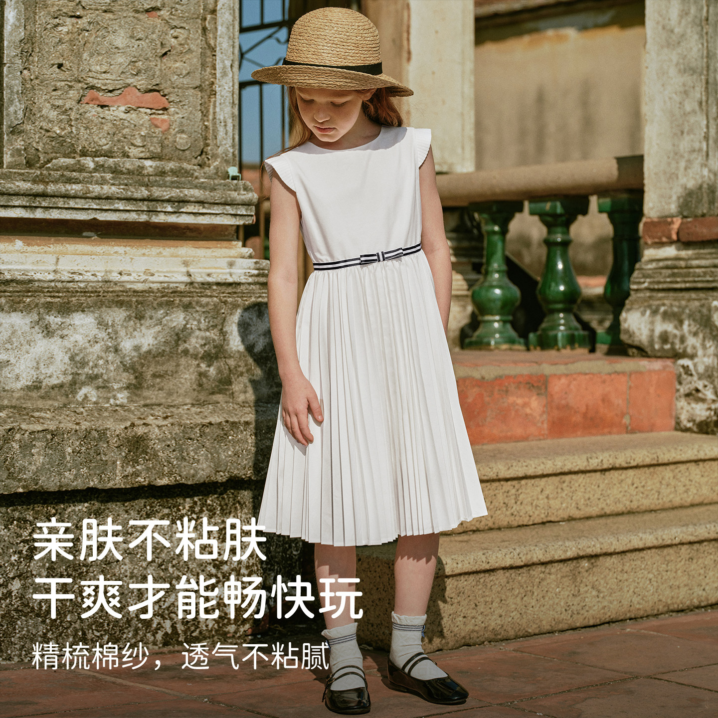 戴维贝拉中大童梭织连衣裙2026夏装新款女童白色公主裙百褶裙子