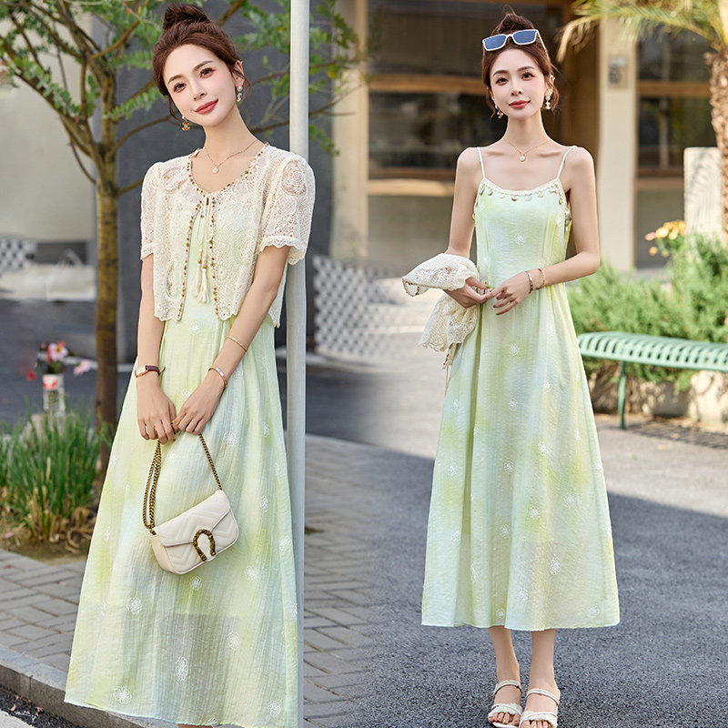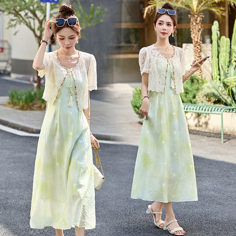 春装女款2026年新款高级感年潮流钉珠系带领蕾丝披肩连衣裙套装裙