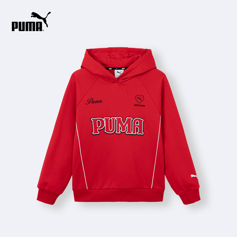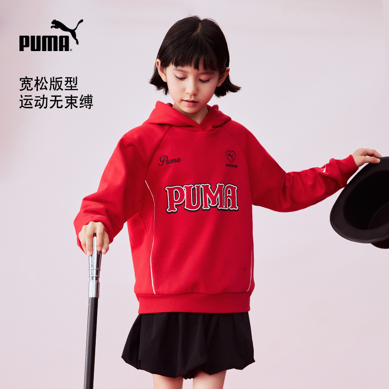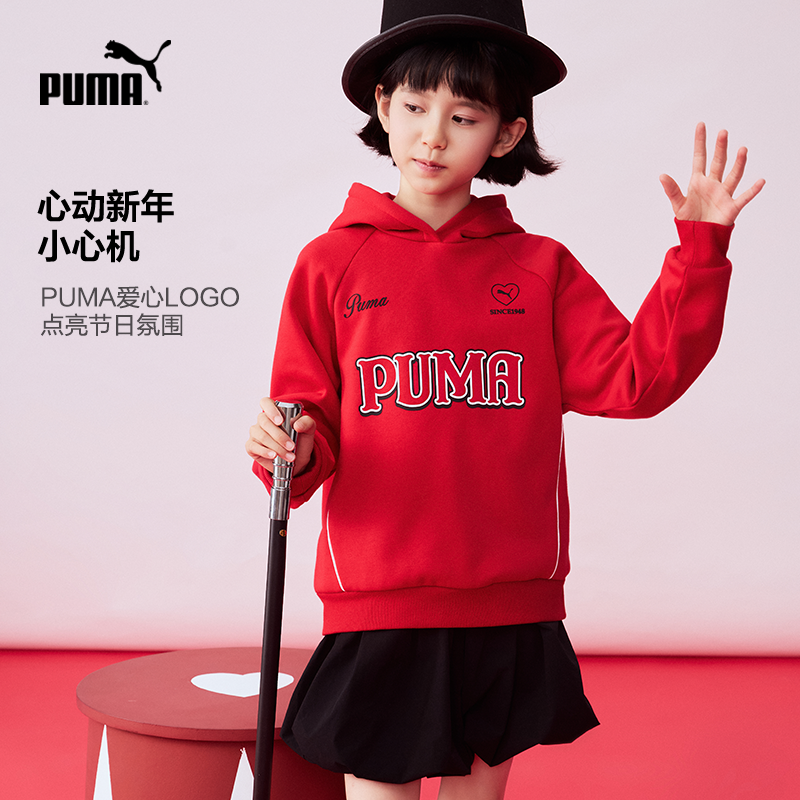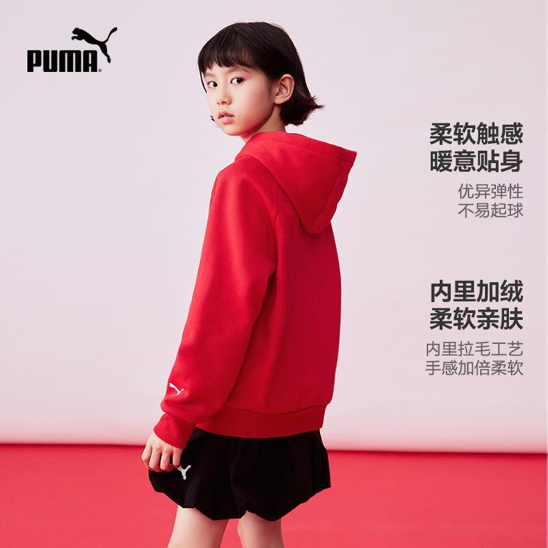 PUMA彪马加绒卫衣女童新年红色秋冬款保暖长袖连帽衫青少年运动Tx