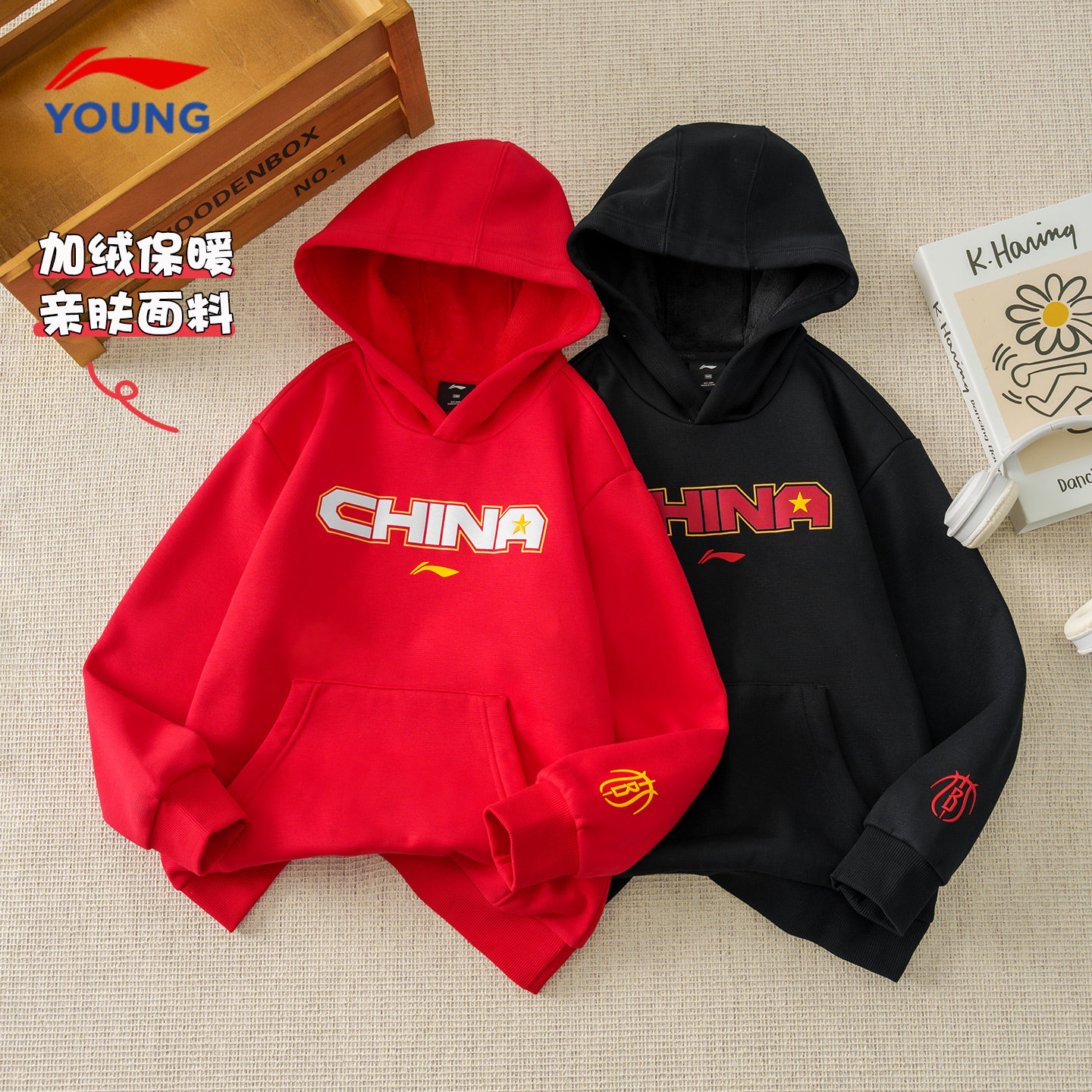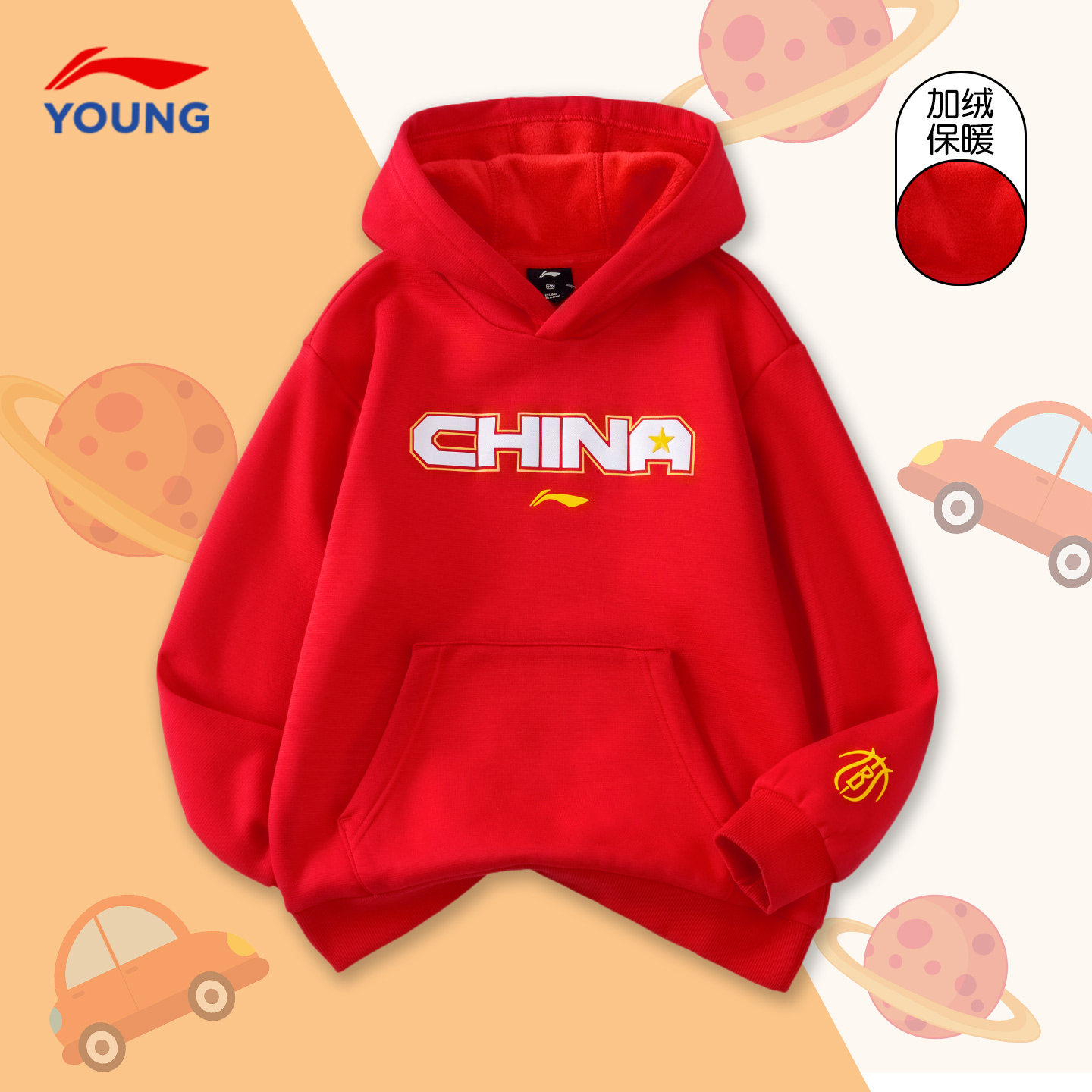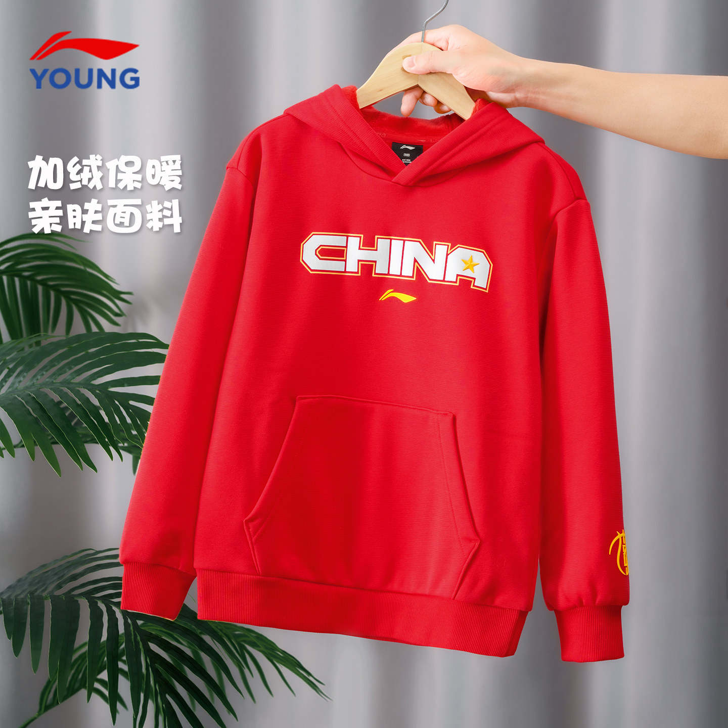 李宁儿童卫衣加绒男女童秋冬新年款红色本命年连帽青少年运动上衣