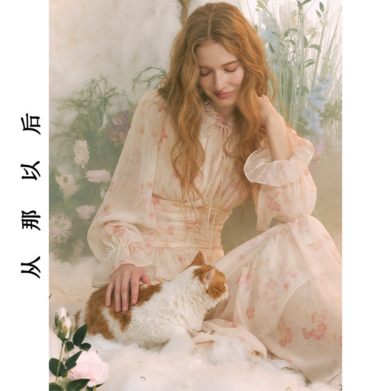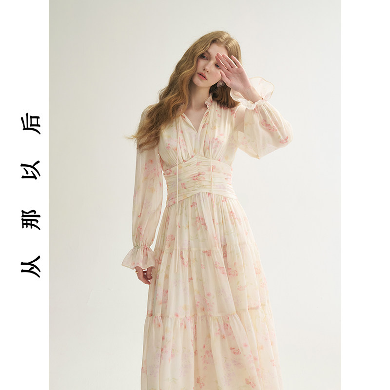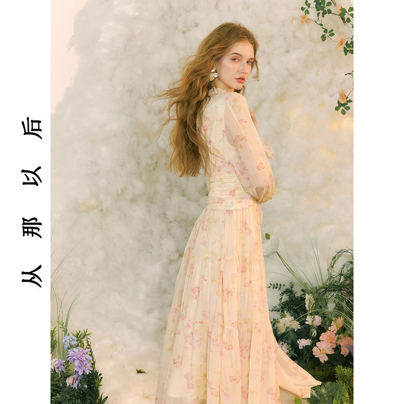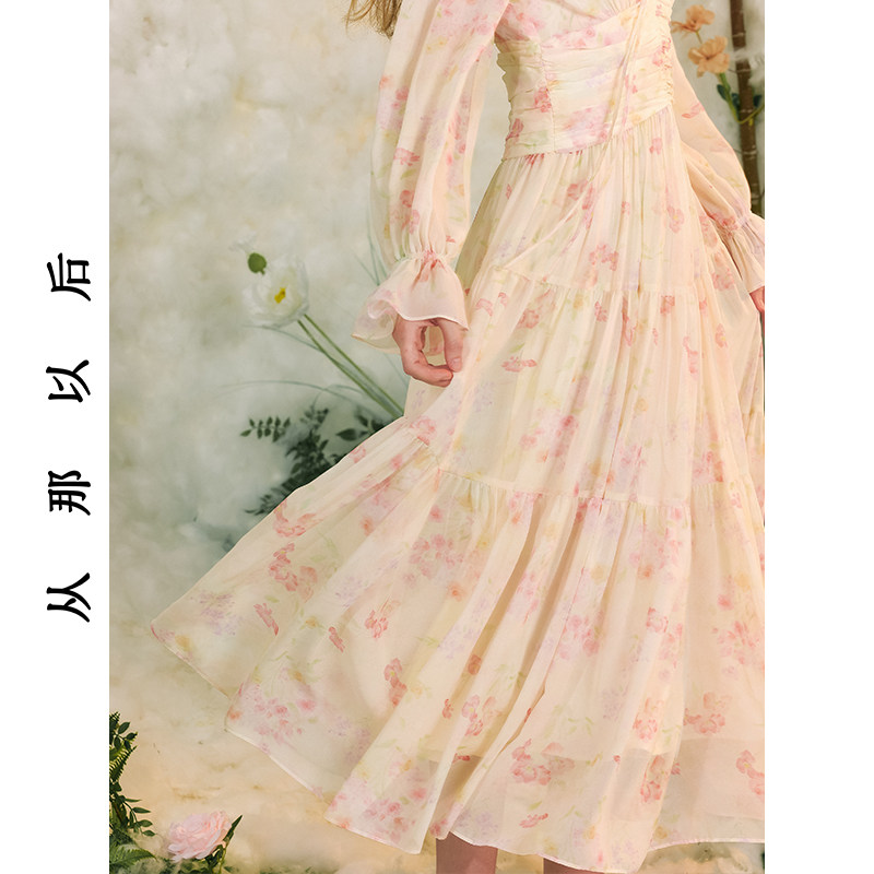 从那以后法式碎花连衣裙夏度假长裙粉色裙子春长袖纱裙女春季新款