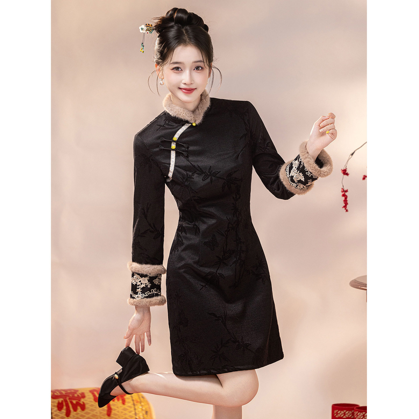 冬季旗袍女新中式加绒加厚2025新款小个子长袖黑色连衣裙改良绝美
