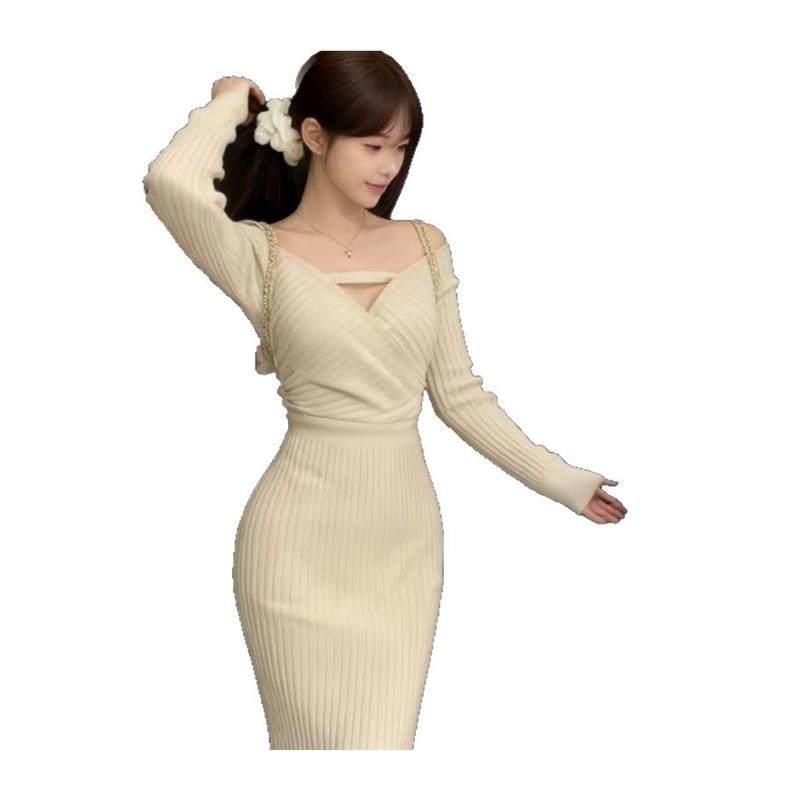 法式风粉色针织裙女2025年交叉V领收腰长袖包臀裙秋冬针织连衣裙