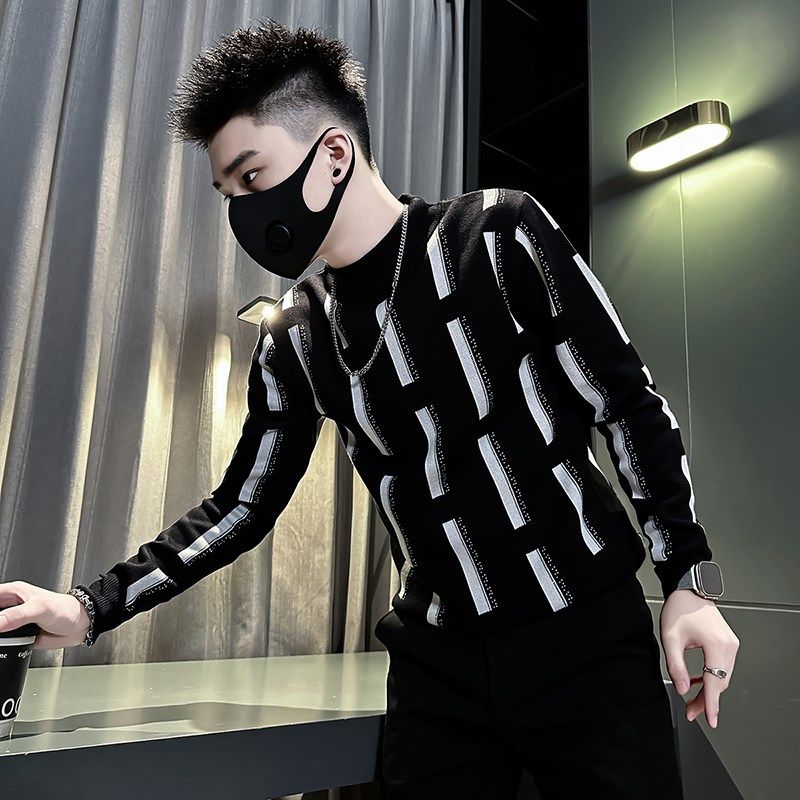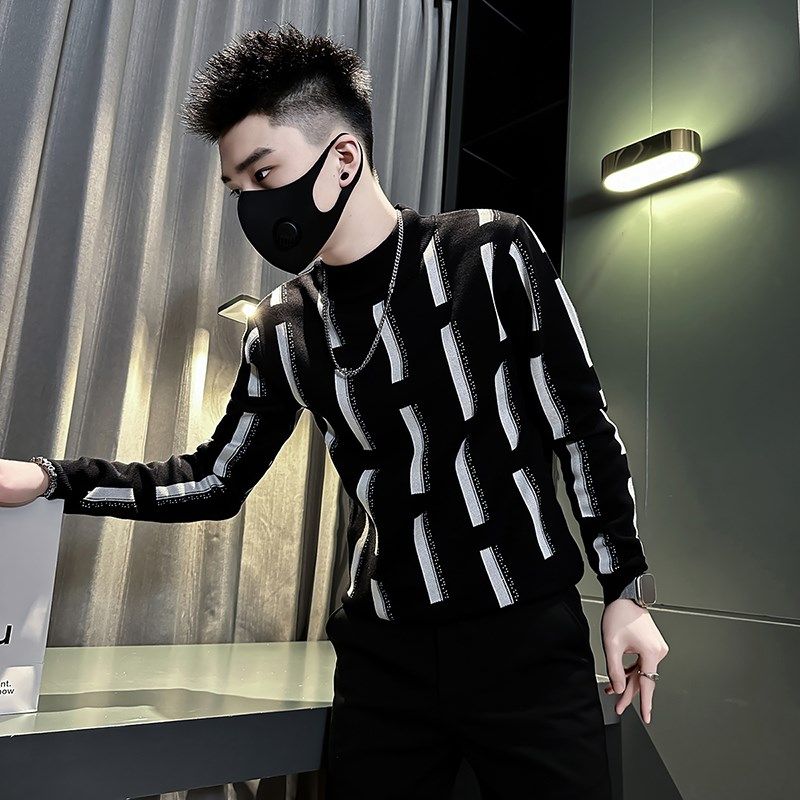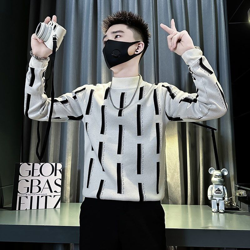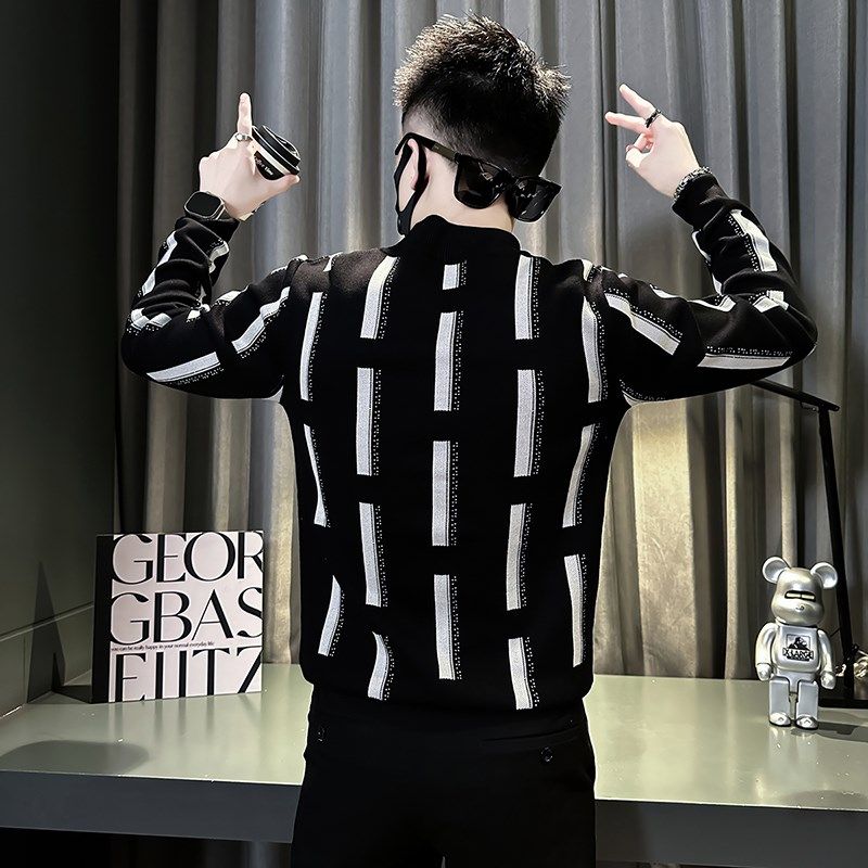 冬季条纹毛衣男款修身内搭中领上衣2024新款爆款半高领保暖打底衫