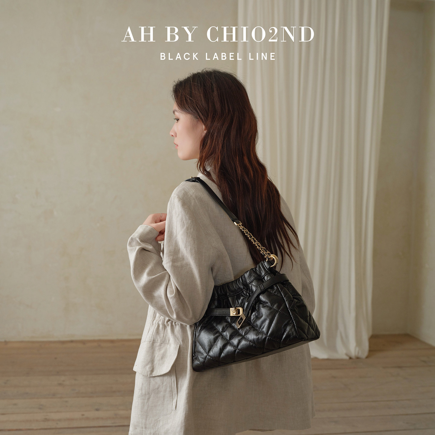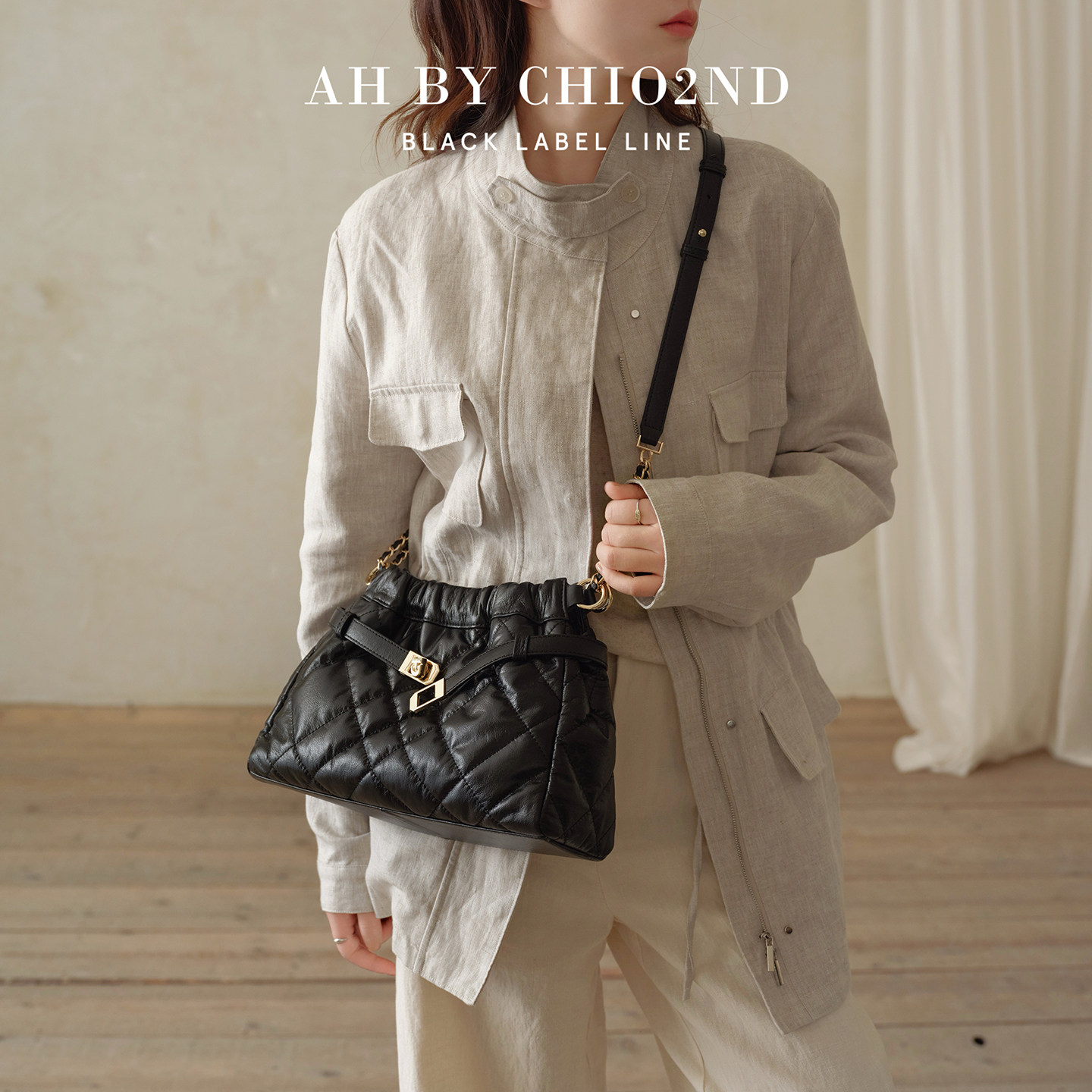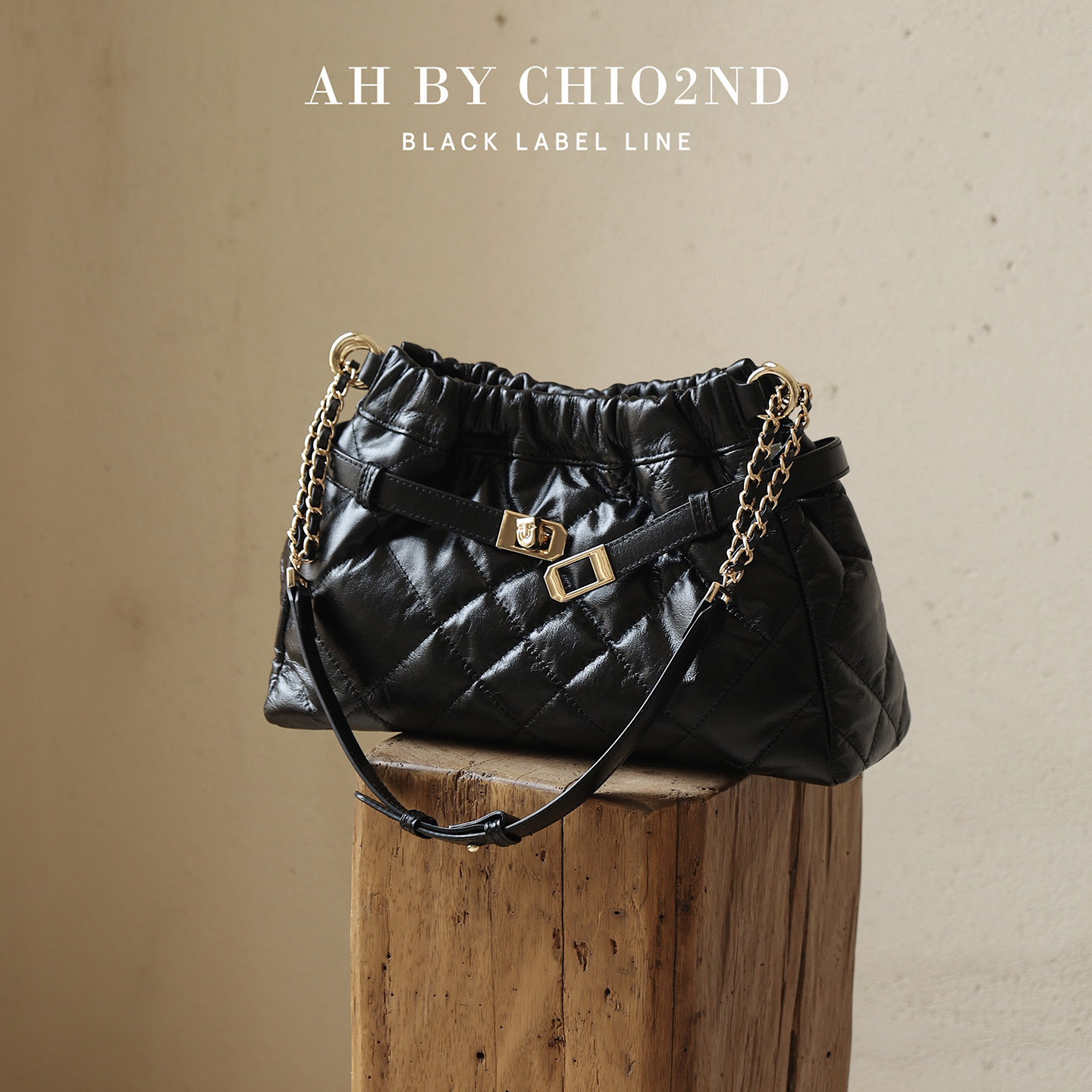 南风AH 高端系列真皮托特包 黑色菱格褶皱包包女款复古单肩斜挎包