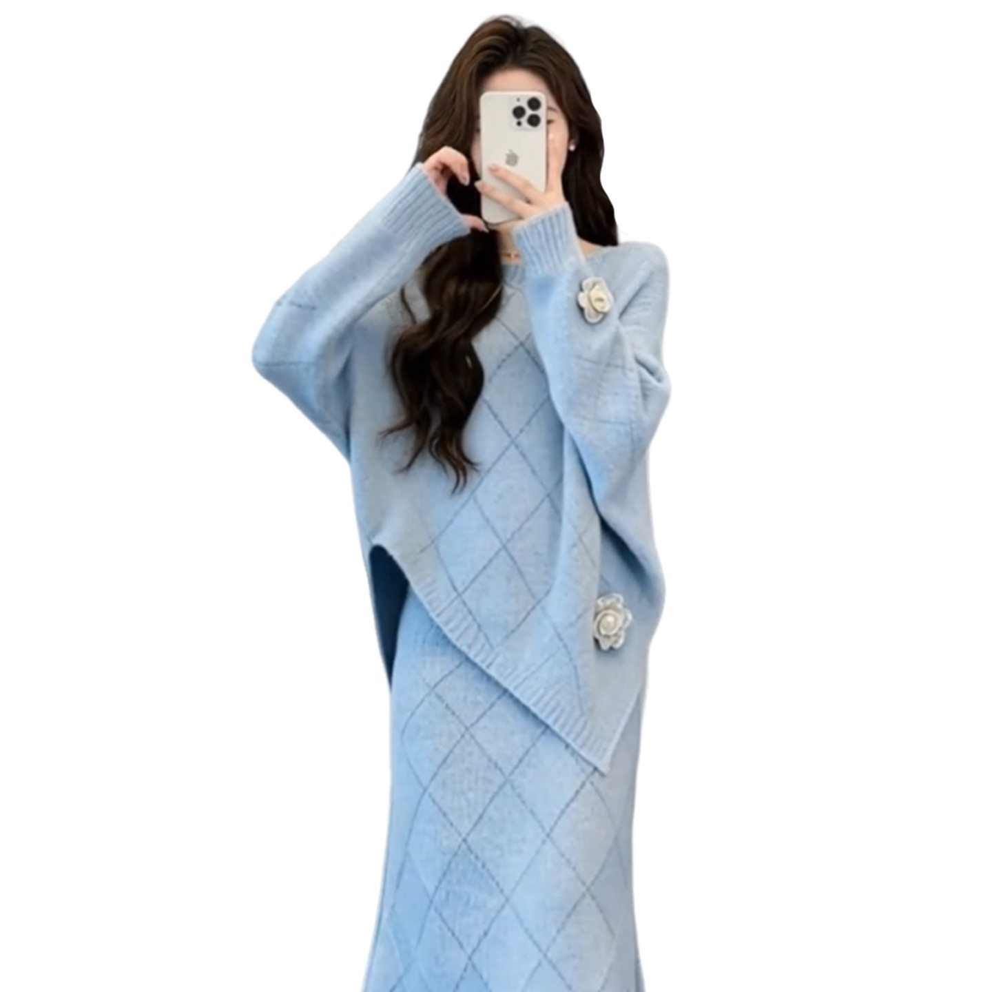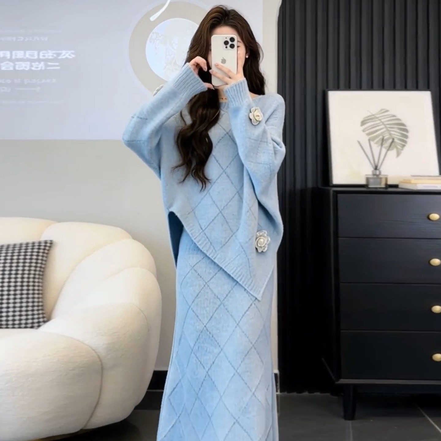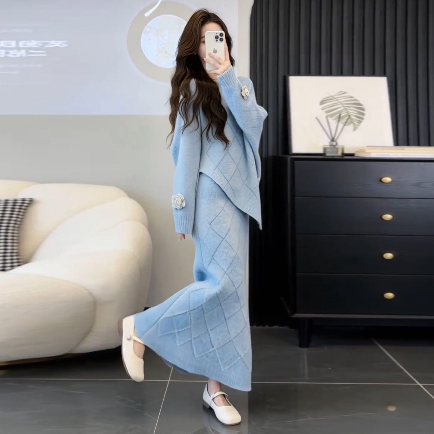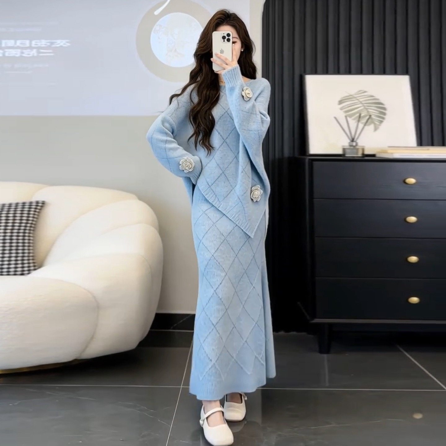 蓝色毛衣针织连衣裙子女冬季2026新款巨好看韩系穿搭一整套装长裙
