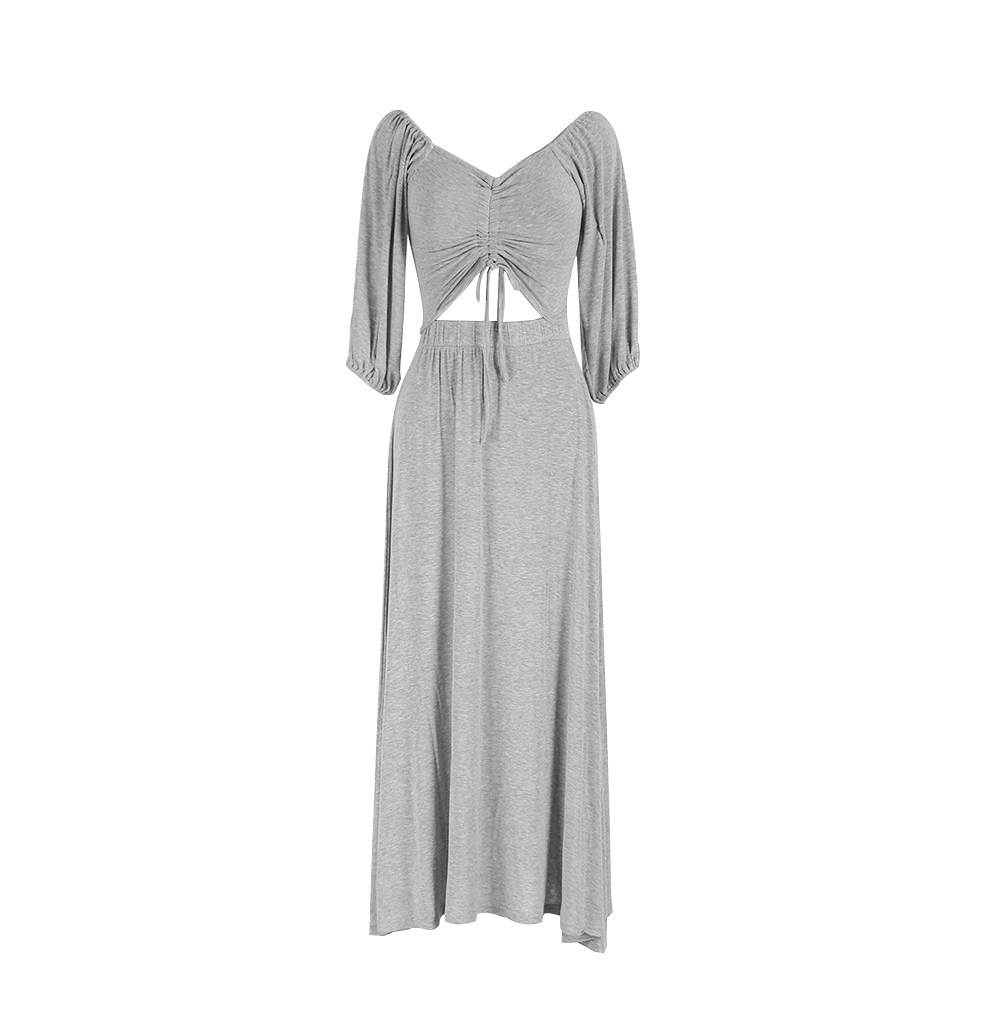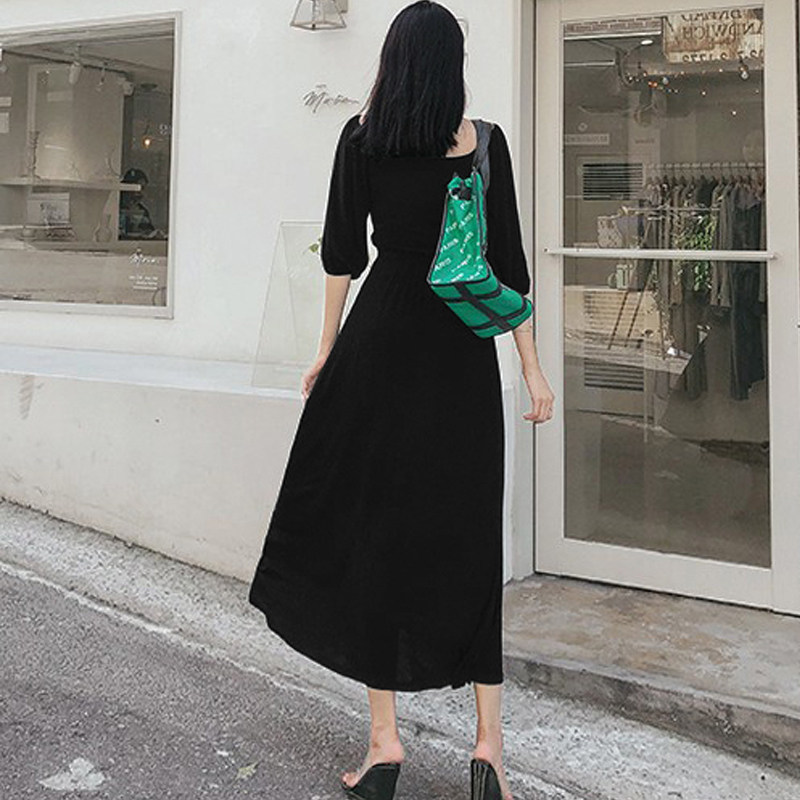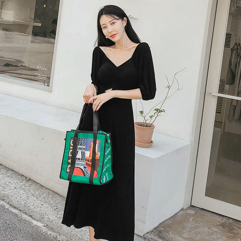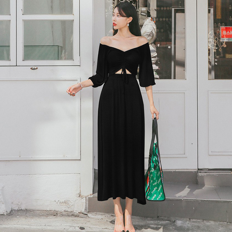 黑色V领露胸中袖莫代尔连衣裙女夏外穿长裙性感收腰显瘦气质露背