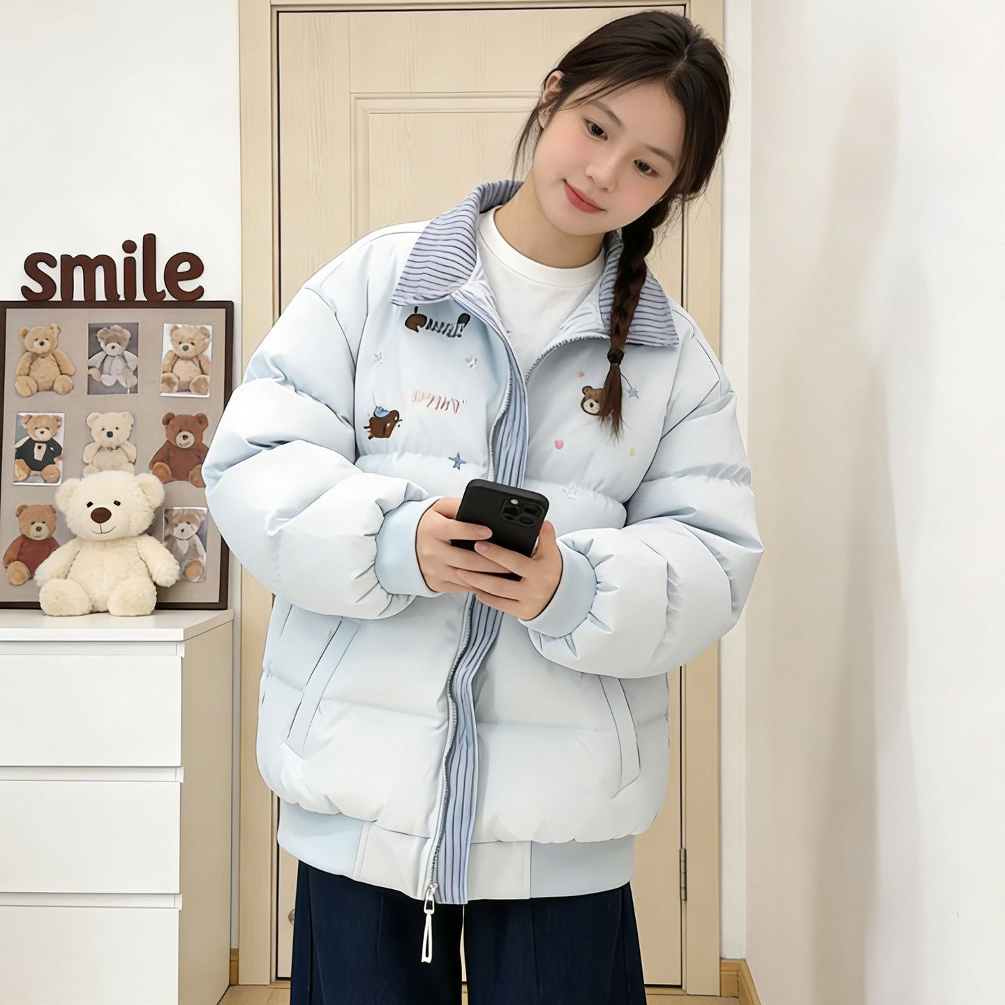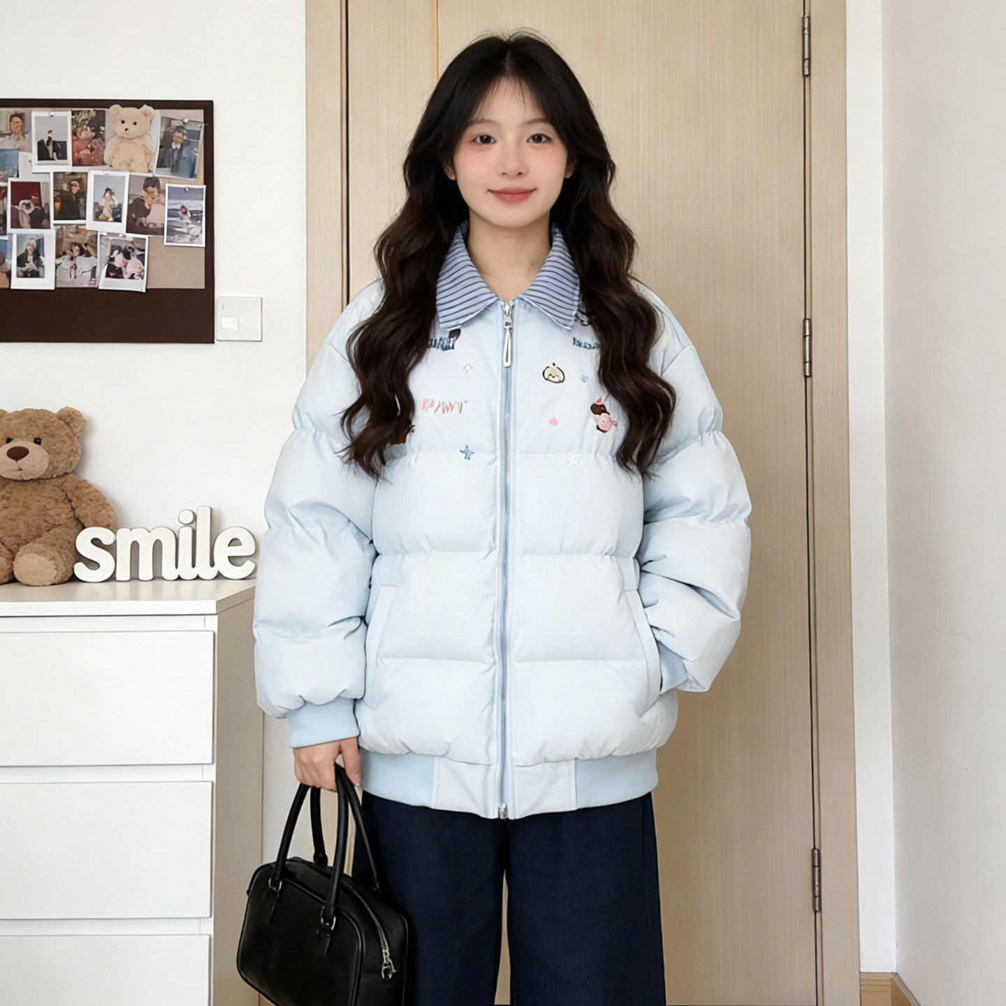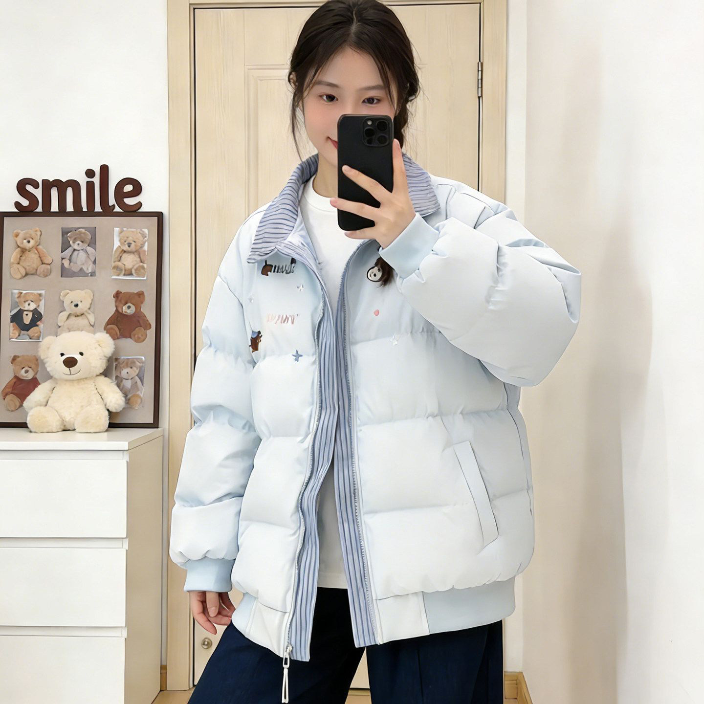 韩系撞色翻领羽绒棉服女大童初中高中学生加厚保暖面包服冬季外套
