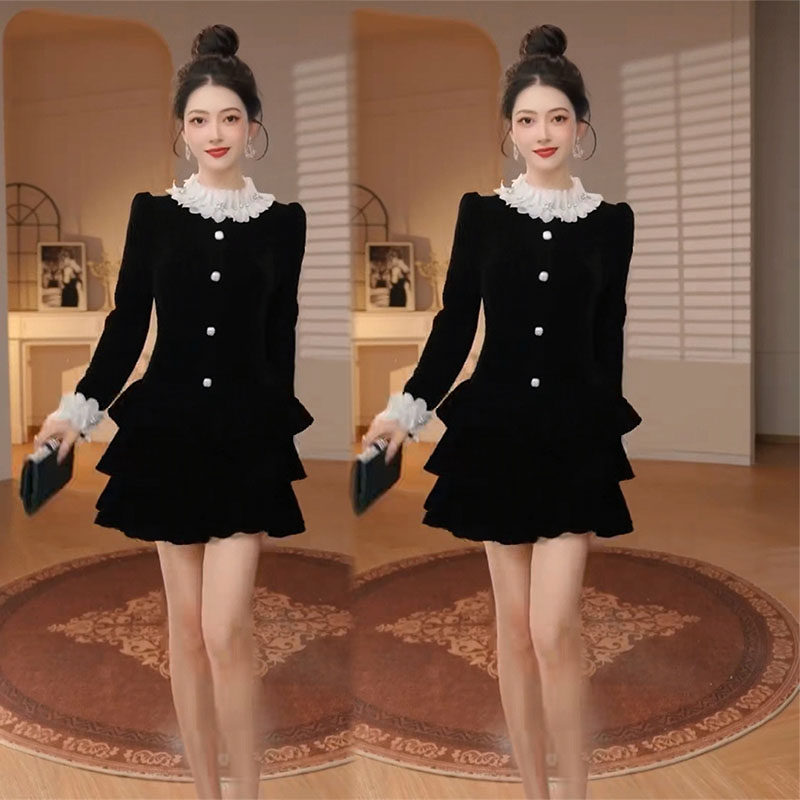 千金风设计感连衣裙女2025冬季高级感收腰蛋糕裙小个子法式复古裙