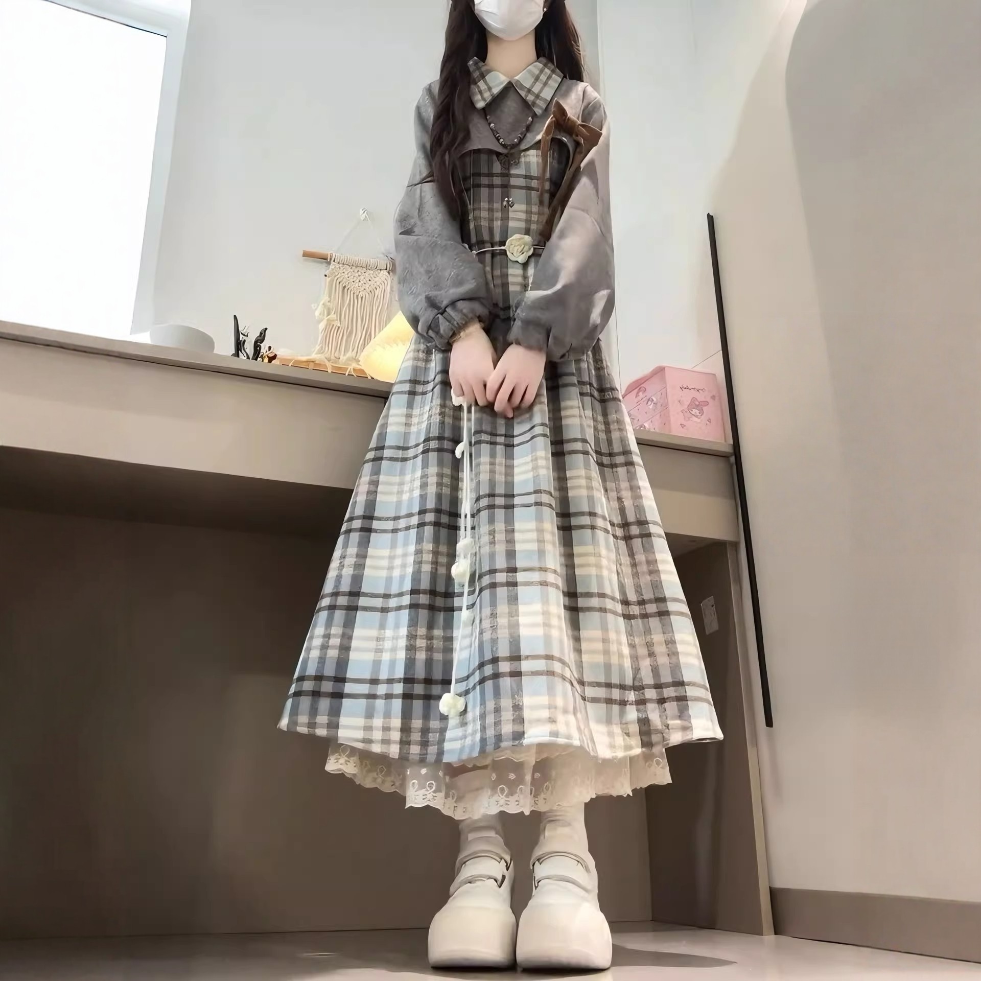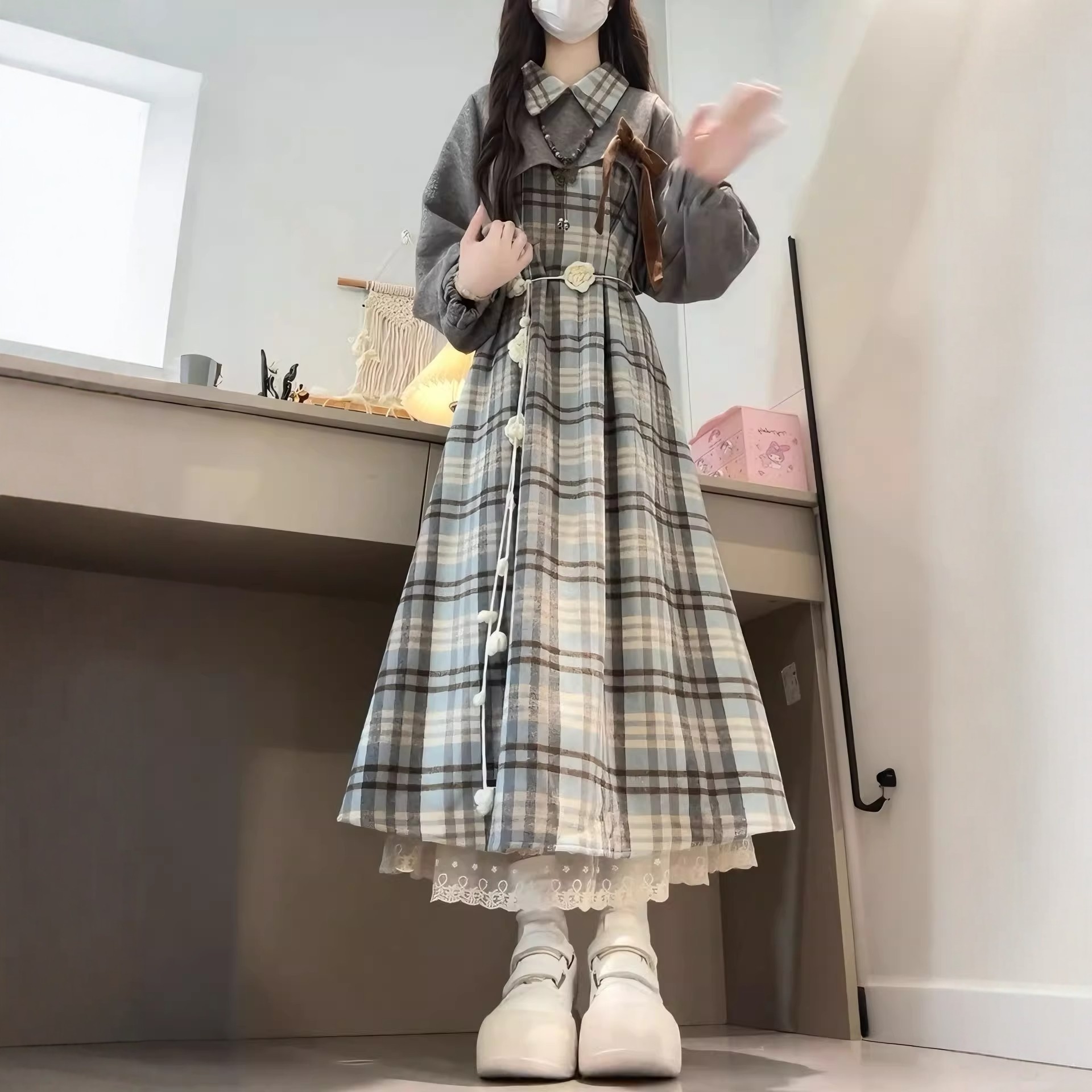 格纹连衣裙女小个子秋冬长裙子两件套装女2026新款复古小众学院风