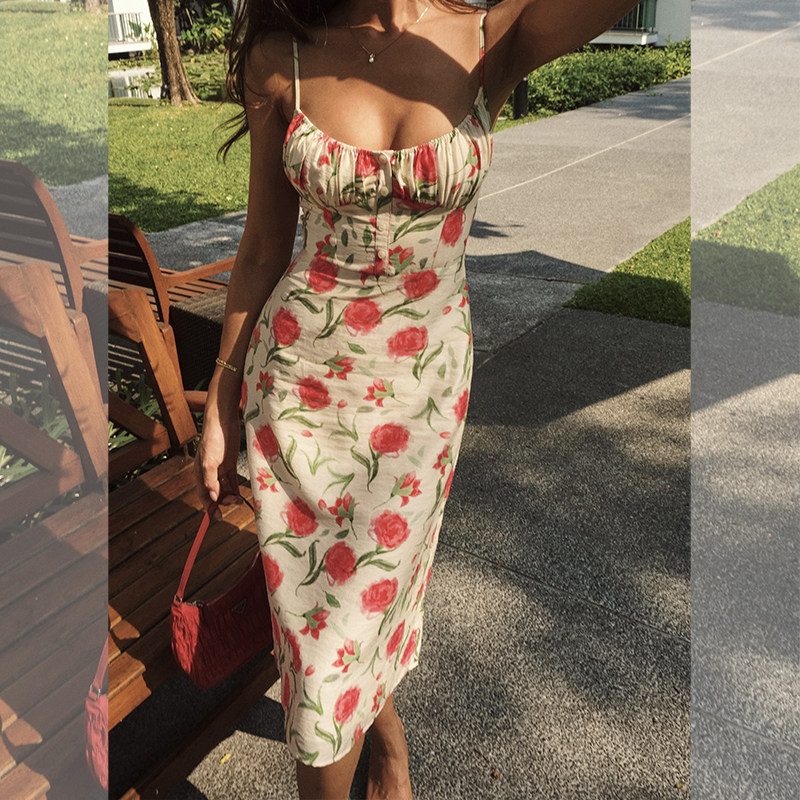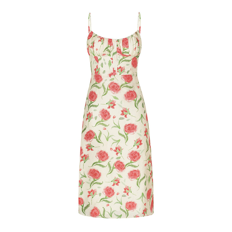 ITSNIKAR 法式玫瑰碎花连衣裙女夏茶歇吊带裙长款海边度假风裙子