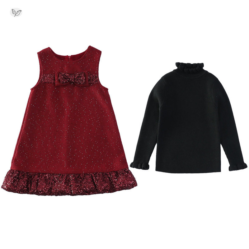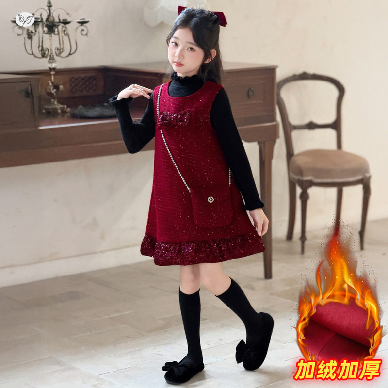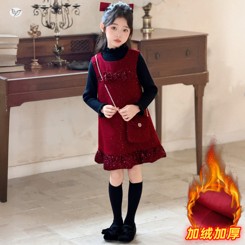 女童新年红色小香风连衣裙秋冬新款大儿童加绒背心裙套装公主裙子