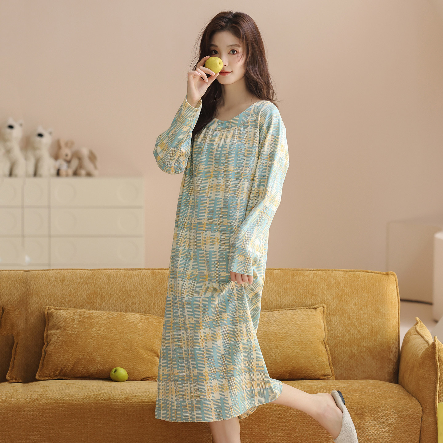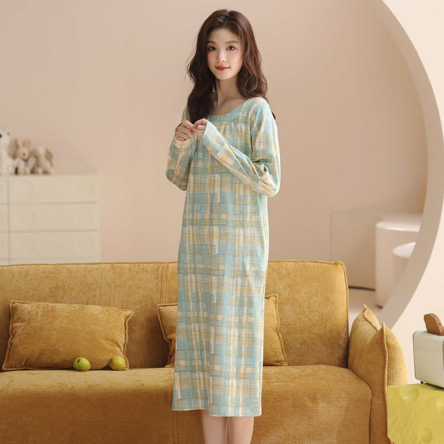 纯棉长袖格子睡裙女春秋中长款宽松休闲柔软家居服2026新款连衣裙