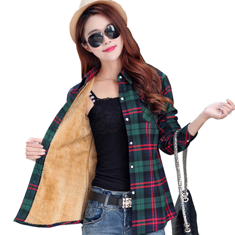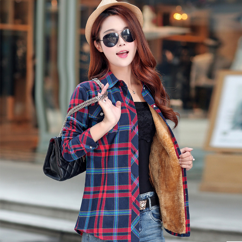 冬装新款女士保暖纯棉格子长袖衬衫百搭修身学生上衣加绒加厚外套
