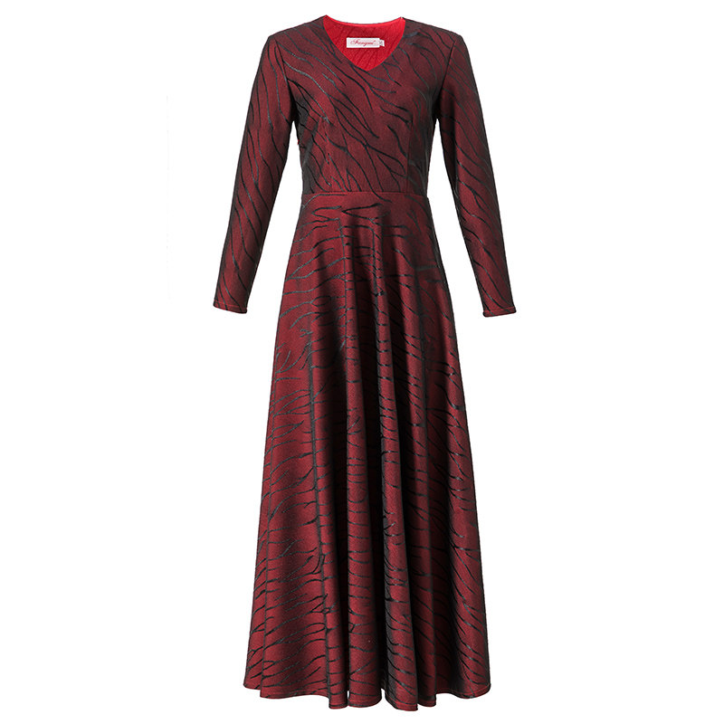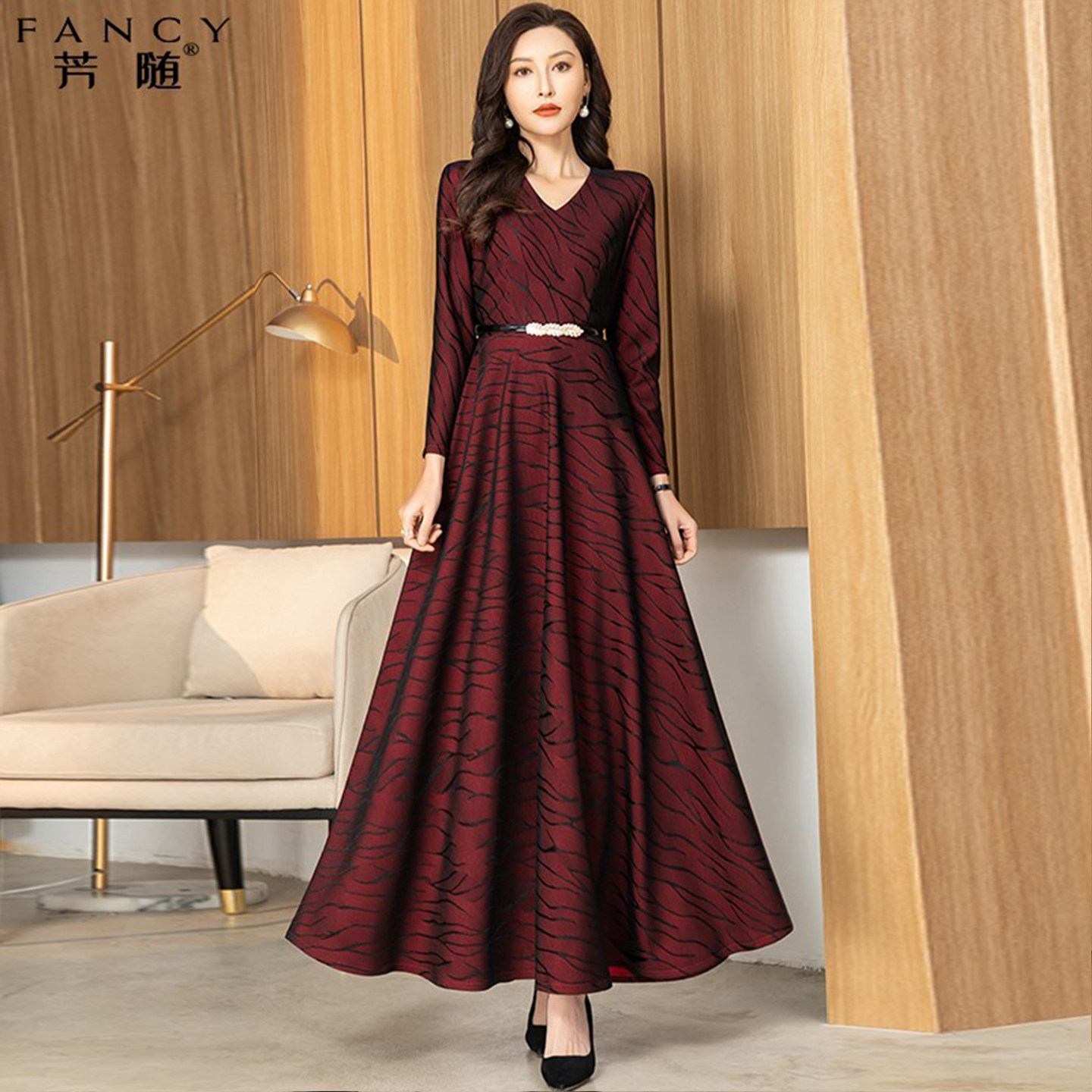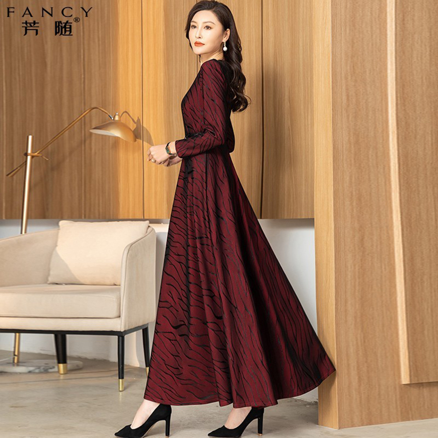 酒红色条纹针织长袖连衣裙女2025春季新款气质长款过膝到脚踝长裙