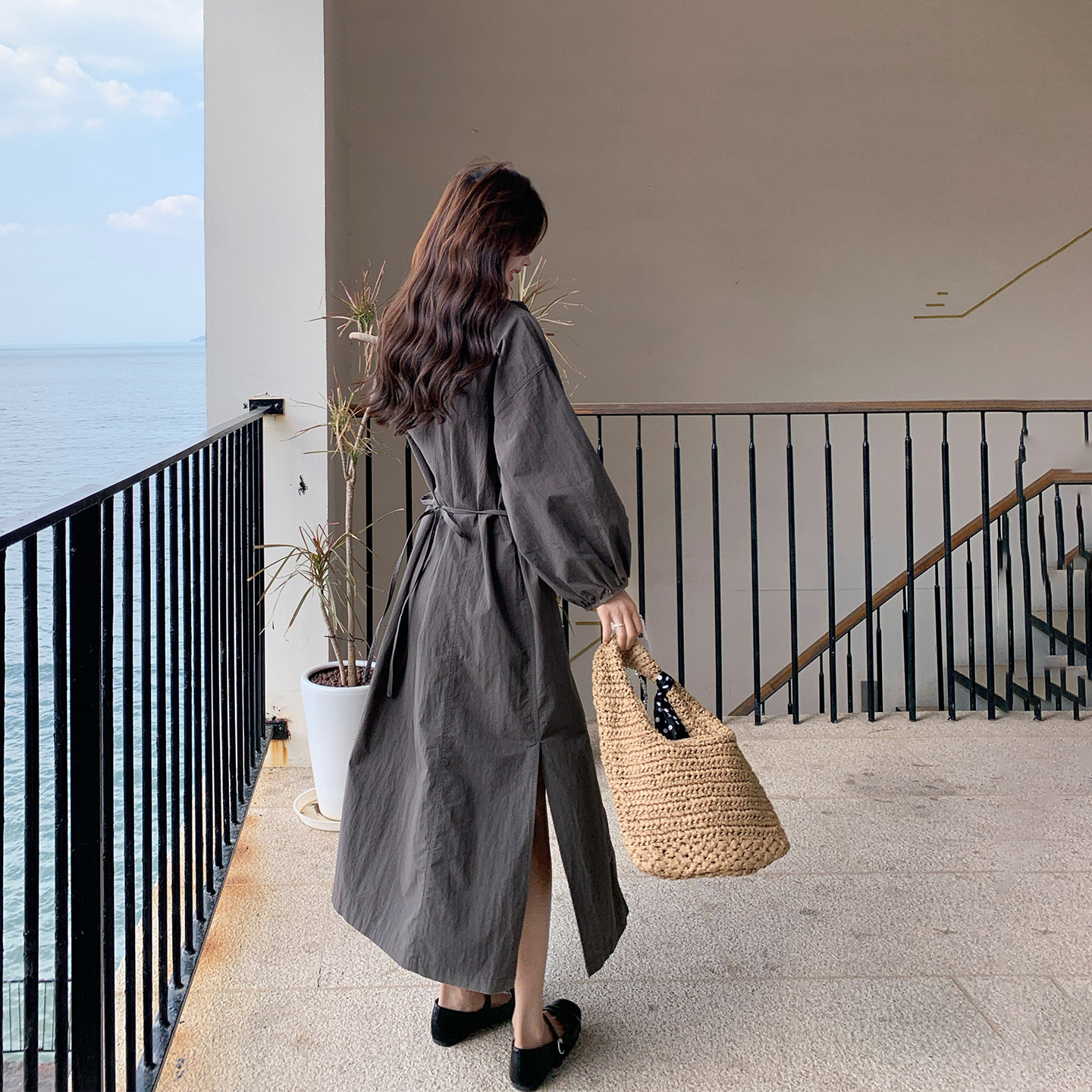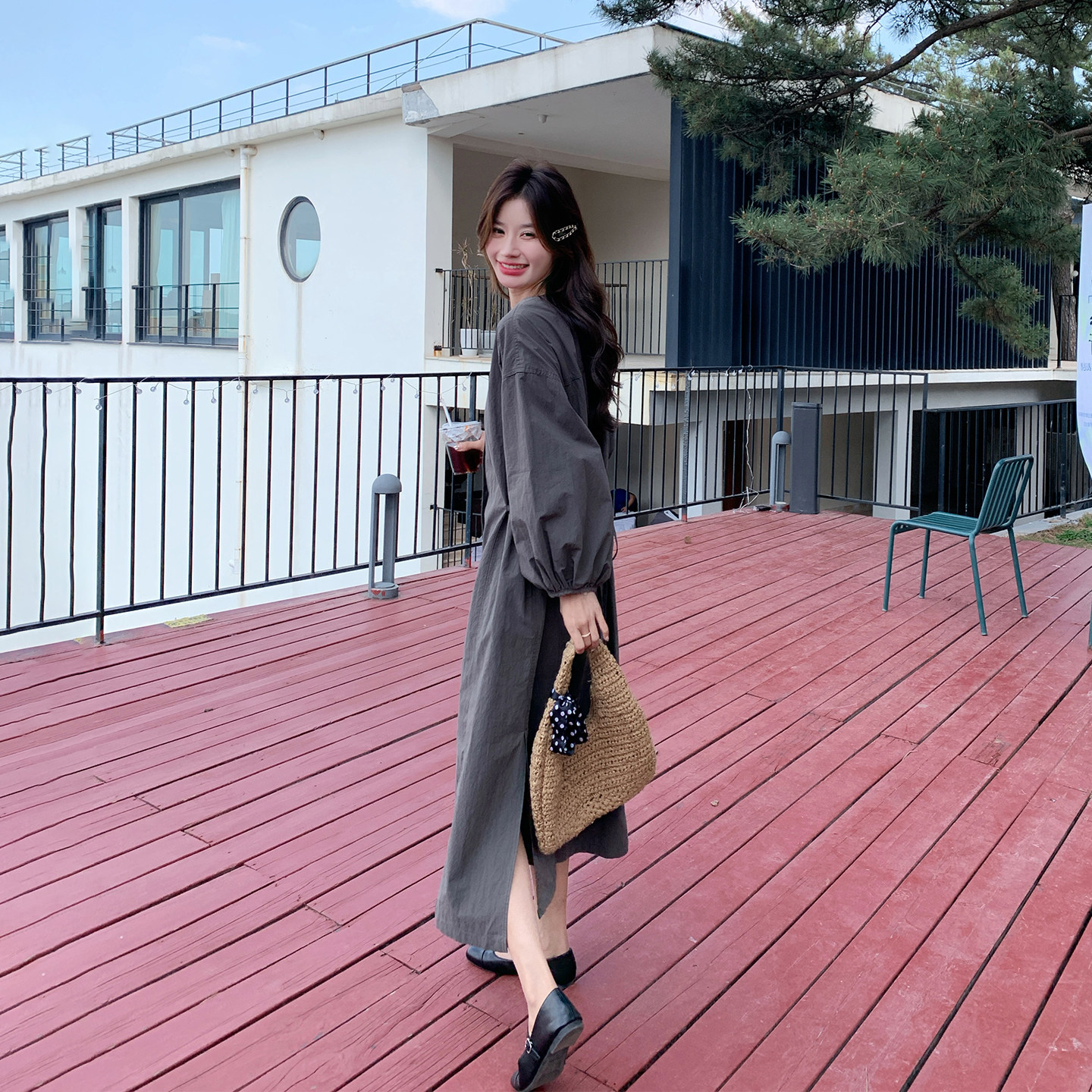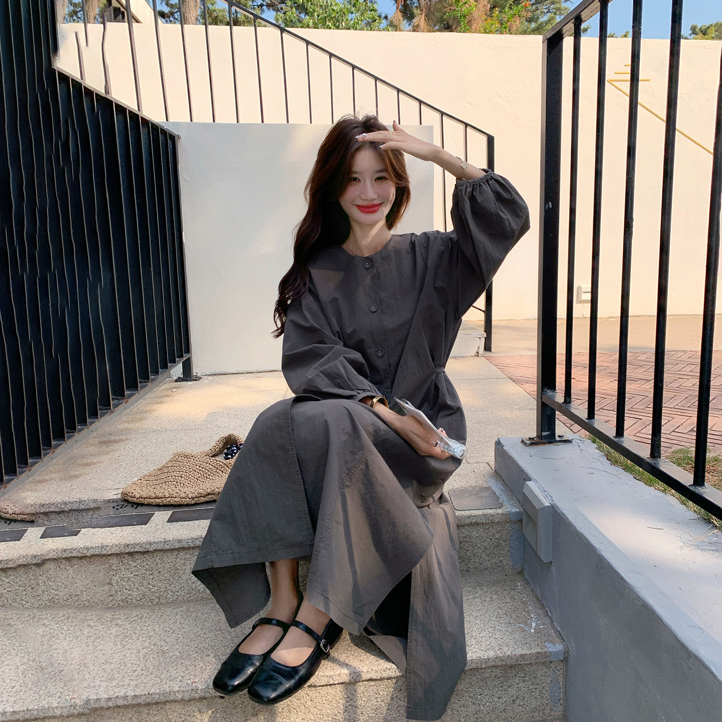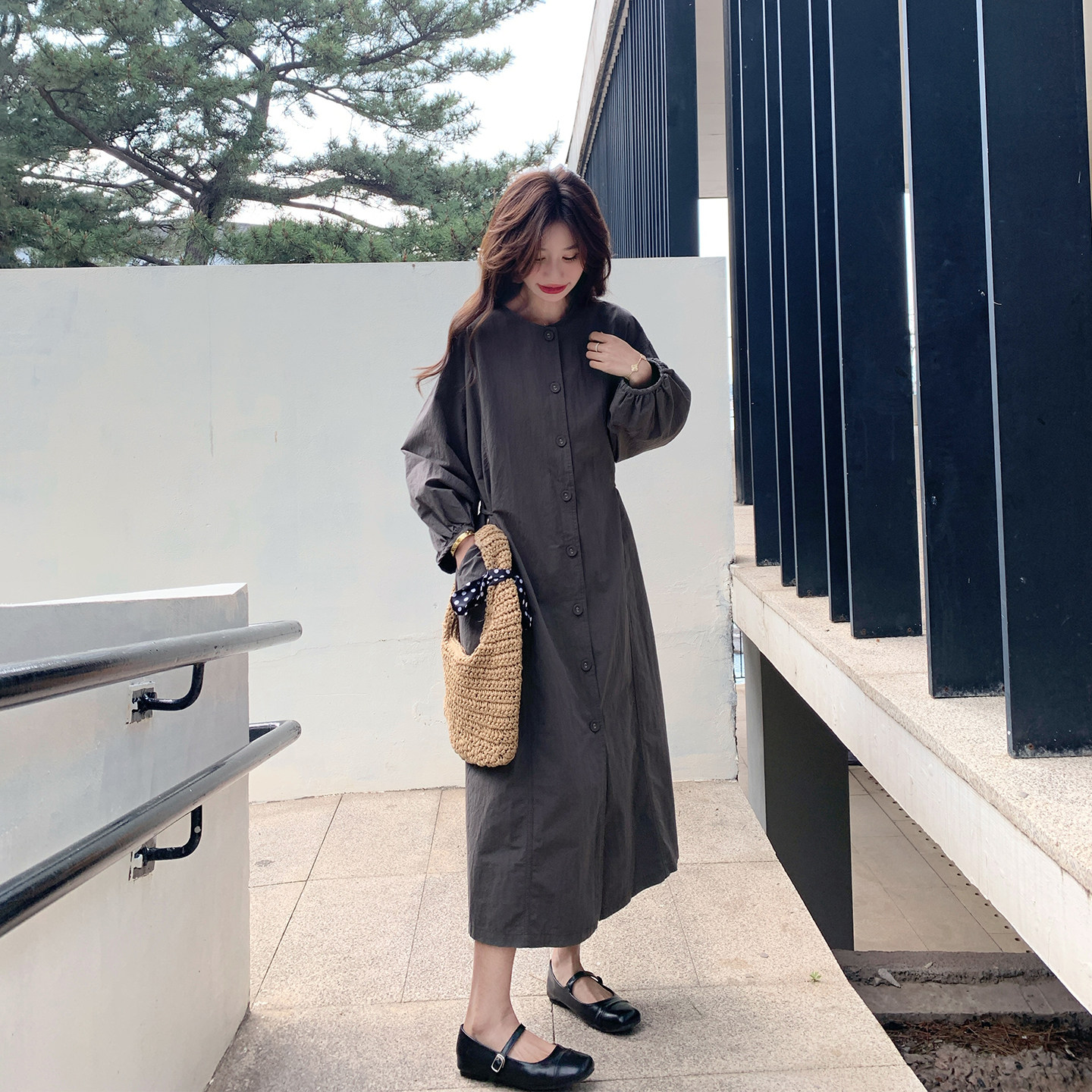 韩系减龄炭灰色收腰显瘦连衣裙女春季2026新款爆款巨好看衬衫长裙
