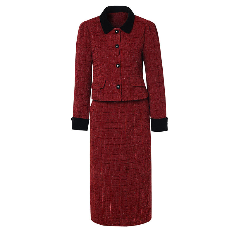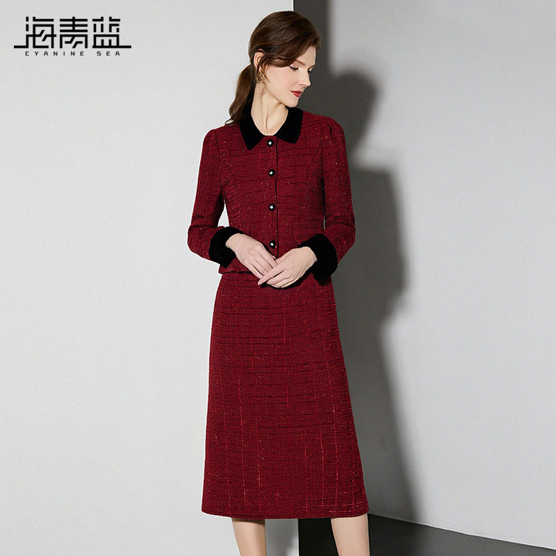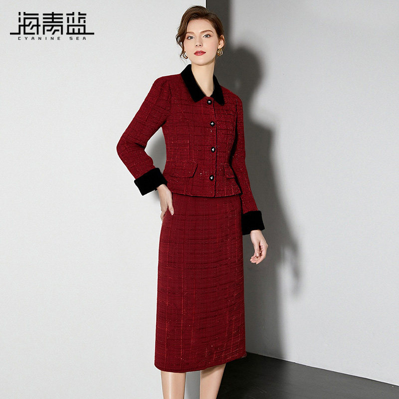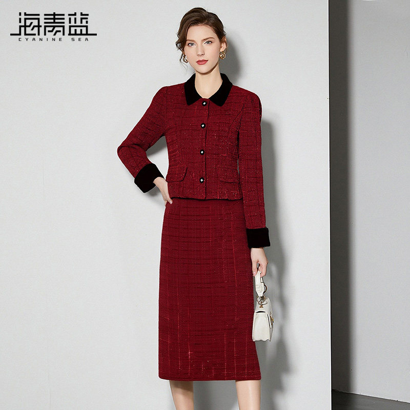 海青蓝 红色套装女2025新款冬装翻领时尚气质女装半身裙两件套