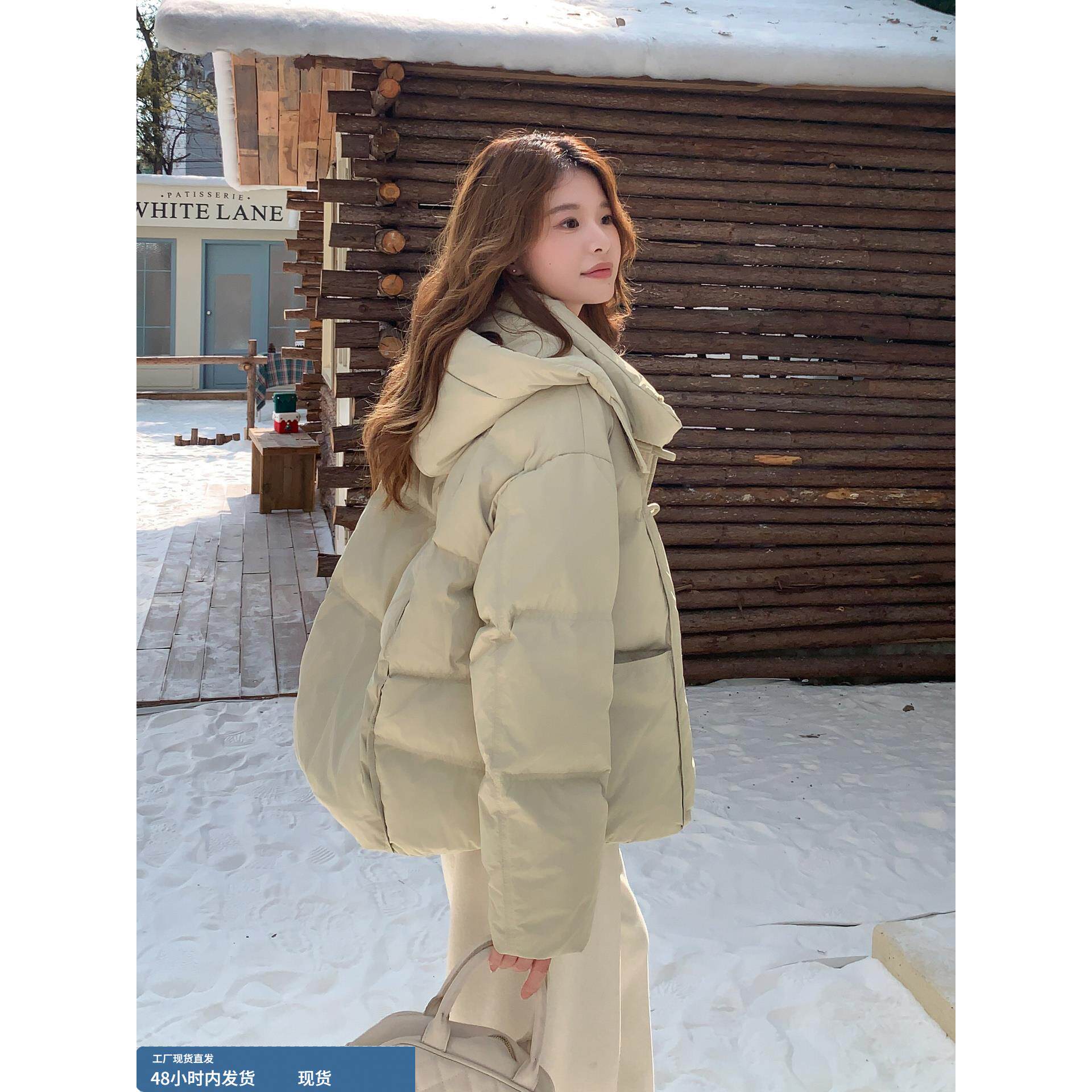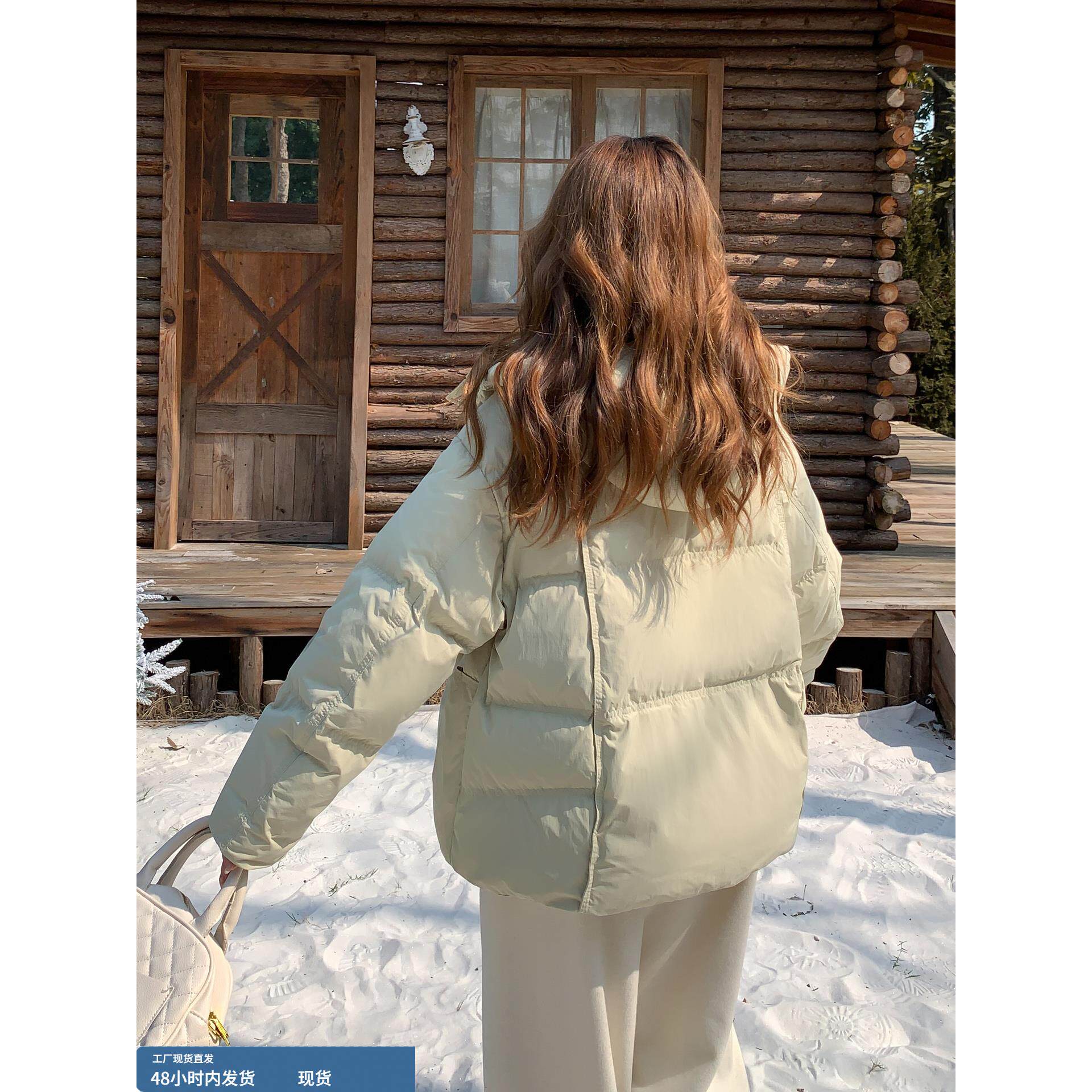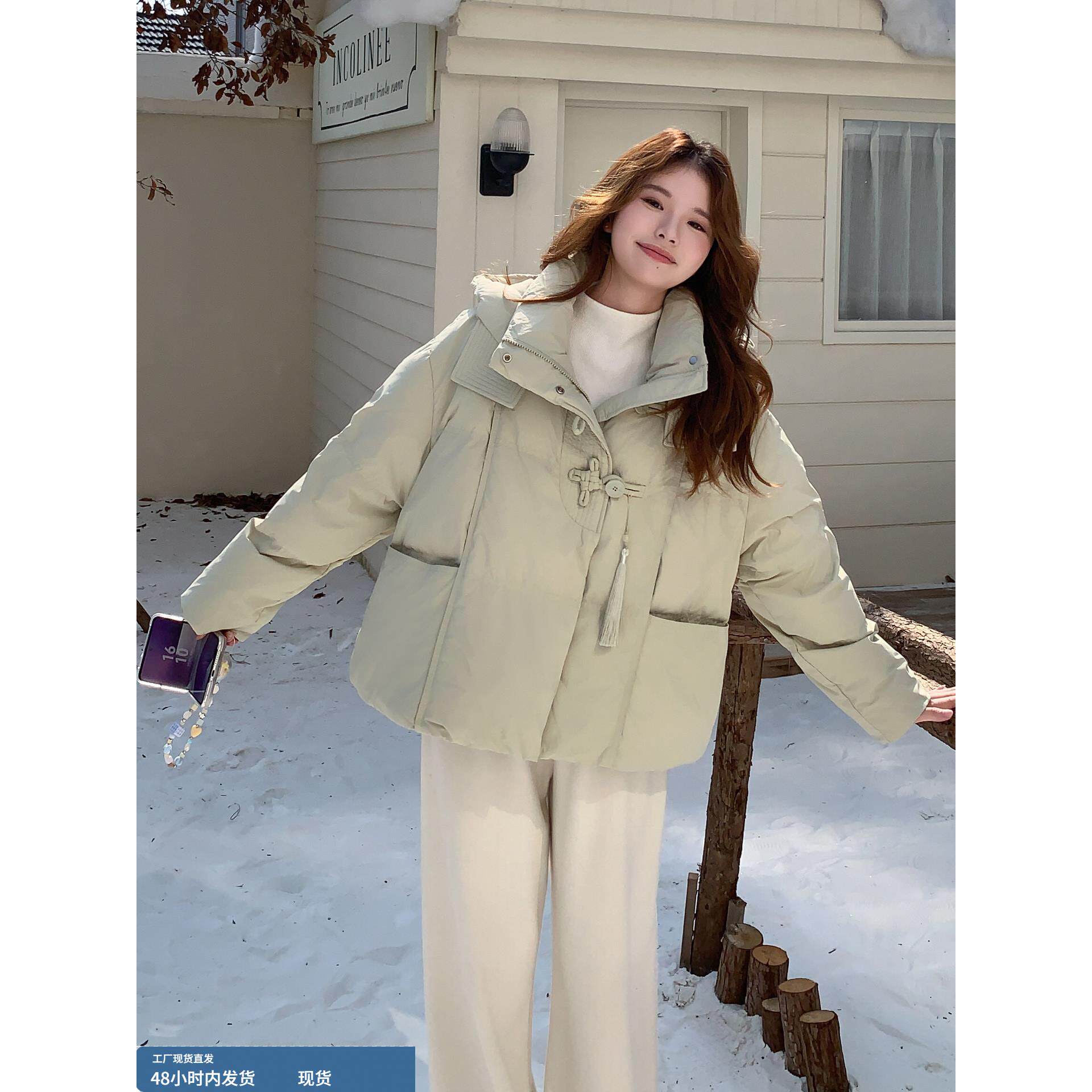 浅绿色覆古风盘扣连帽短款羽绒服女冬季2025年新款90白鸭绒面包服