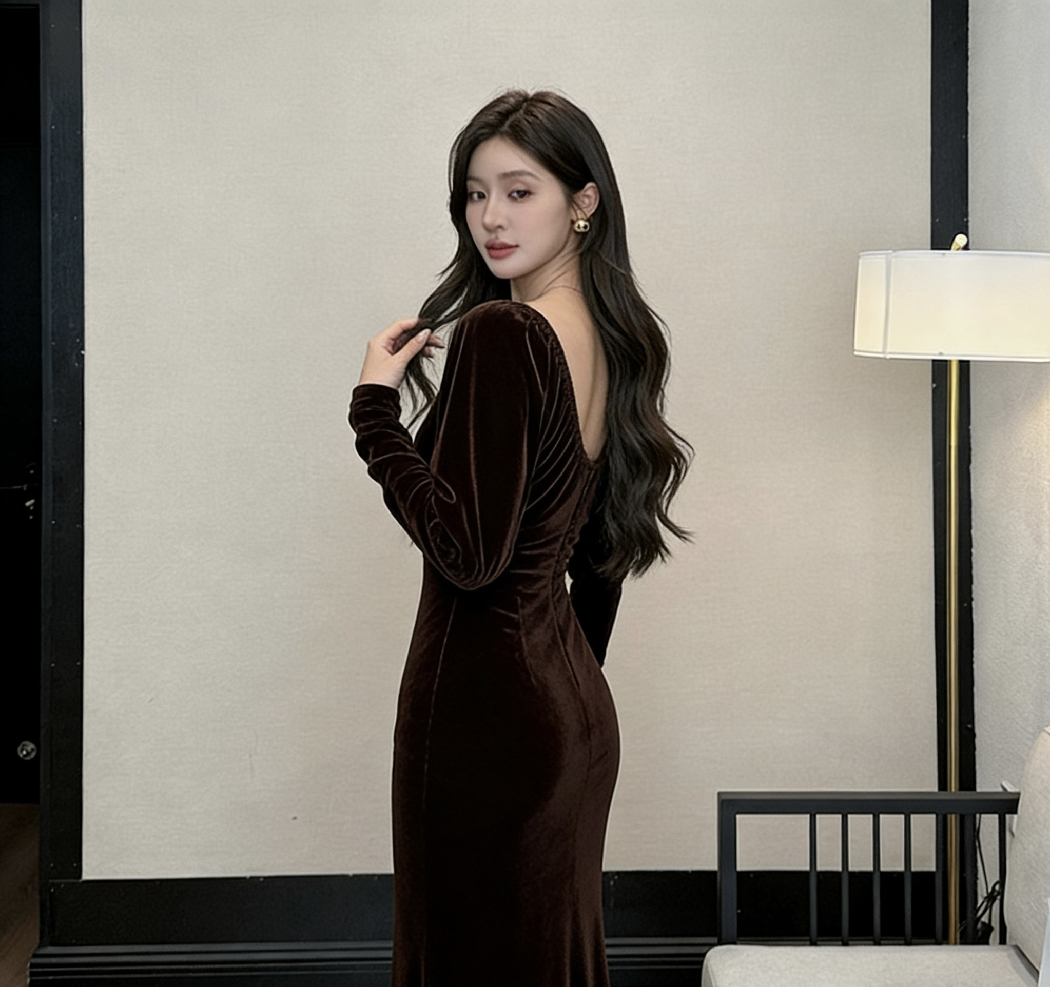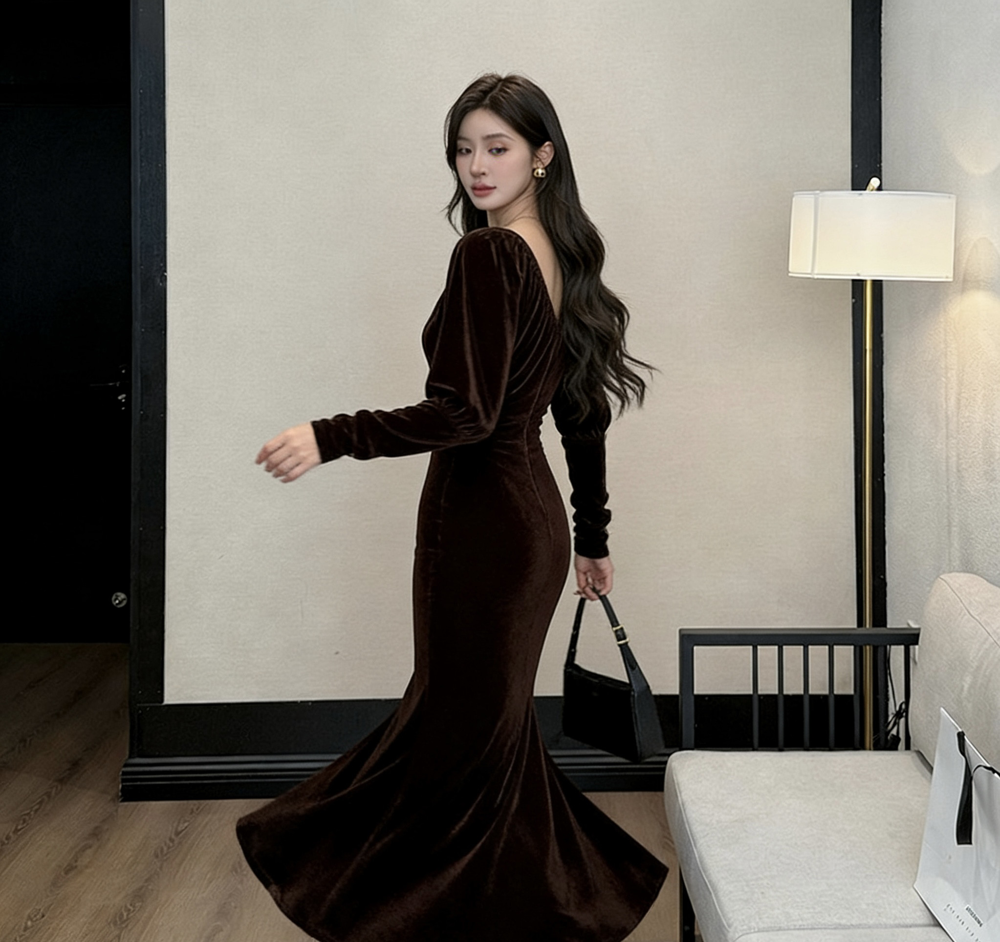 2025年新款法式气质丝绒连衣裙女秋冬高级感小个子内搭打底鱼尾裙