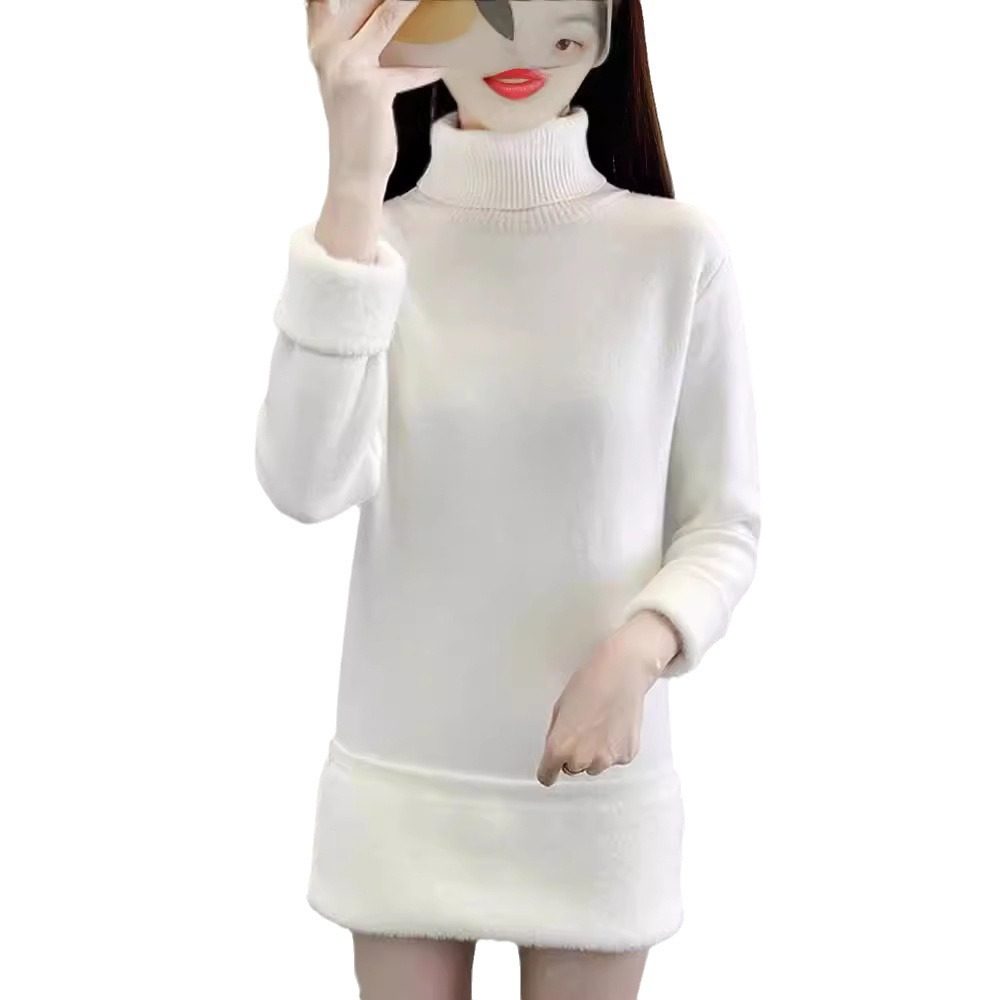 加绒加厚一体绒秋冬保暖打底衫针织衫毛衣女高领长袖中长款连衣裙
