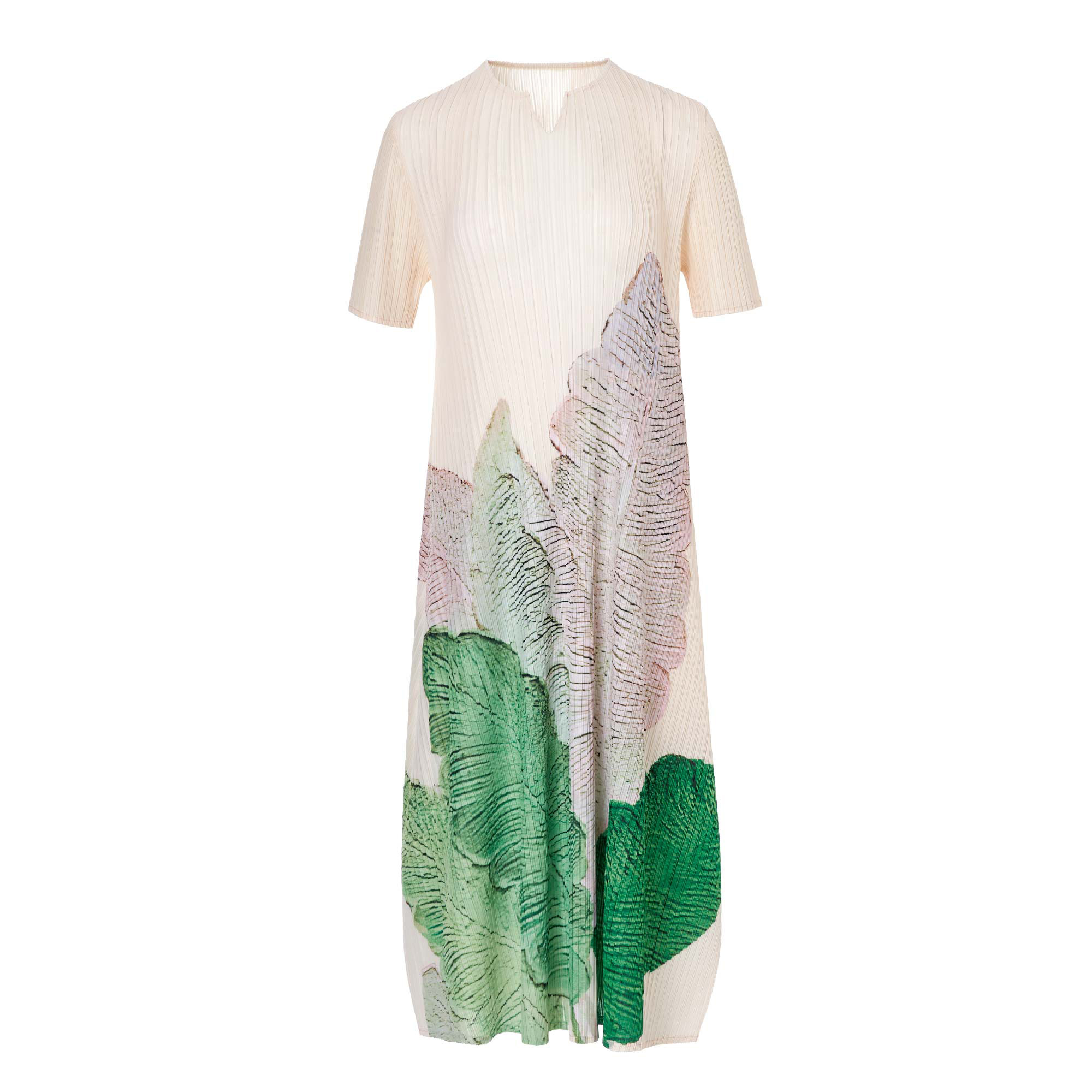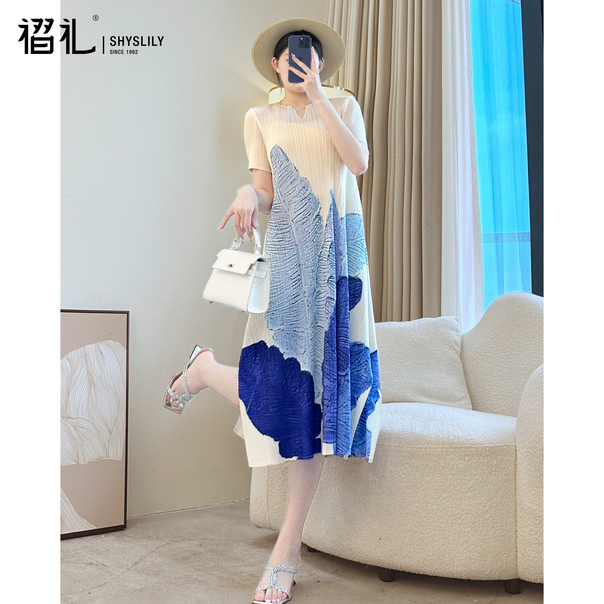 三宅褶皱妈妈连衣裙女装新款海边沙滩裙子夏季大码印花大摆裙衣服