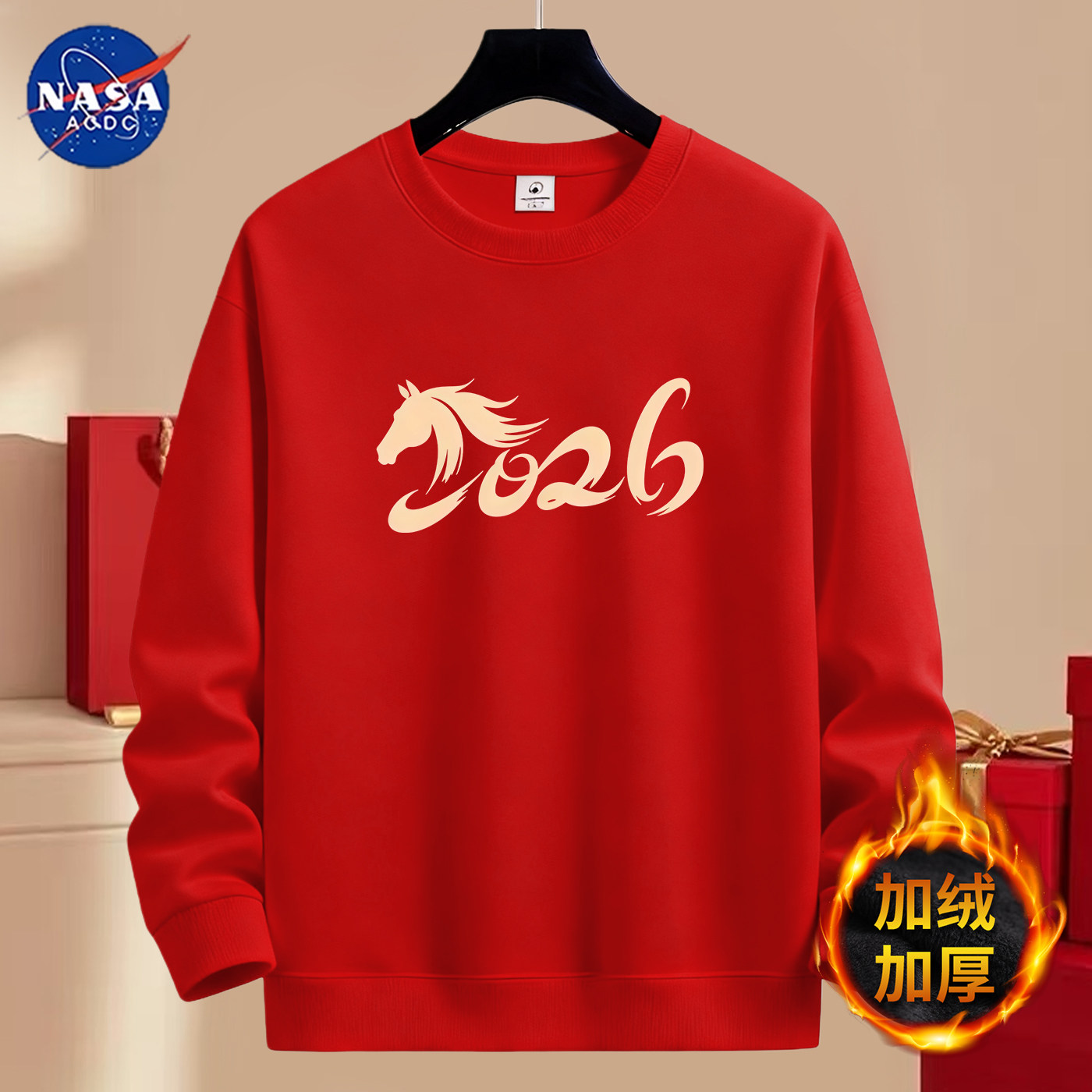 NASA卫衣男士秋冬季大红色2026马年本命年加绒加厚圆领青少年新年