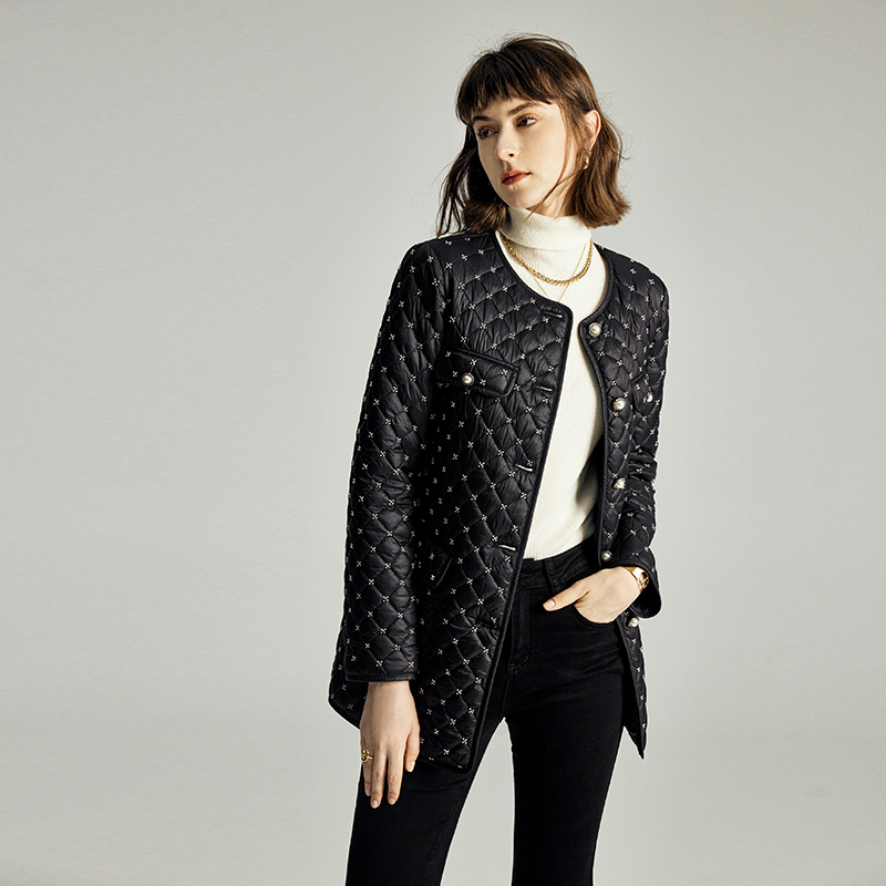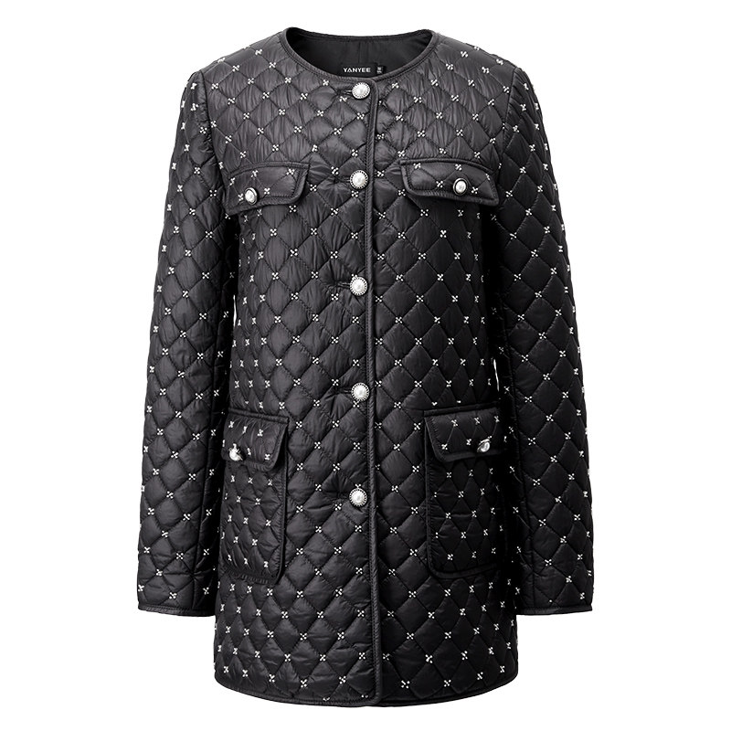 颜域中长款小香风棉服2025新款冬季外套女士优雅钉珠棉袄圆领棉衣