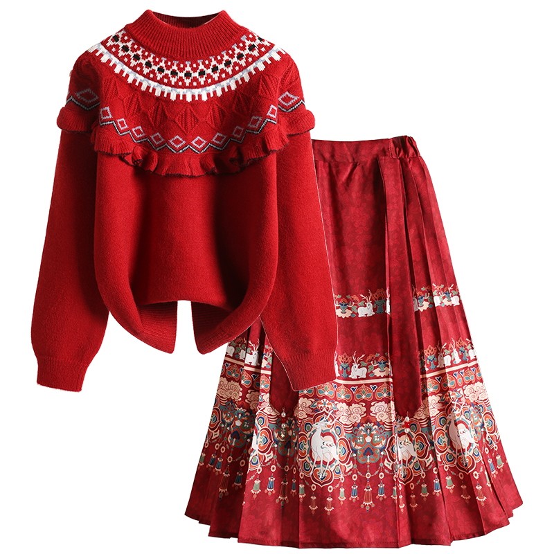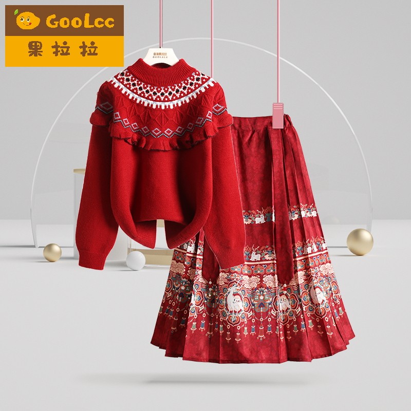 12岁女童本命年衣服红色过年服2026马年大童女孩毛衣马面裙套装冬