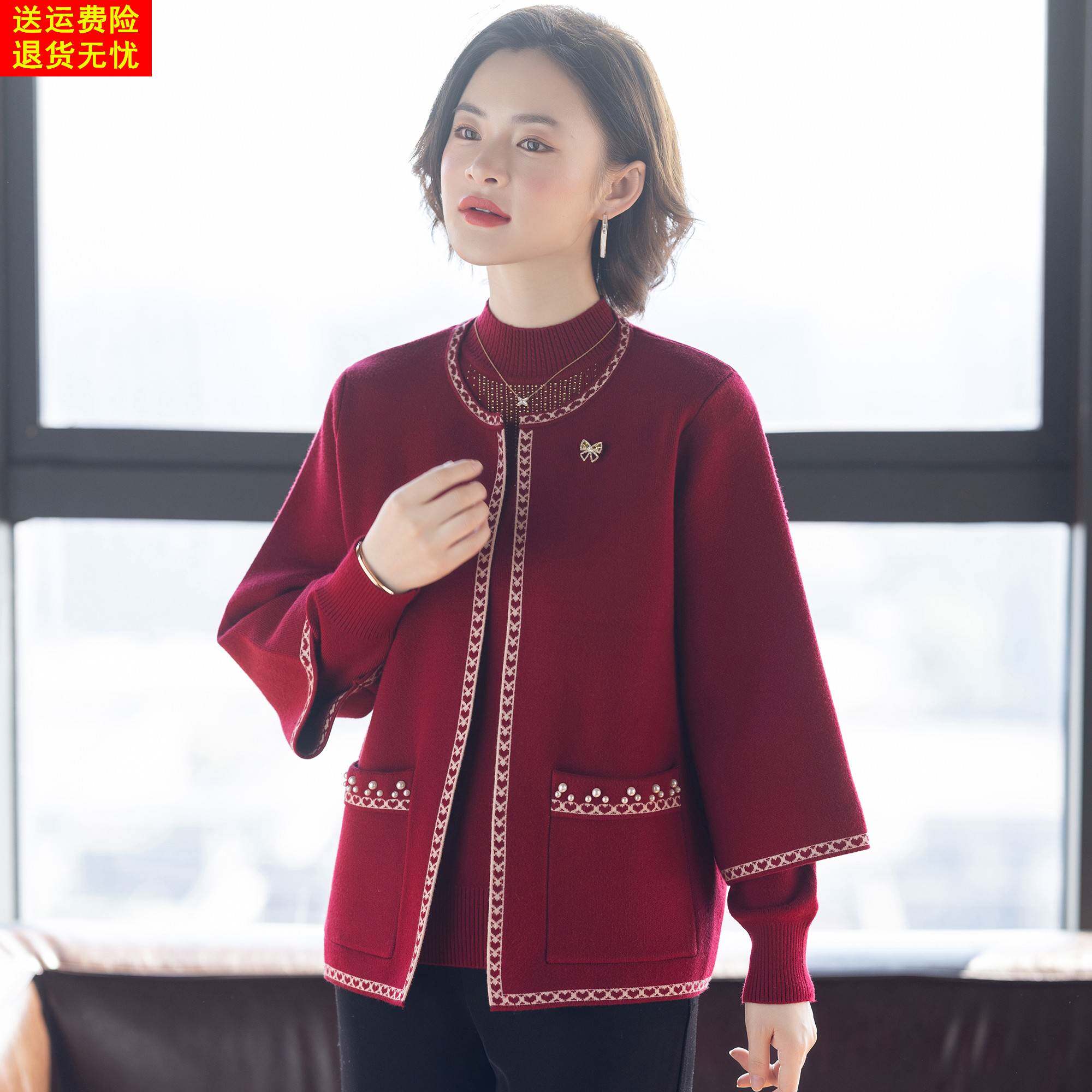 妈妈冬装两件套装毛衣外套2025新款喜婆婆婚宴中老年女红色上衣服