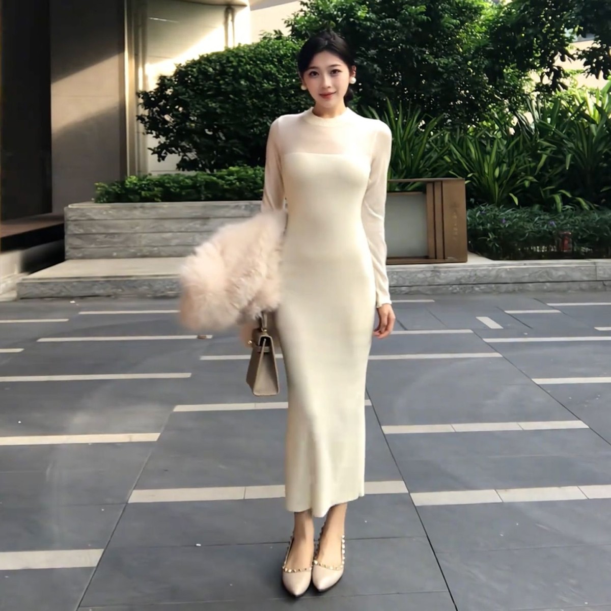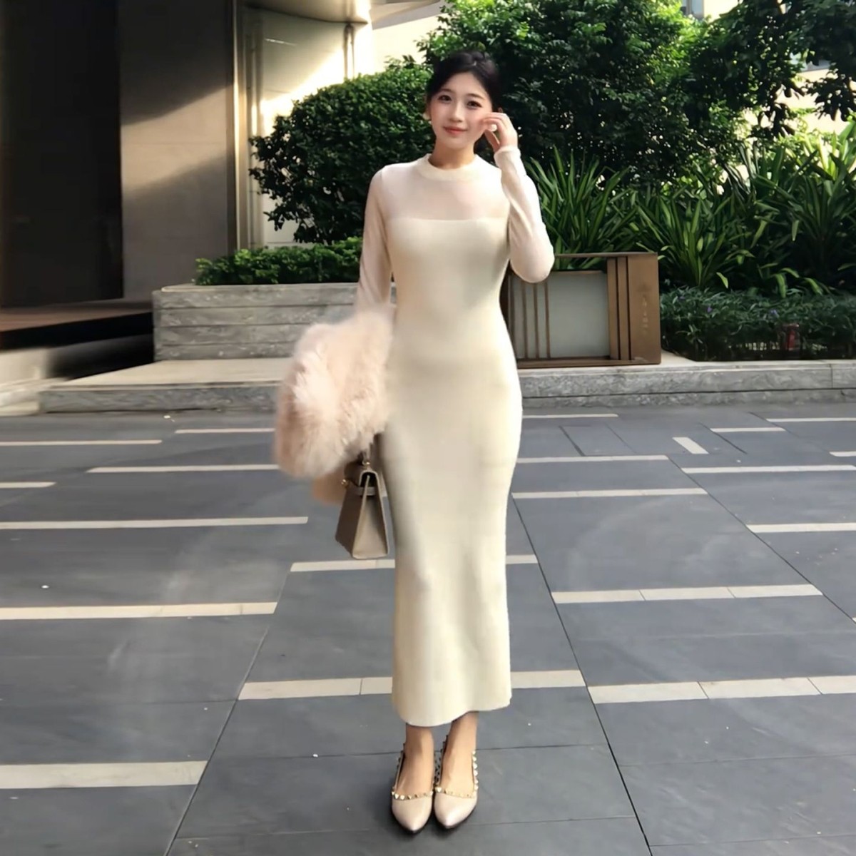 白色圆领长袖连衣裙子女2025秋冬季内搭裙纯欲收腰鱼尾裙包臀长裙
