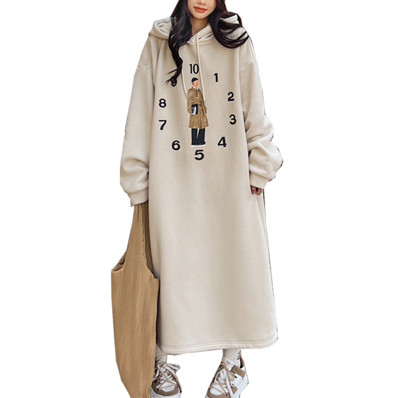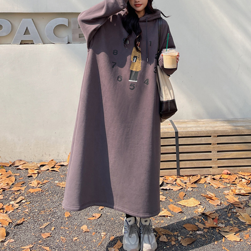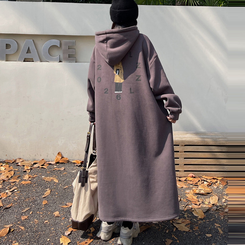 冬天韩版连帽卫衣连衣裙女宽松大码超长款加绒加厚到脚踝过膝长裙