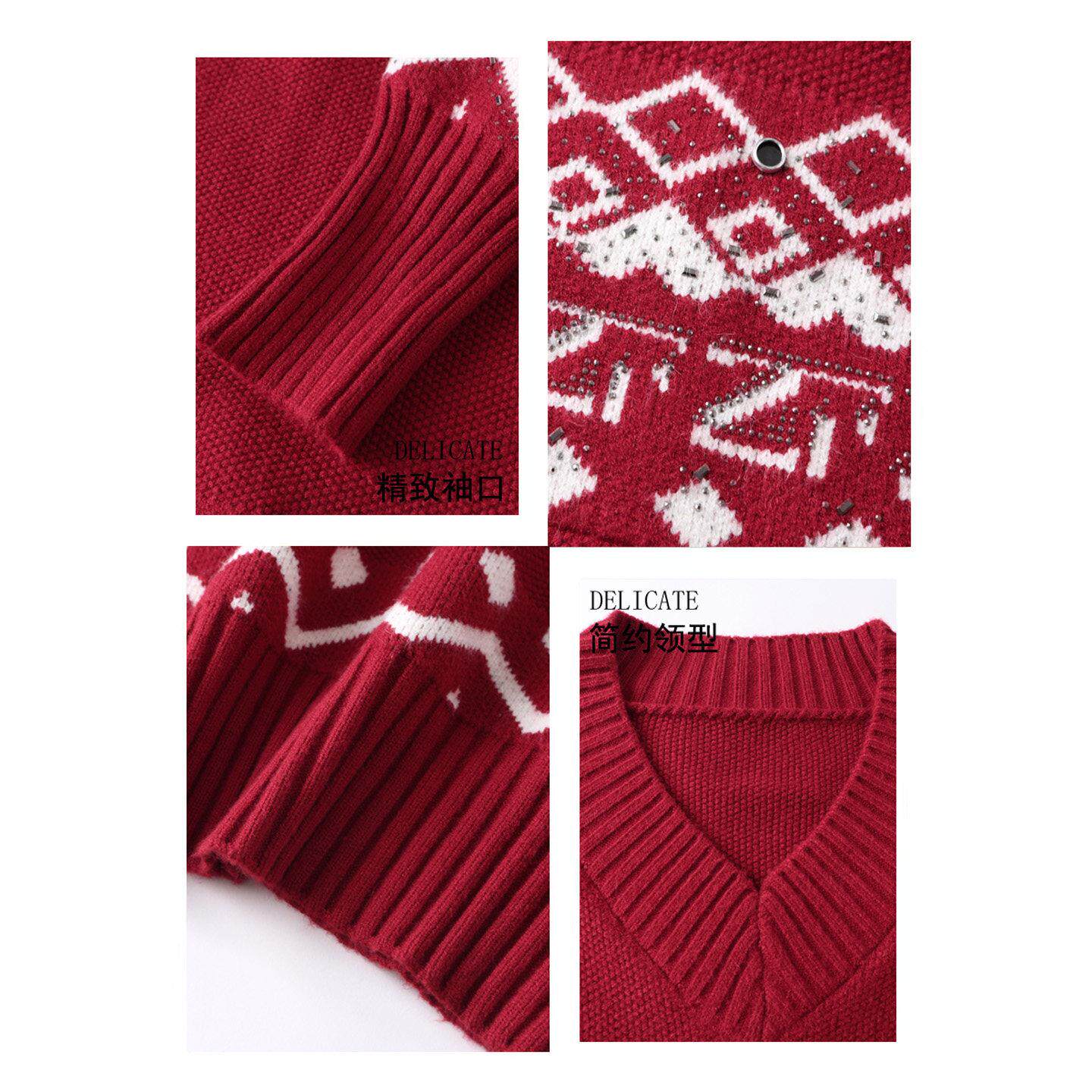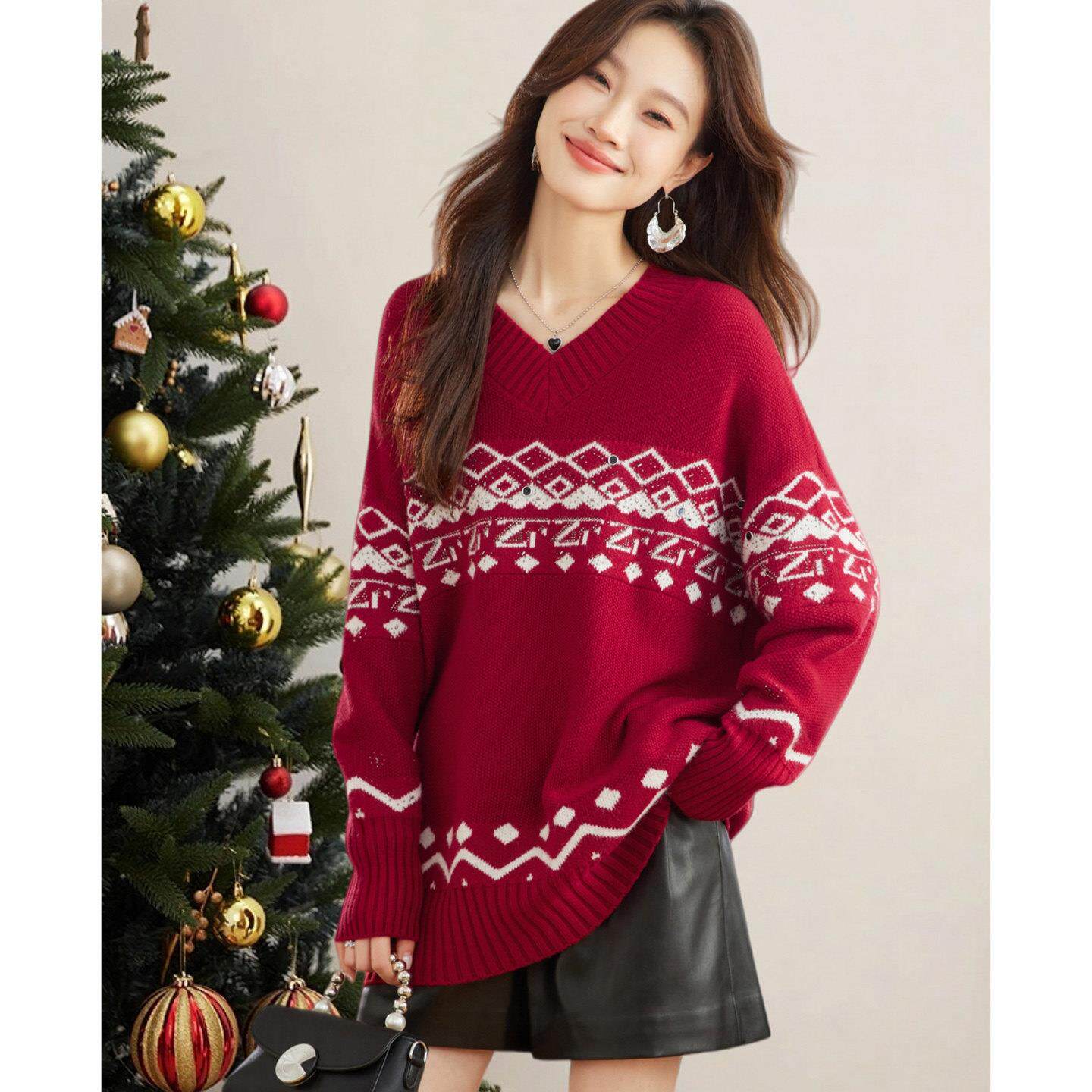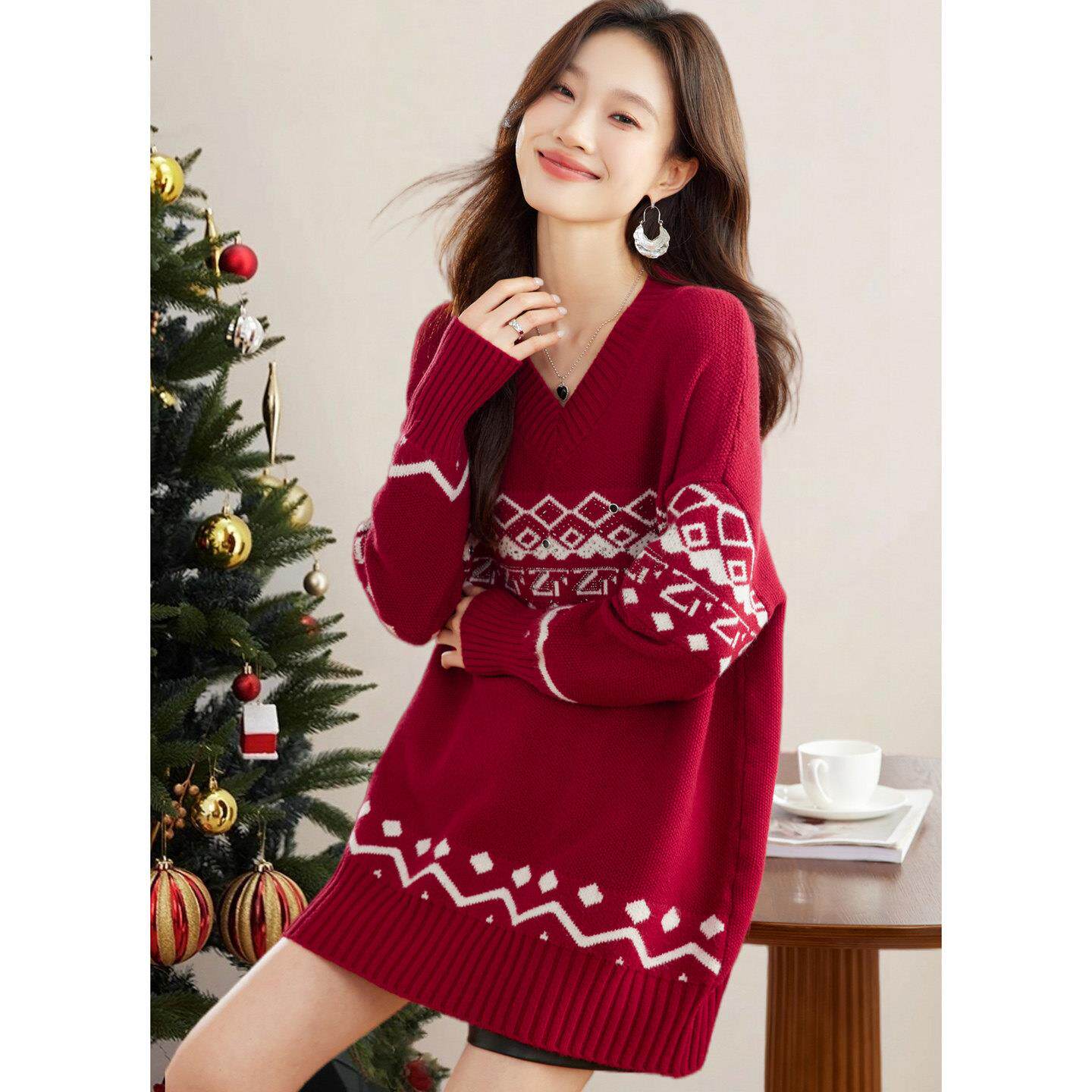 2025冬装新款漂亮提花女神范毛衣圣诞款外穿红色中长款慵懒上衣厚