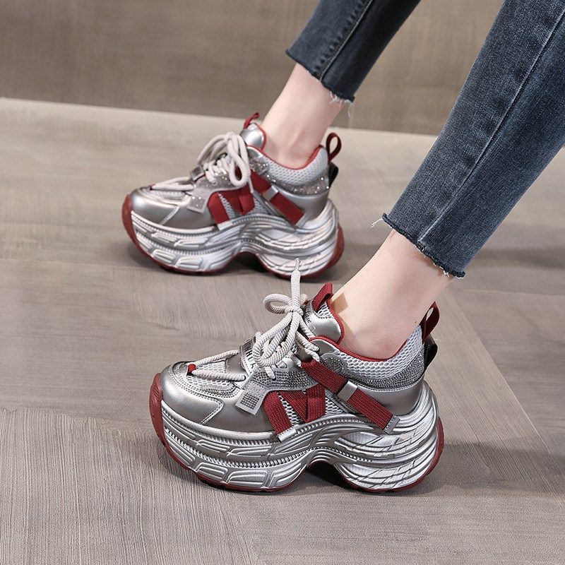 厚底内增高老爹鞋女款真皮2024秋冬季新款8cm百搭银色休闲运动鞋