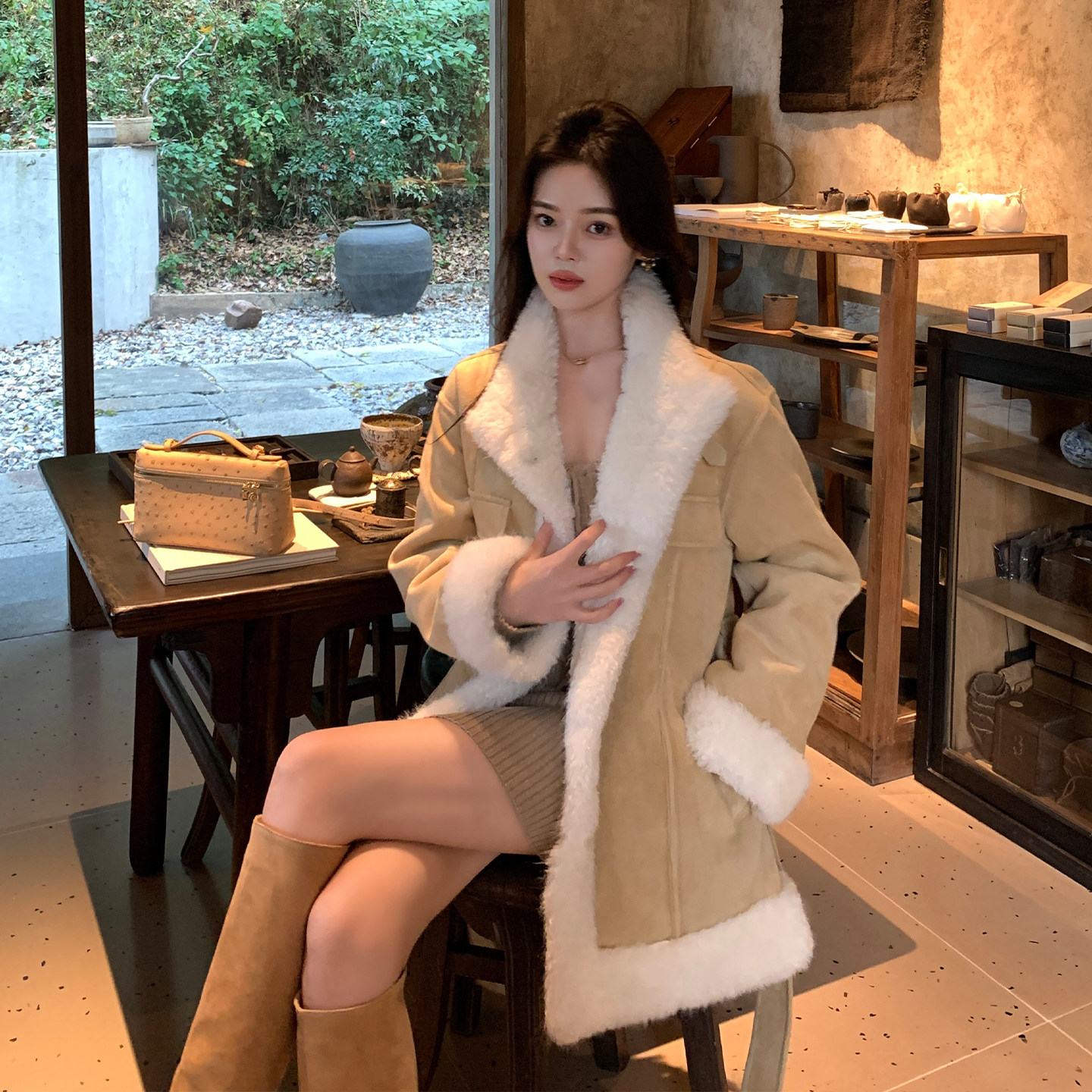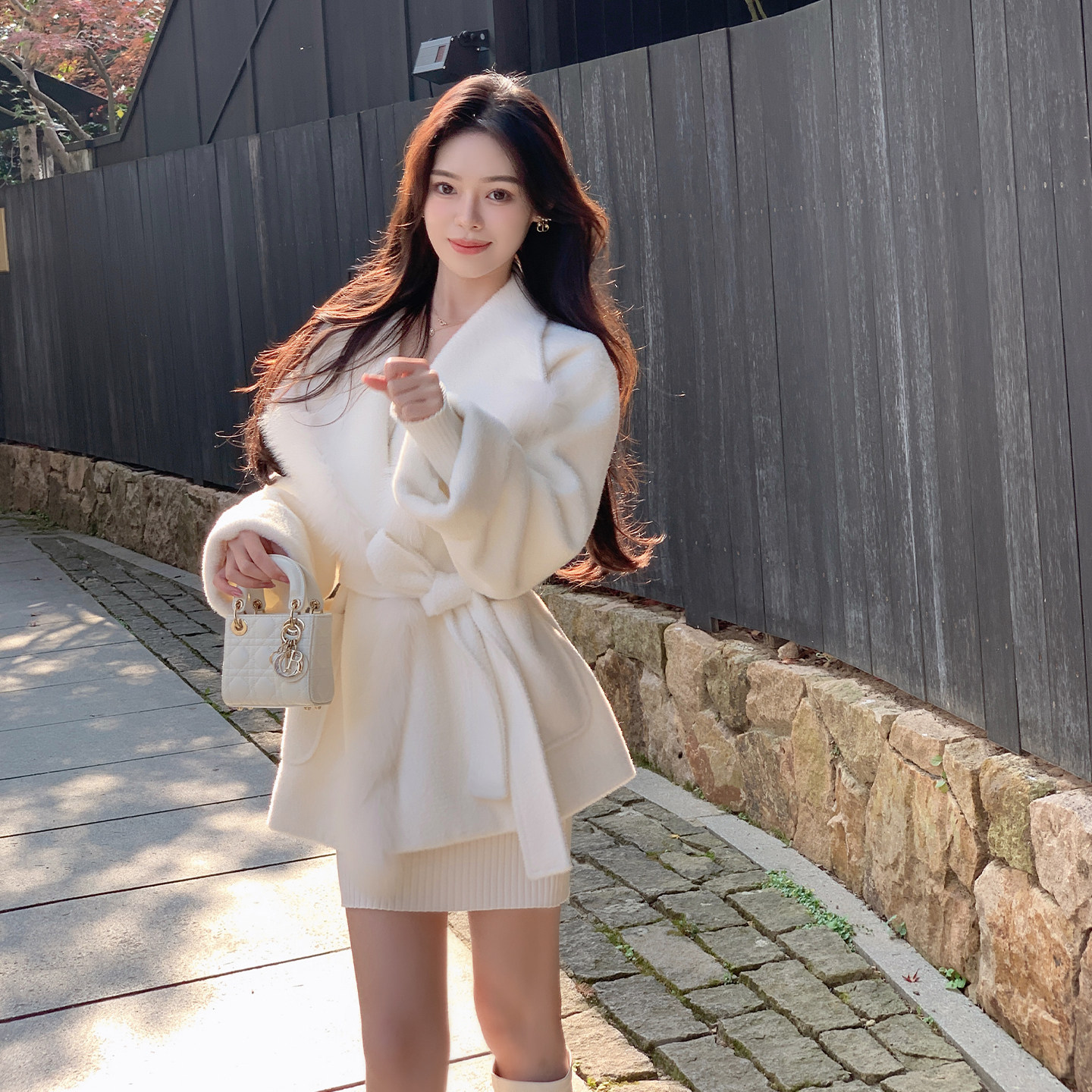 ByYou春季新款白色U领长袖兔绒针织包臀连衣裙短款叠穿内搭打底裙