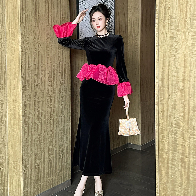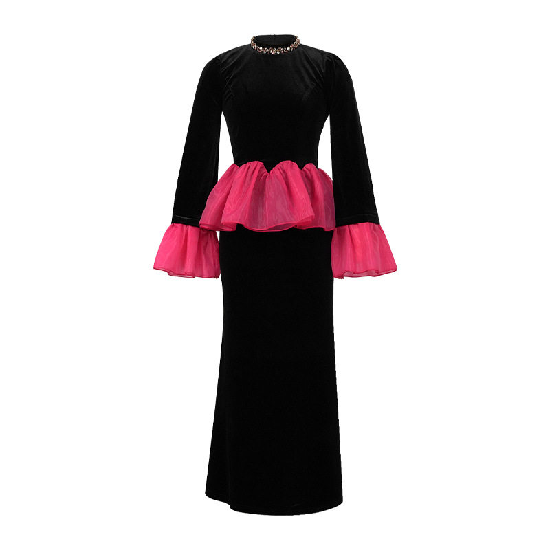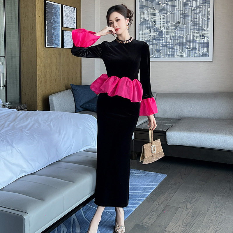 春秋冬装新款女装设计感荷叶边遮腹喇叭袖修身假两件连衣裙21573