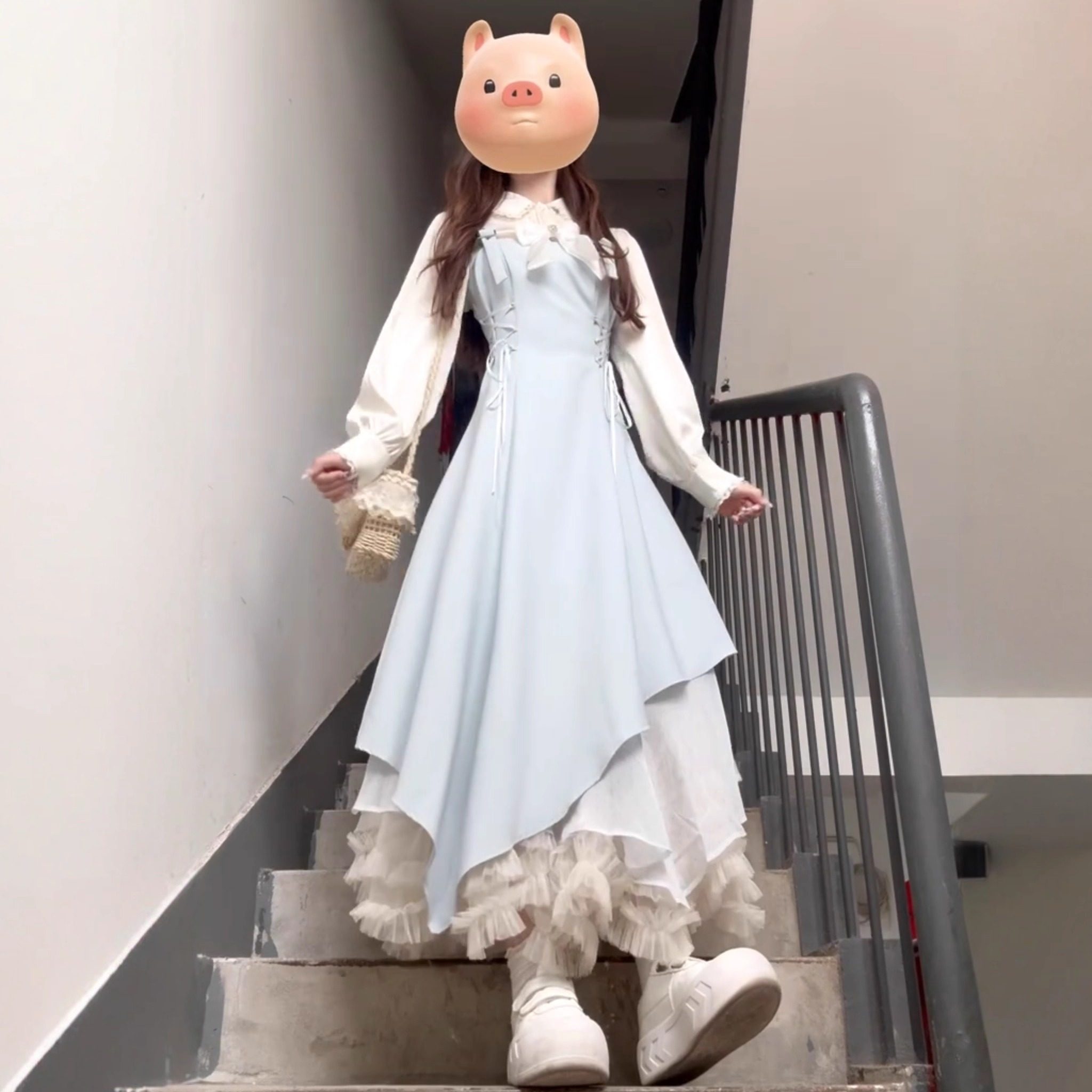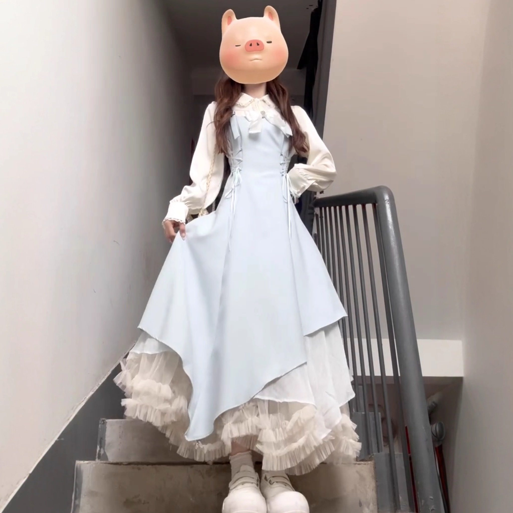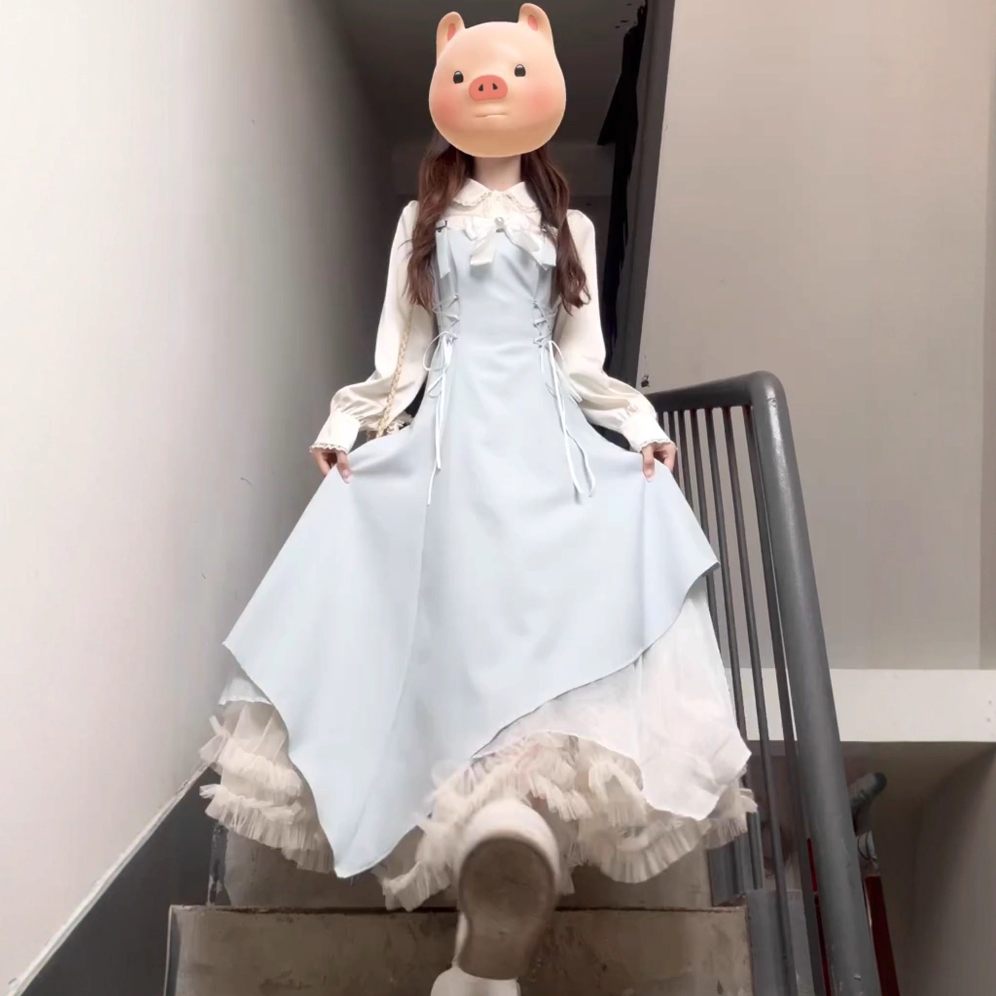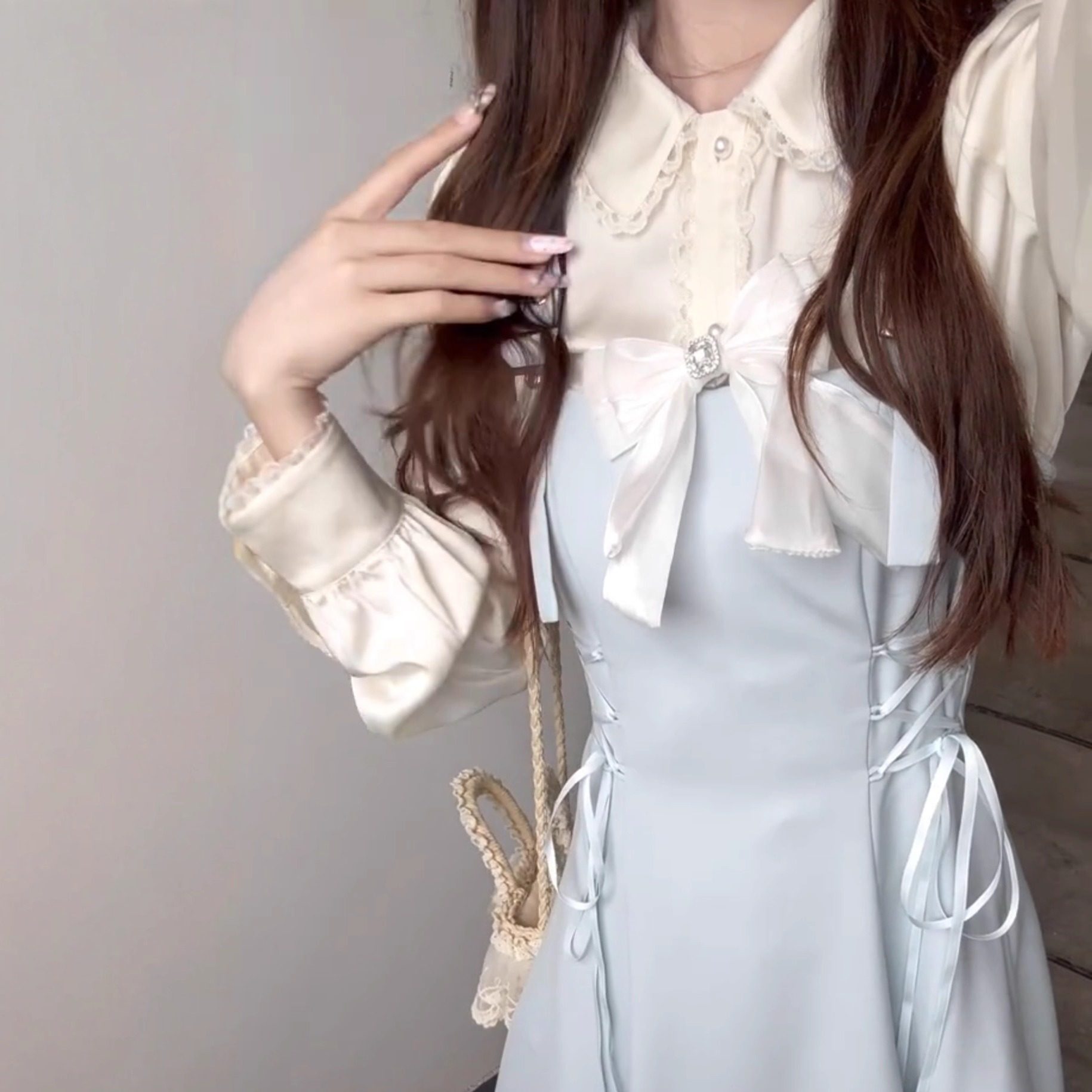 法式浅蓝色连衣裙女冬装2026新款巨好看的裙子套装不规则长裙修身