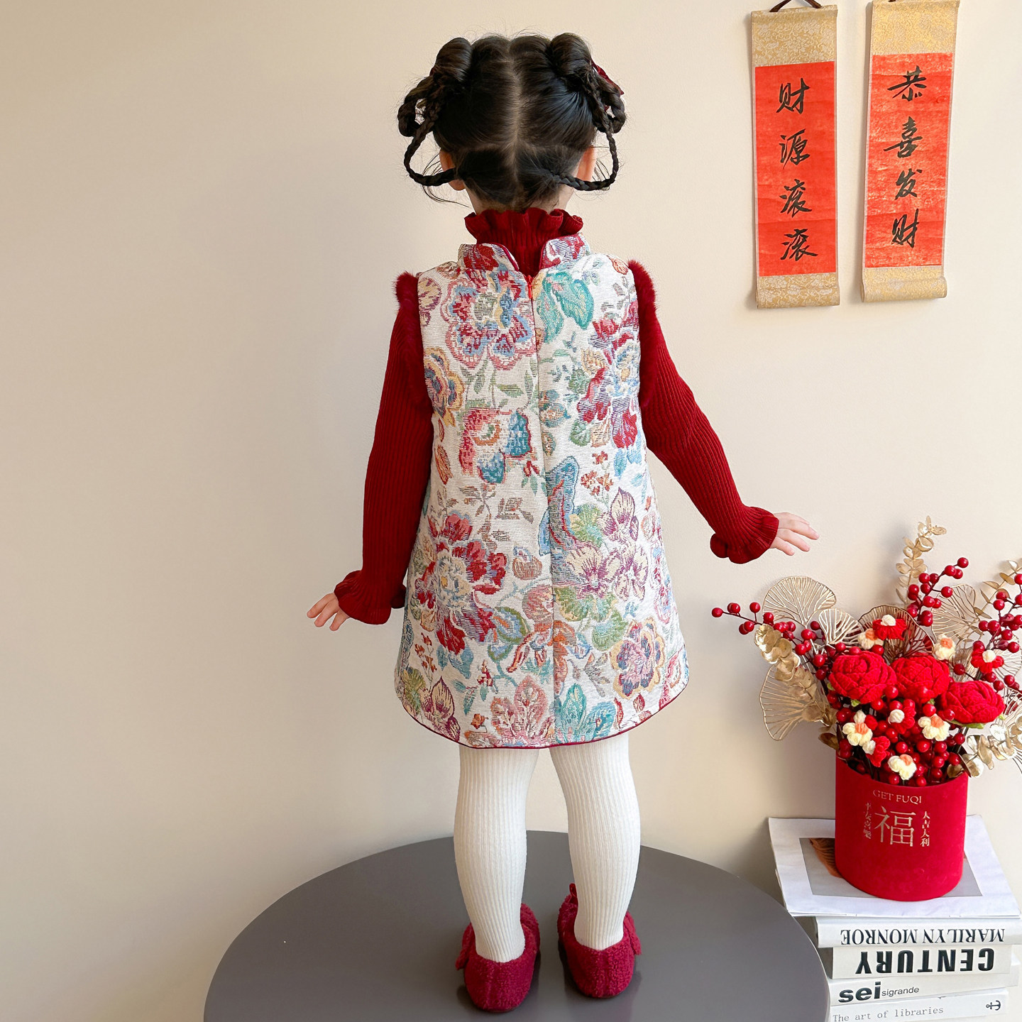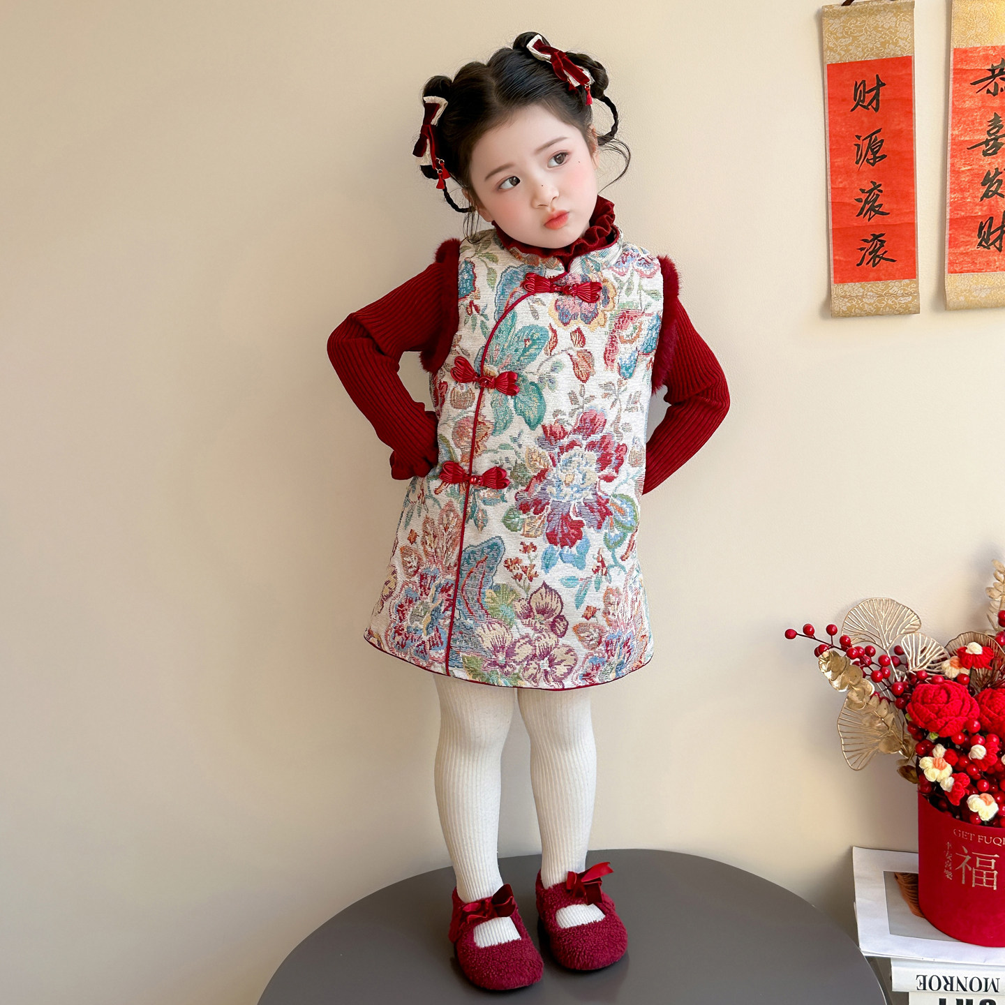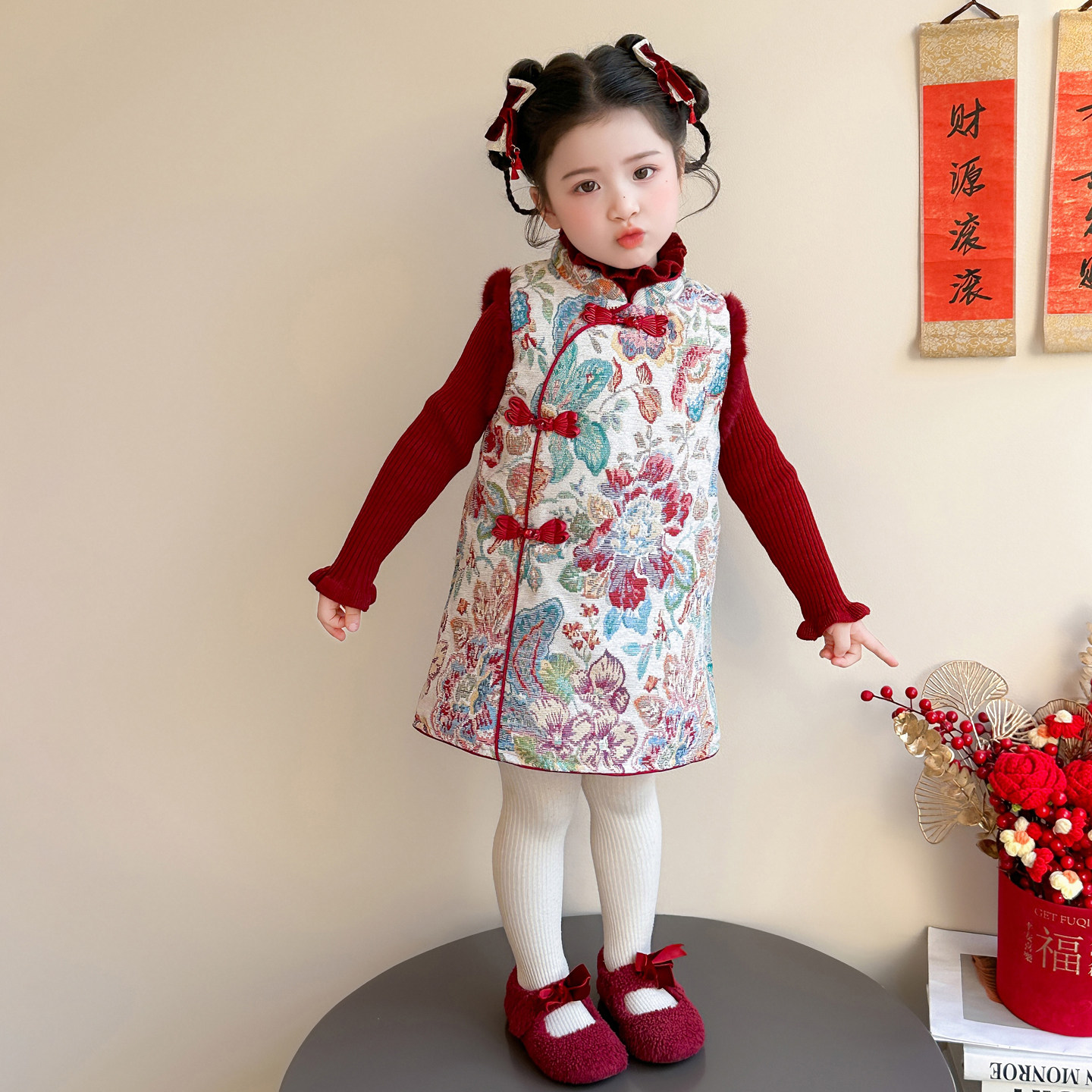 拜年服女童国风旗袍冬装宝宝新年套装连衣裙儿童过年红色喜庆衣服