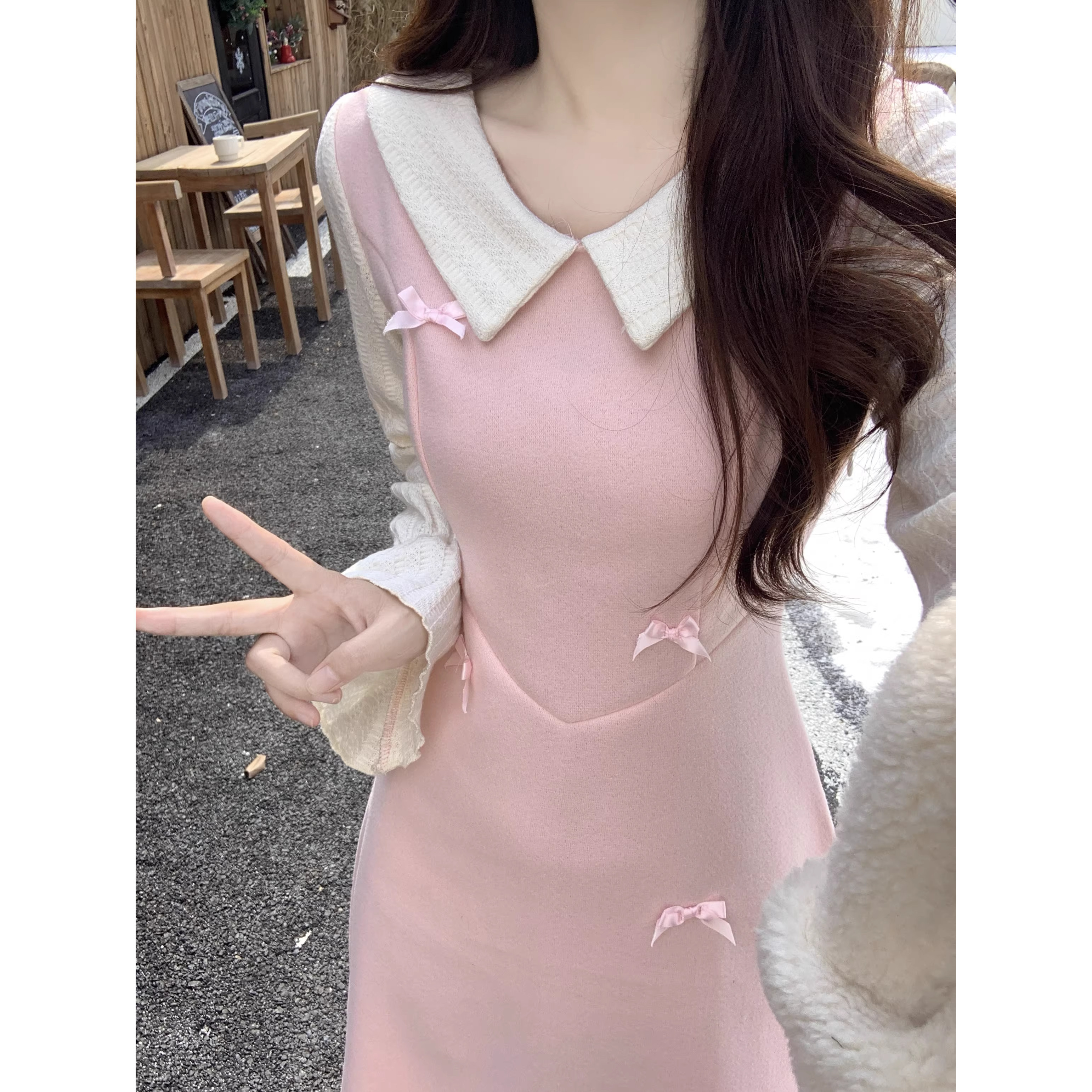 粉色蝴蝶结娃娃领毛呢连衣裙女冬季中长款微胖MM收腰显瘦A字裙子
