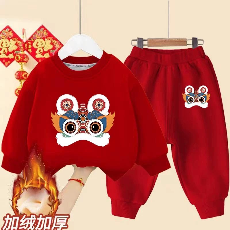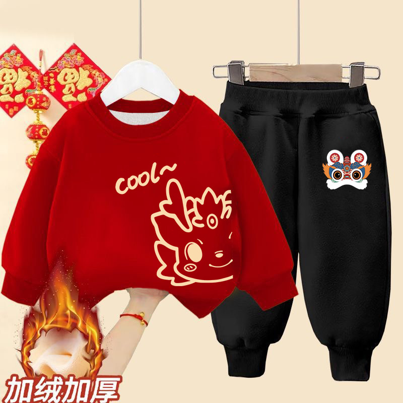 马年2026加绒加厚冬季儿童新年红色过年卫衣男童女童喜庆两件套装