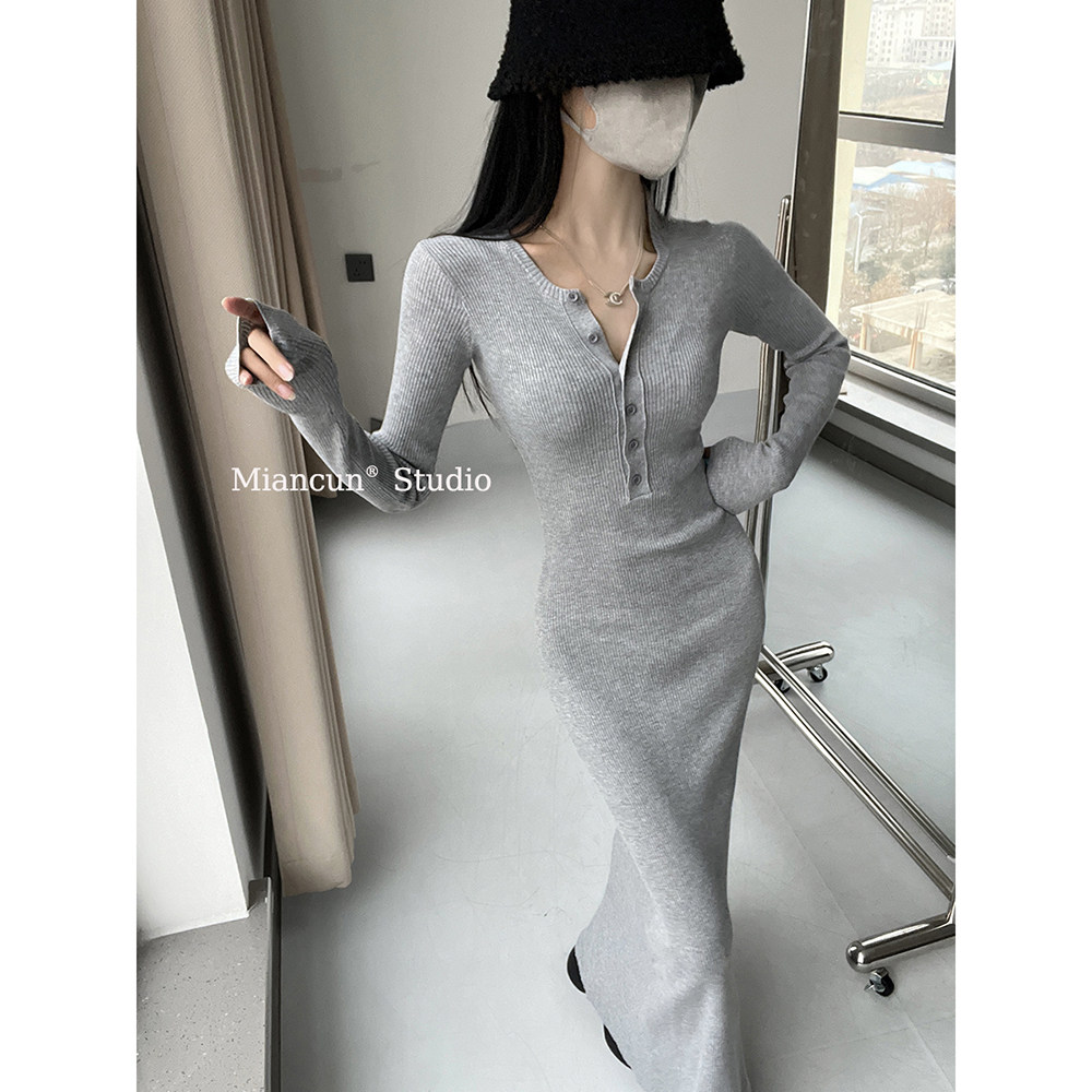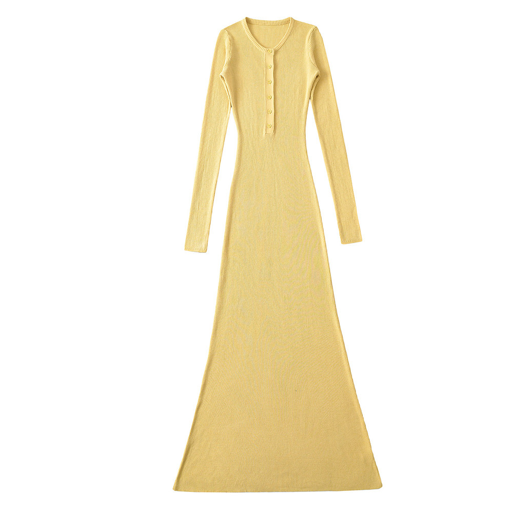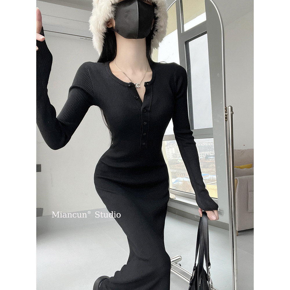 性感排扣设计长袖针织连衣裙女春季新款收腰显瘦内搭修身长款裙子