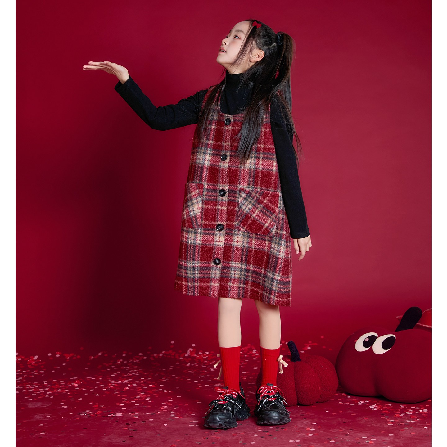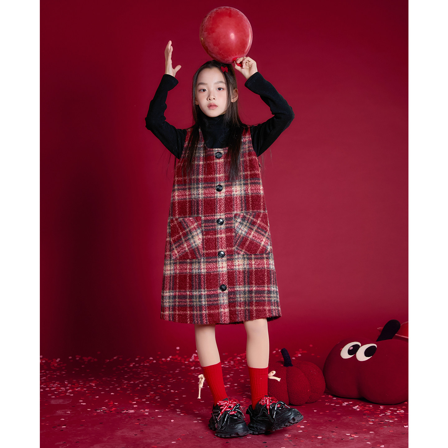 女童连衣裙三件套新年装2026新款儿童洋气时髦红格子喜庆拜年套装