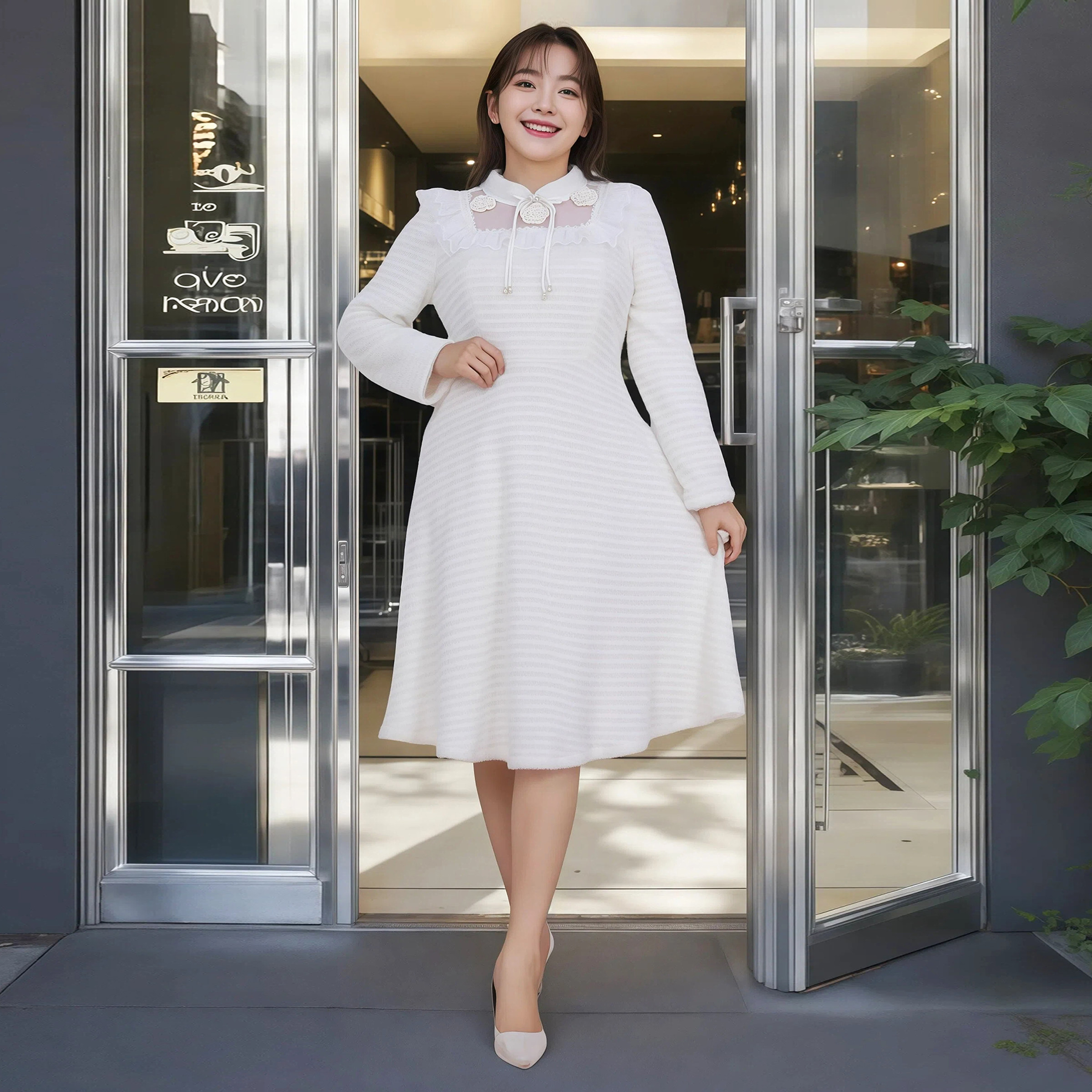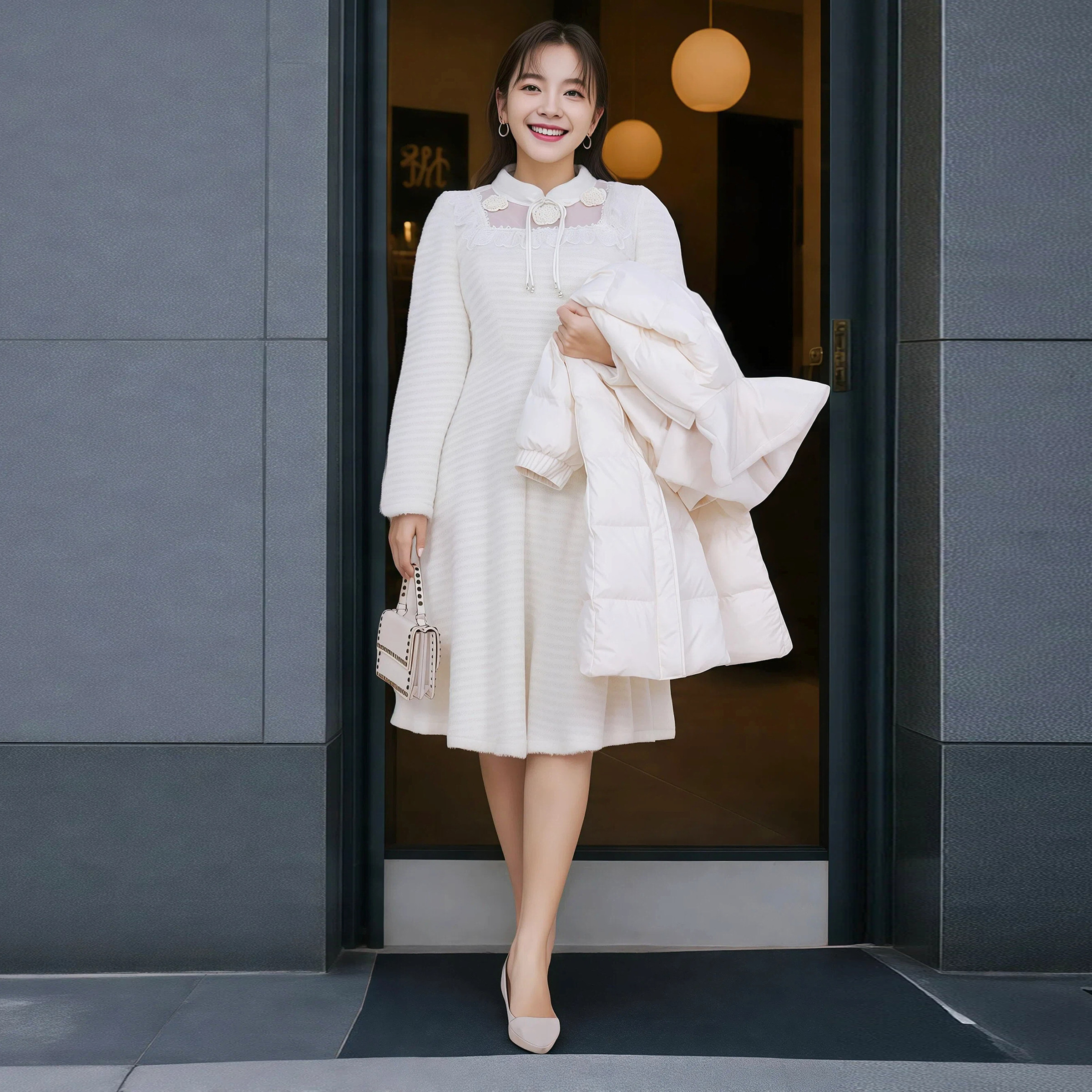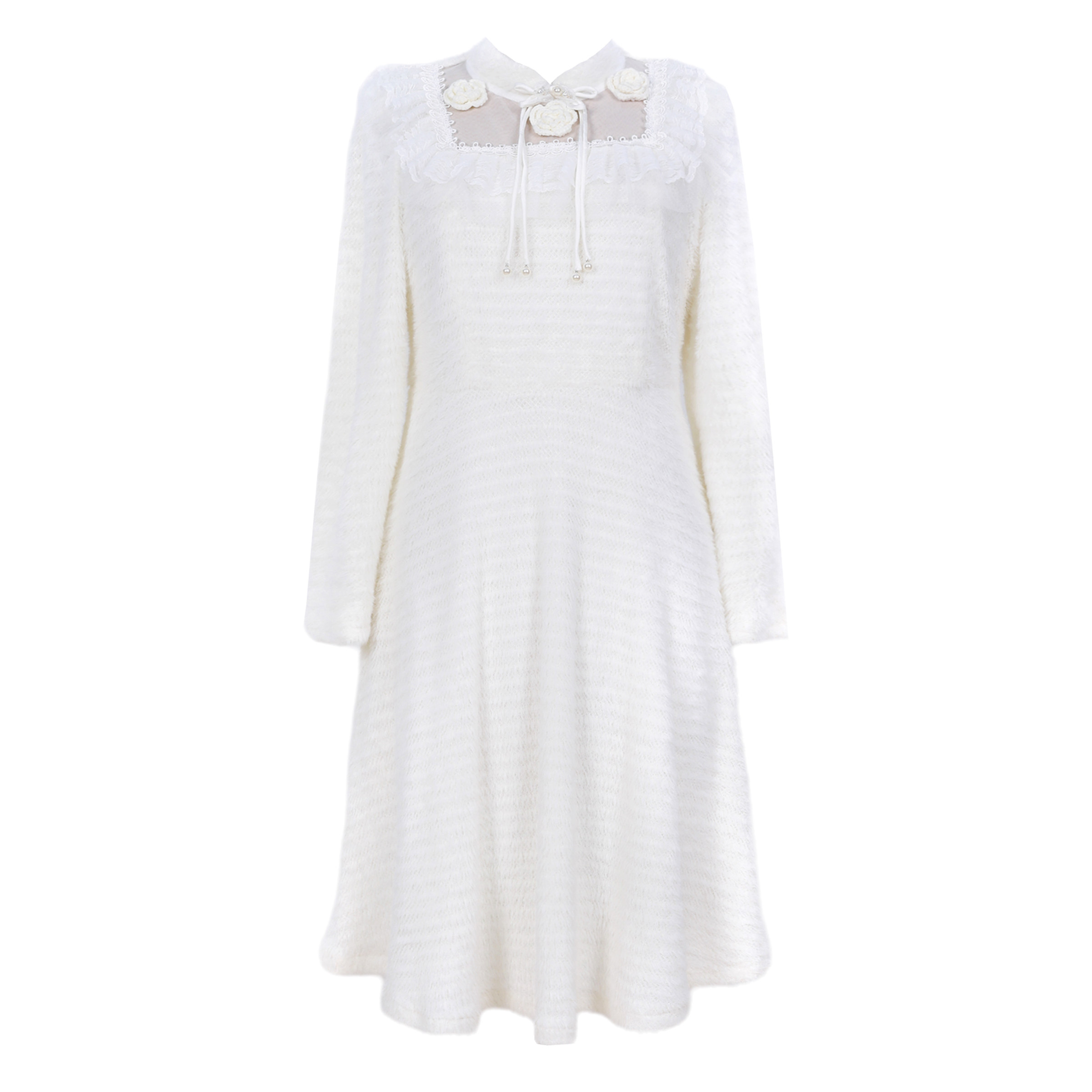 高端大码女装胖MM冬季精致绒毛蕾丝中长款连衣裙百搭显瘦温柔打底