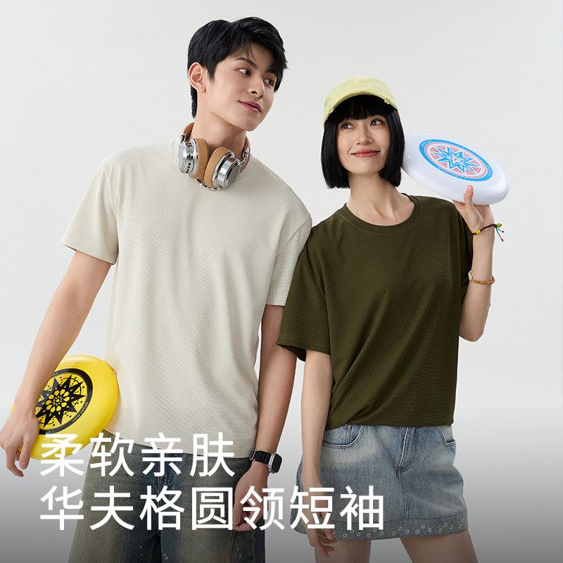 班尼路华夫格圆领短袖t恤男春夏新款杏色简约半袖上衣大学生体恤A
