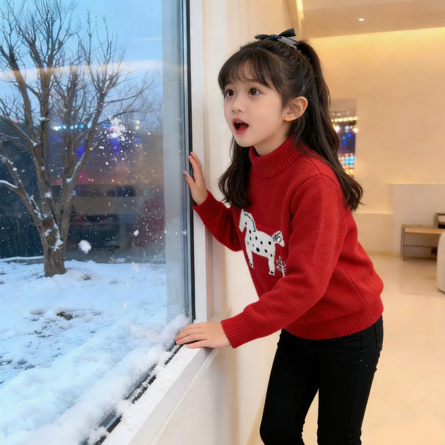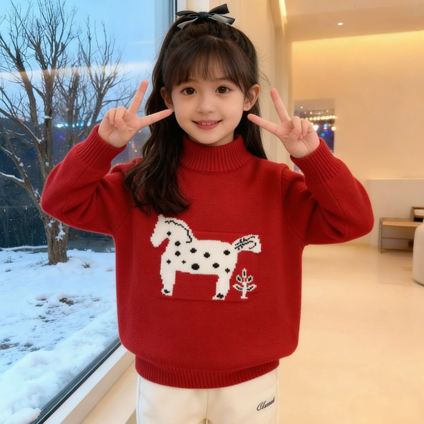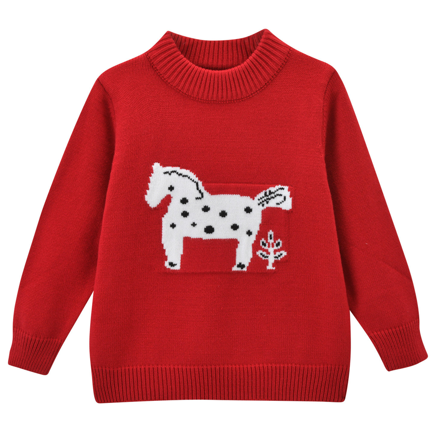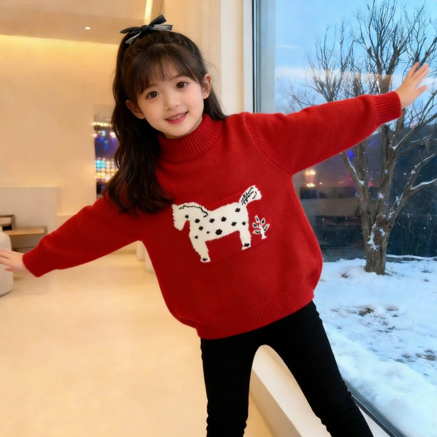 女童马年红色过年毛衣2026新款冬季儿童小马提花针织衫拜年服童装
