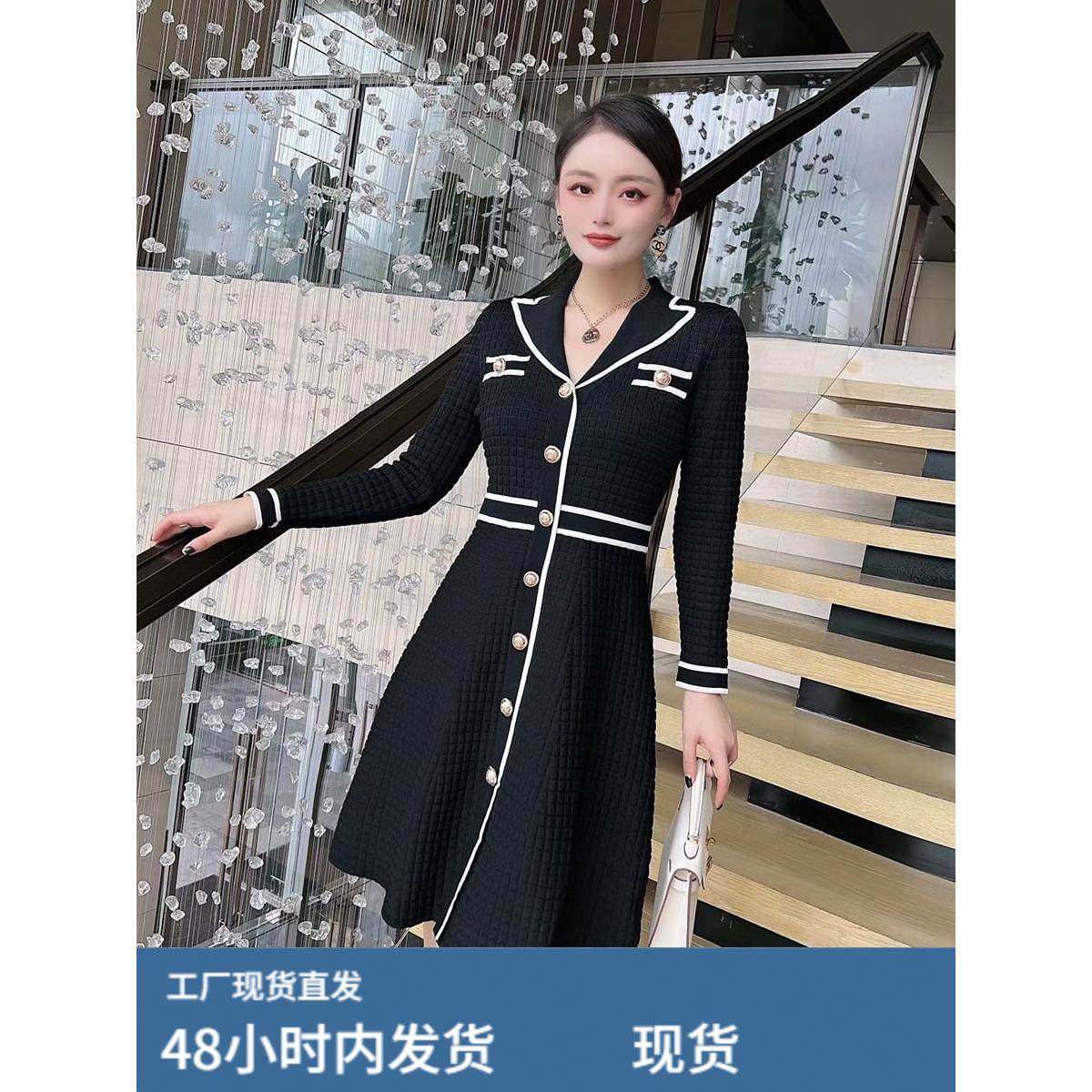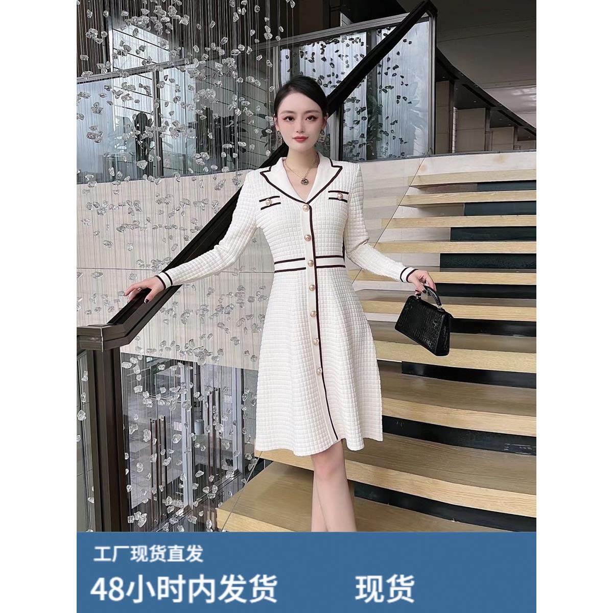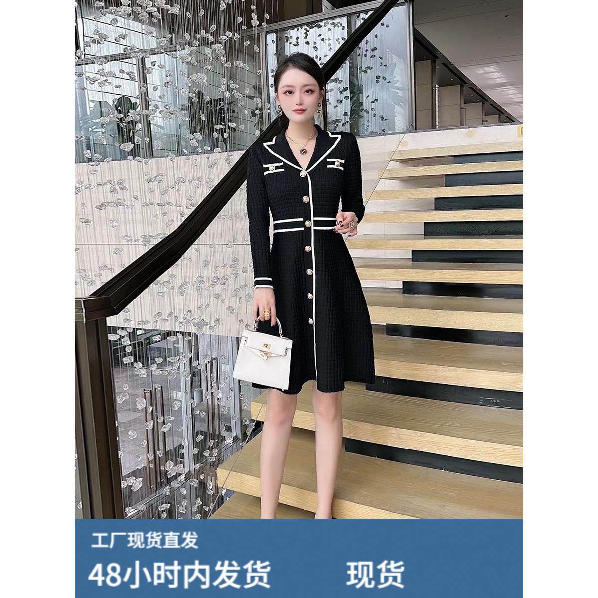 高级感小香风秋冬季西装领长袖针织连衣裙收腰A字裙通勤气质毛衣