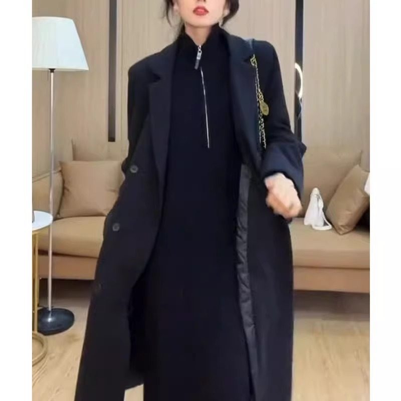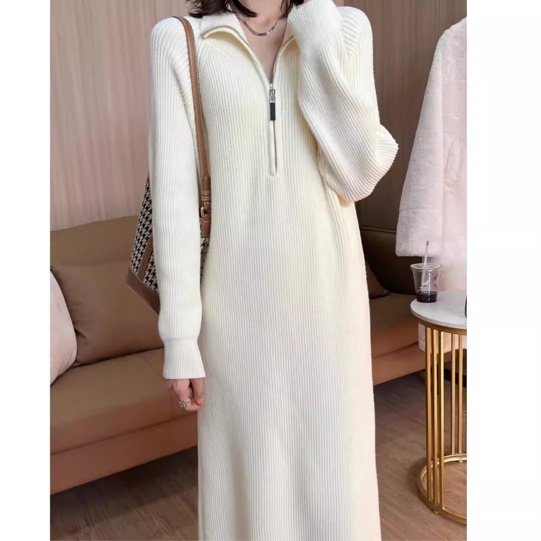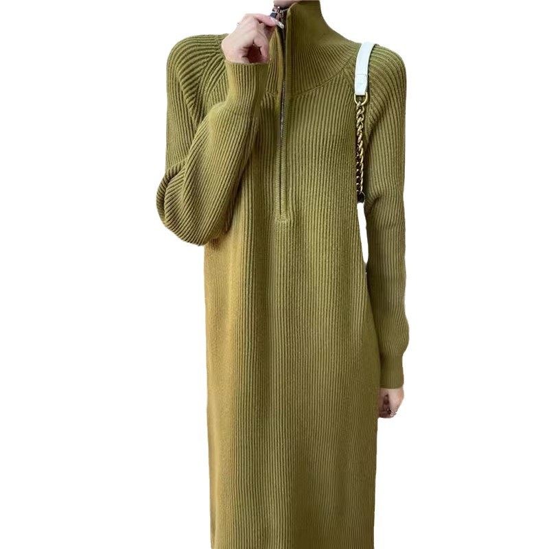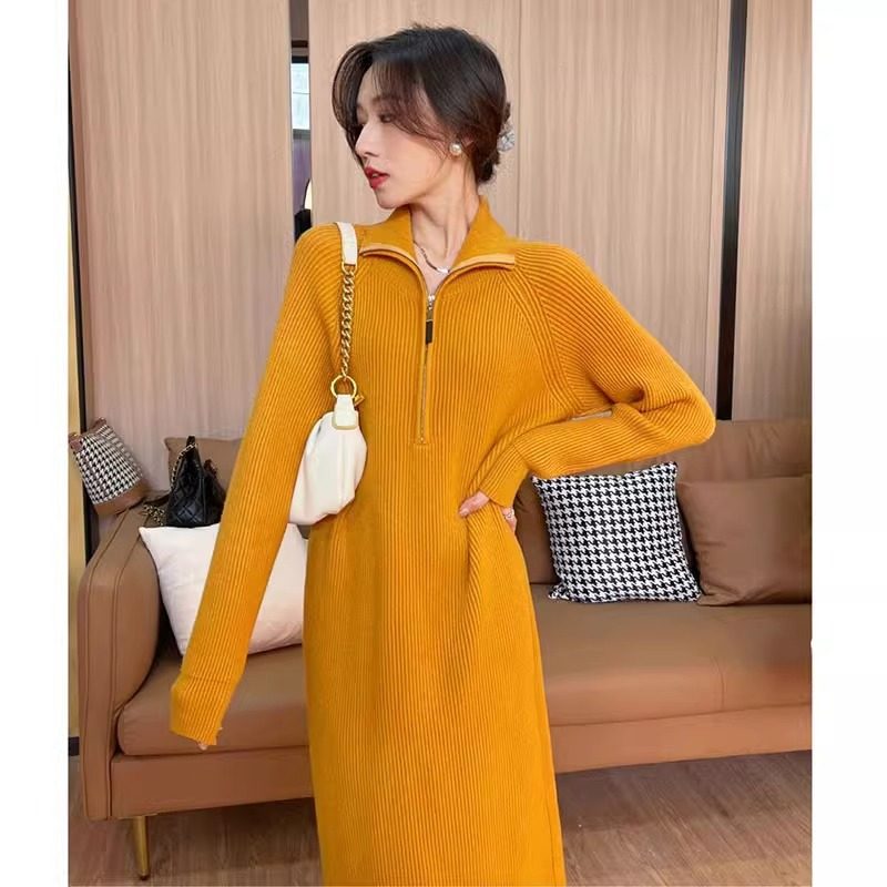 秋冬季法式中长款毛衣裙翻领拉链内搭针织卫衣连衣裙女配大衣打底