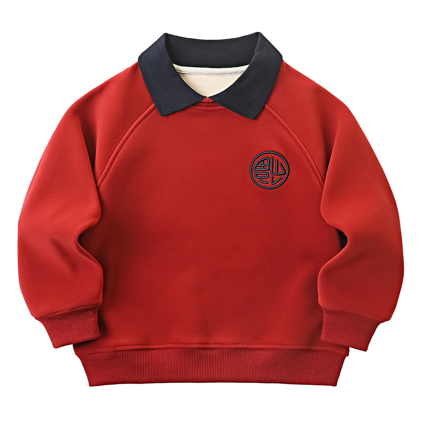 男童加绒卫衣冬装2026马年新年款儿童红色翻领上衣中大童拜年服潮